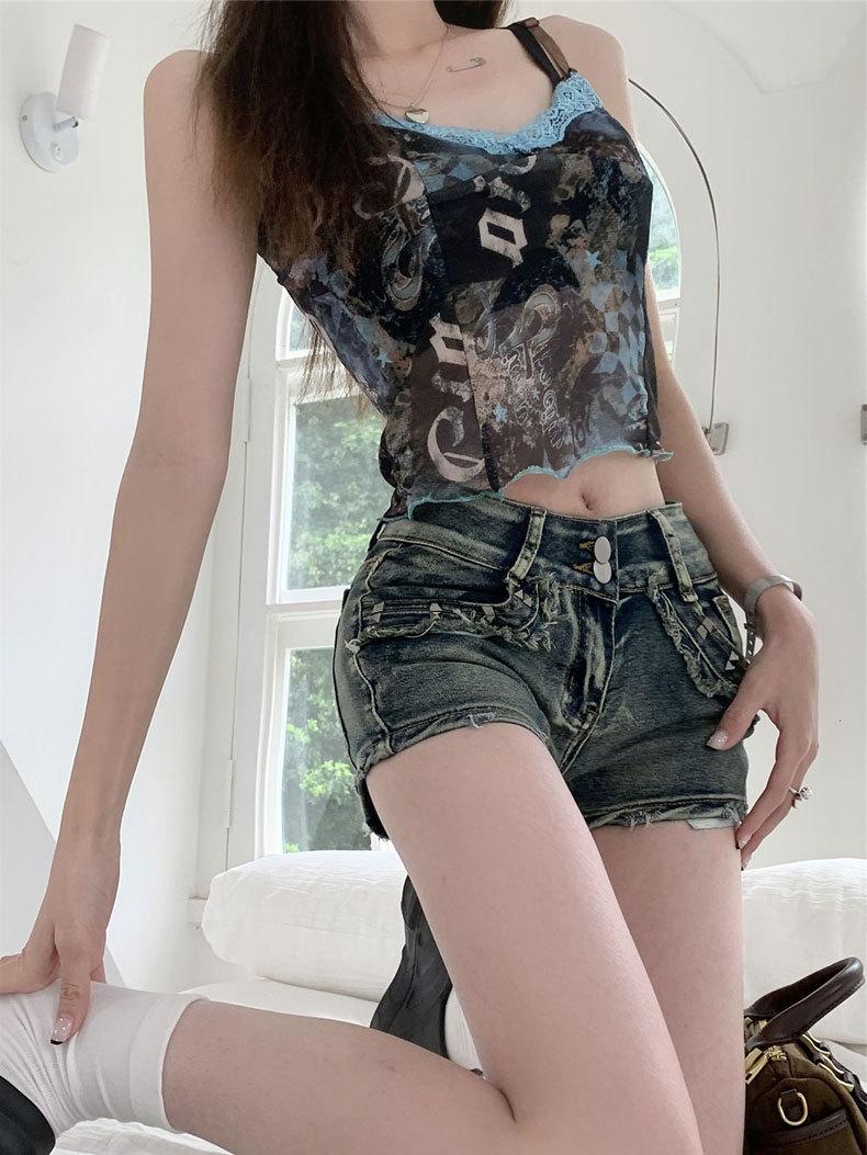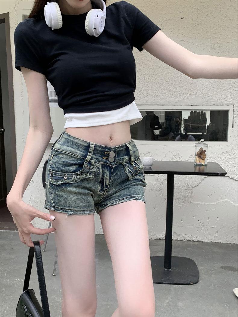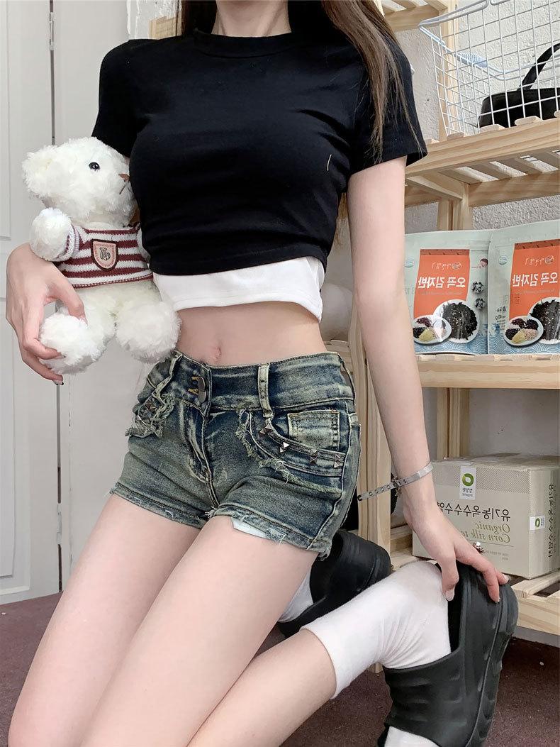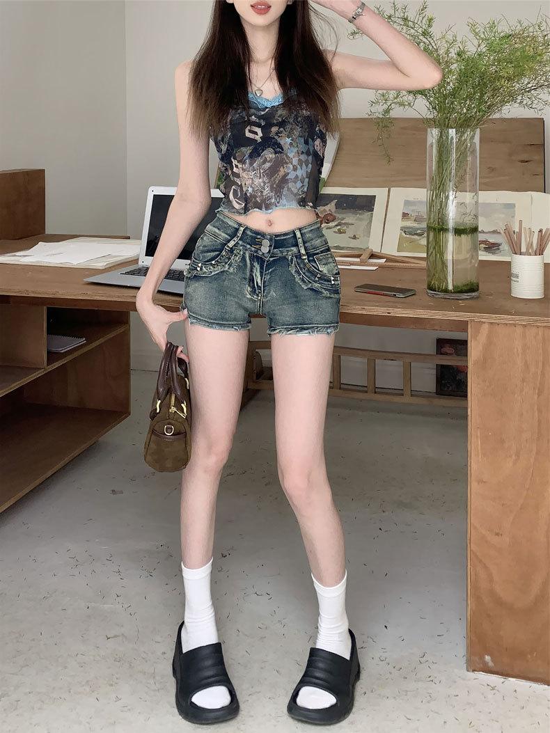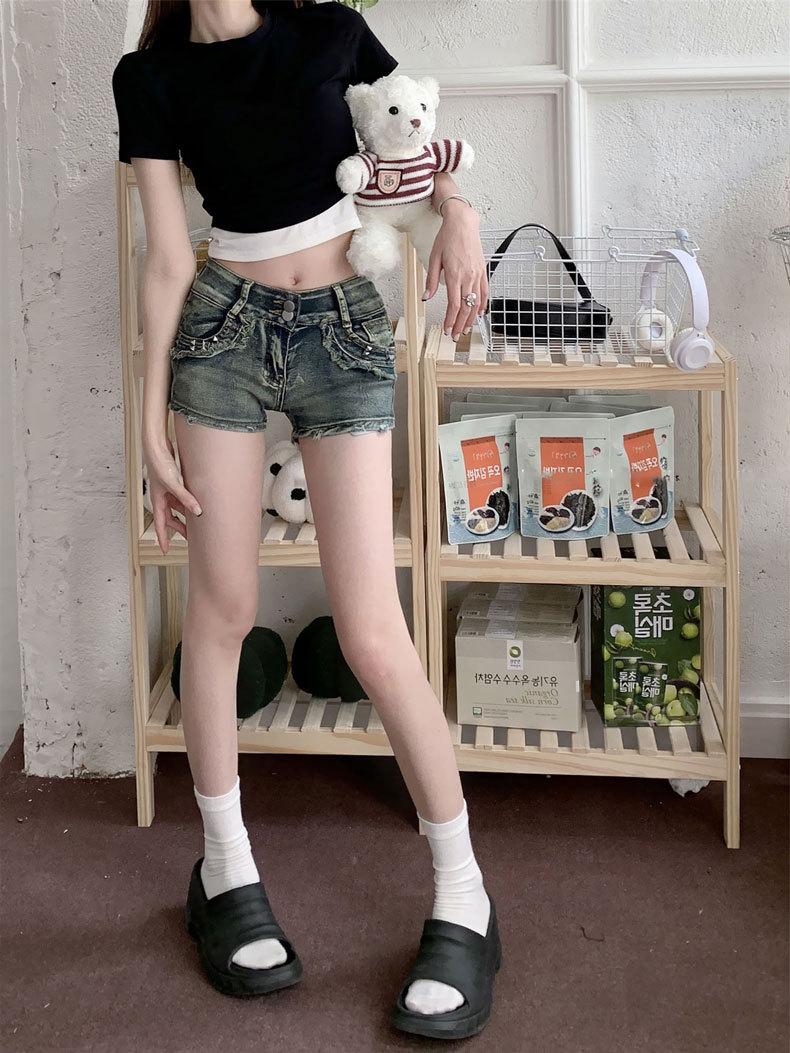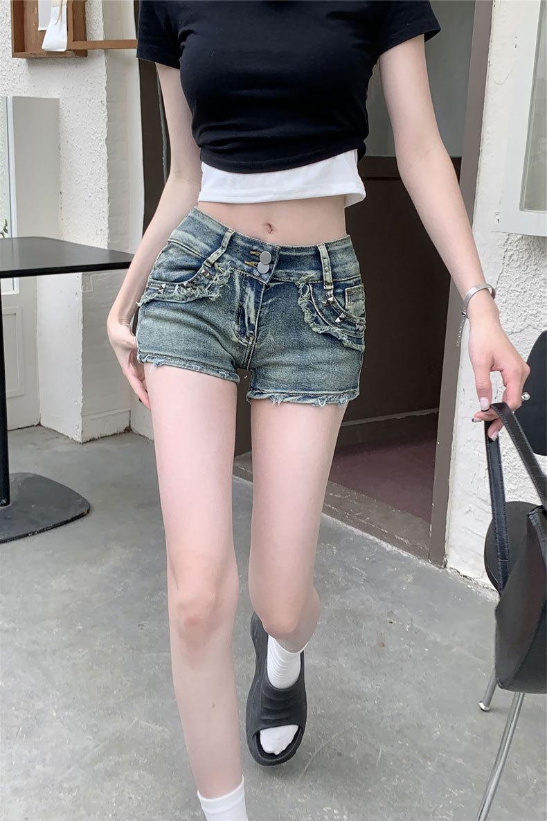Pantalones cortos vaqueros con diseño de remaches para mujer, estilo americano, nuevos, de cintura baja, elásticos, ajustados, retro, rectos, a la cadera