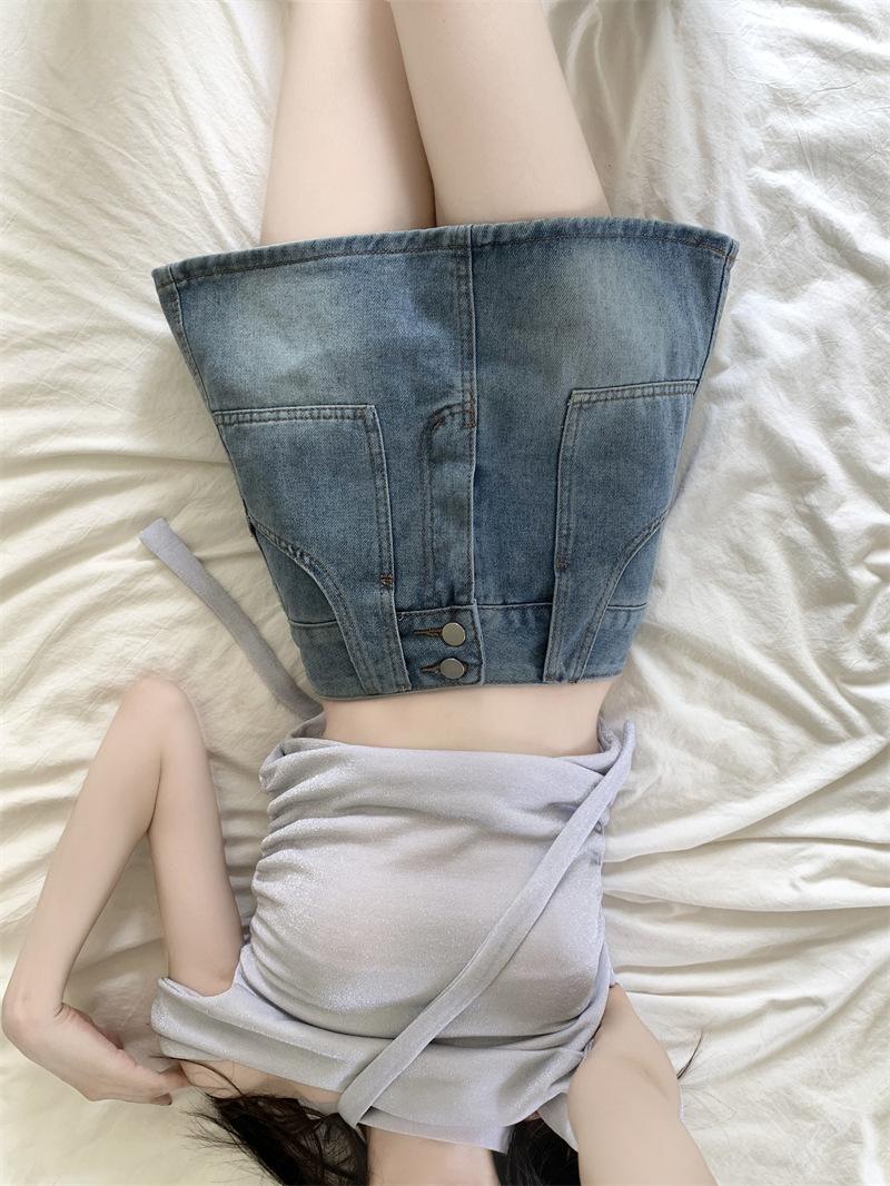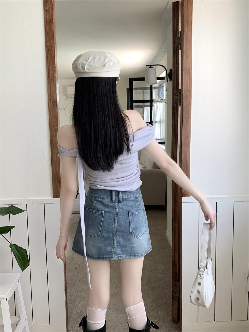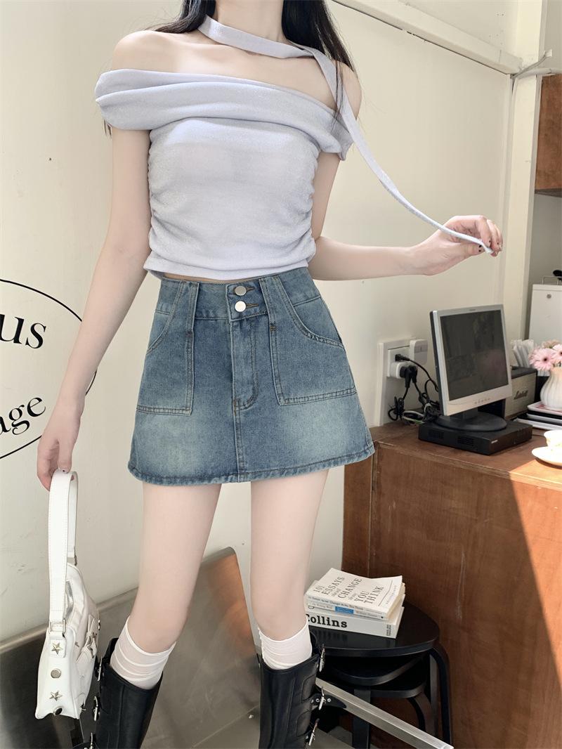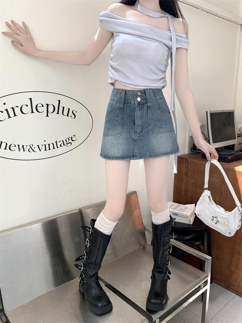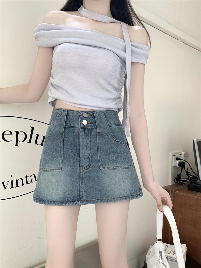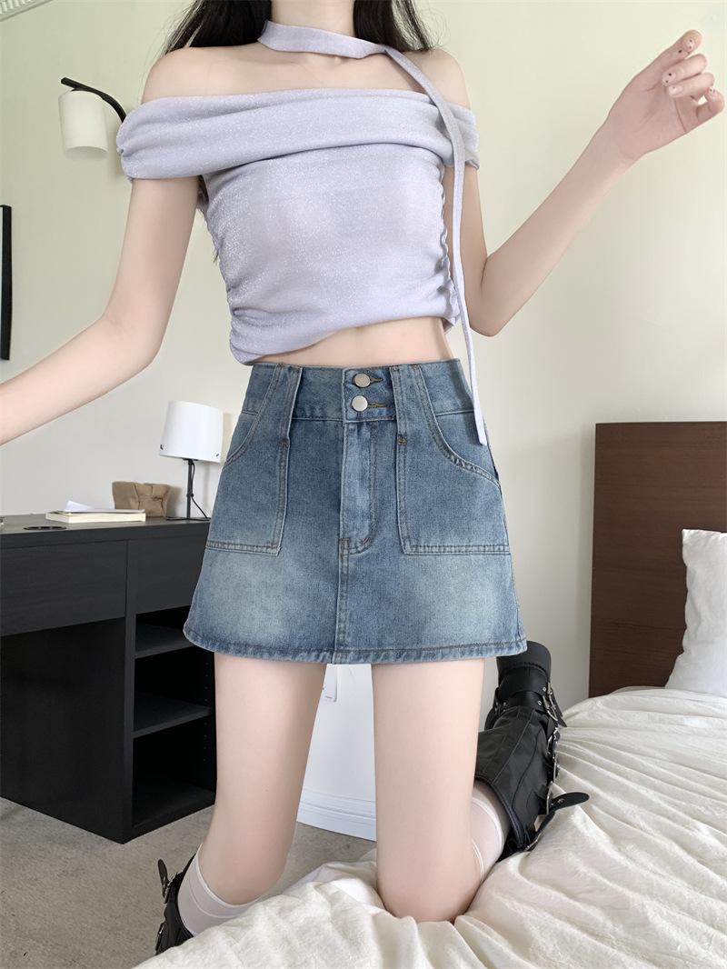 Falda vaquera de media longitud con doble hebilla y nicho para mujer, nueva moda, antibrillo, cintura alta, corte A, estilo retro, corta, pantalones