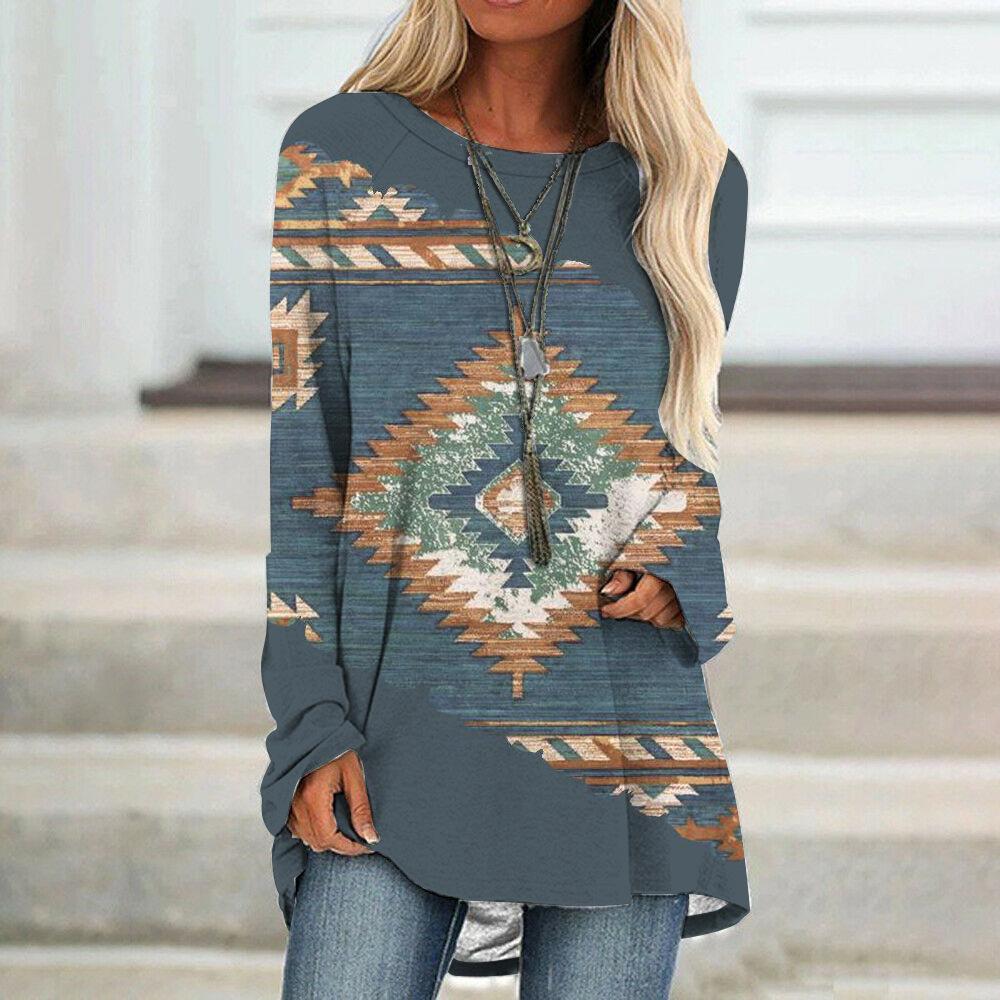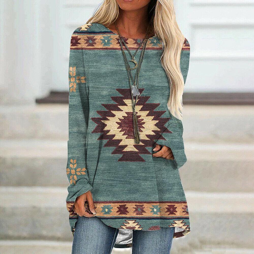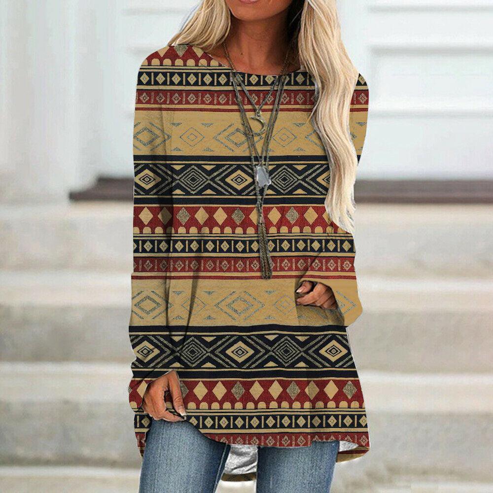 Camiseta de manga larga para mujer, estilo étnico europeo y americano, con cuello redondo, informal, estampado, primavera y otoño de 2021