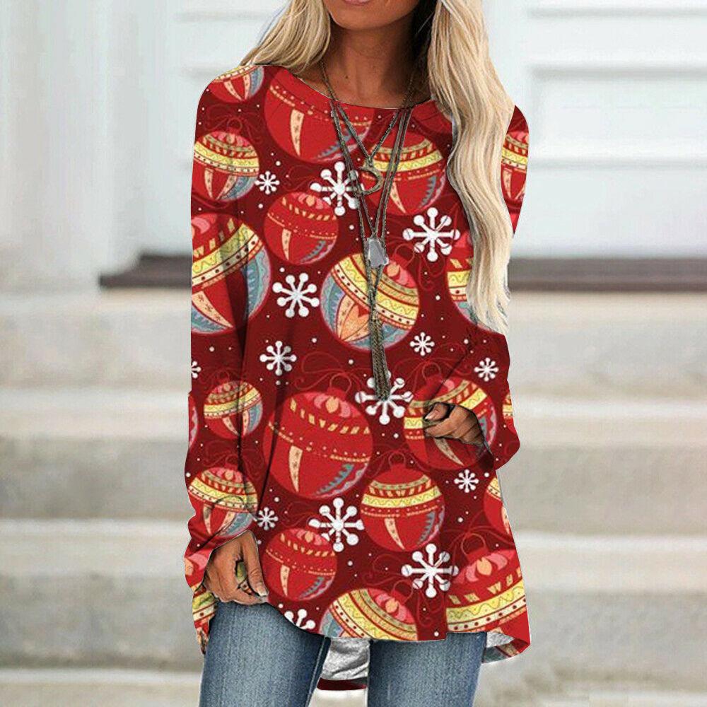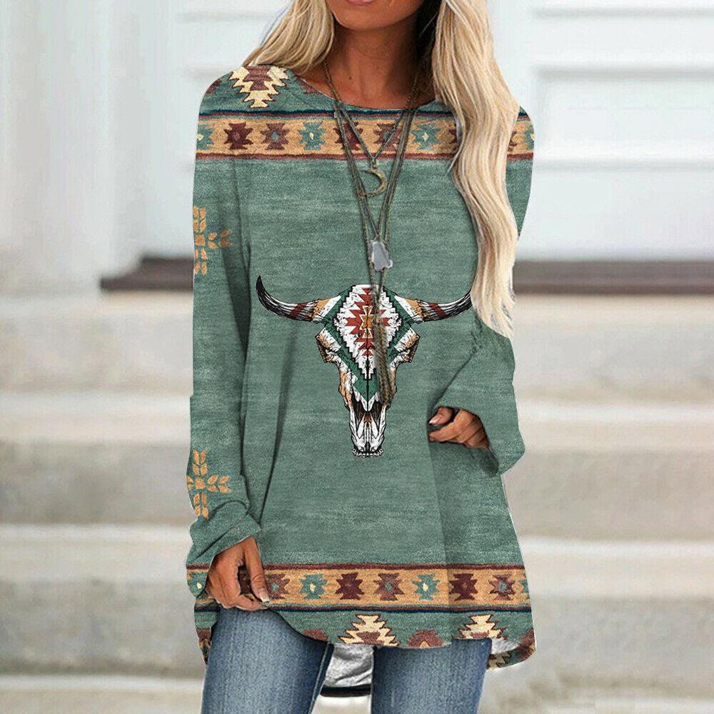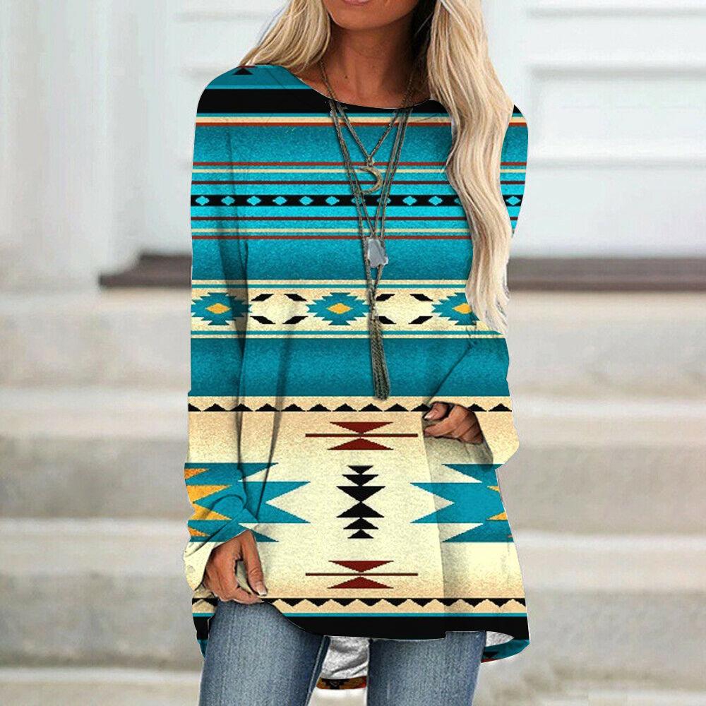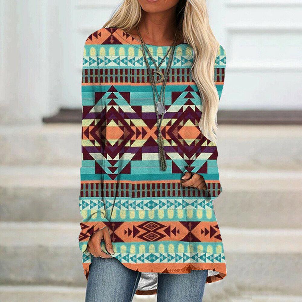 Camiseta de manga larga para mujer, estilo étnico europeo y americano, con cuello redondo, informal, estampado, primavera y otoño de 2021