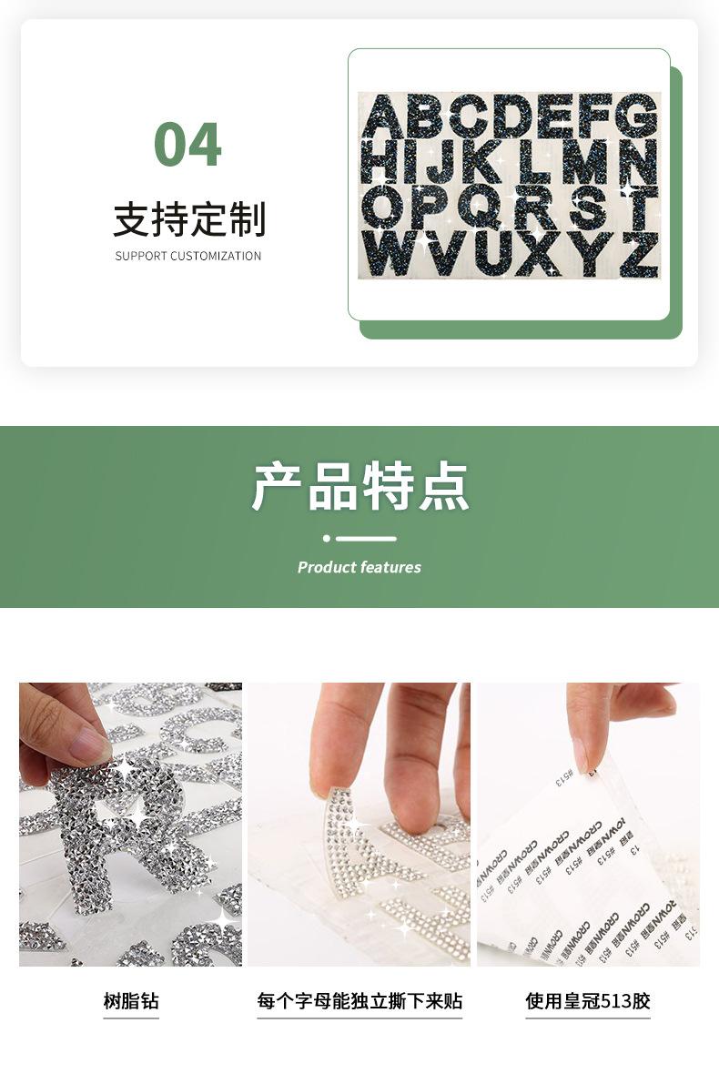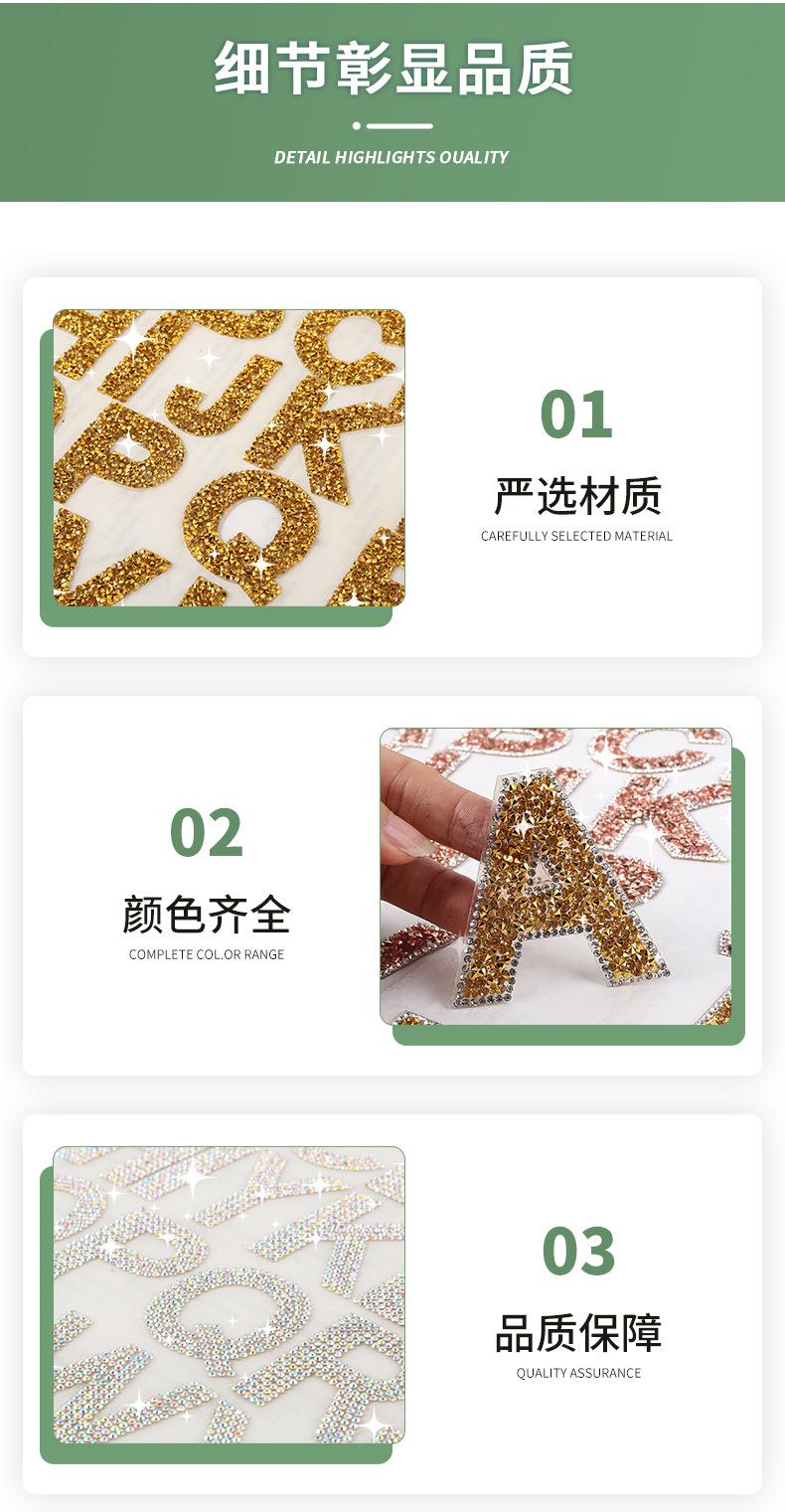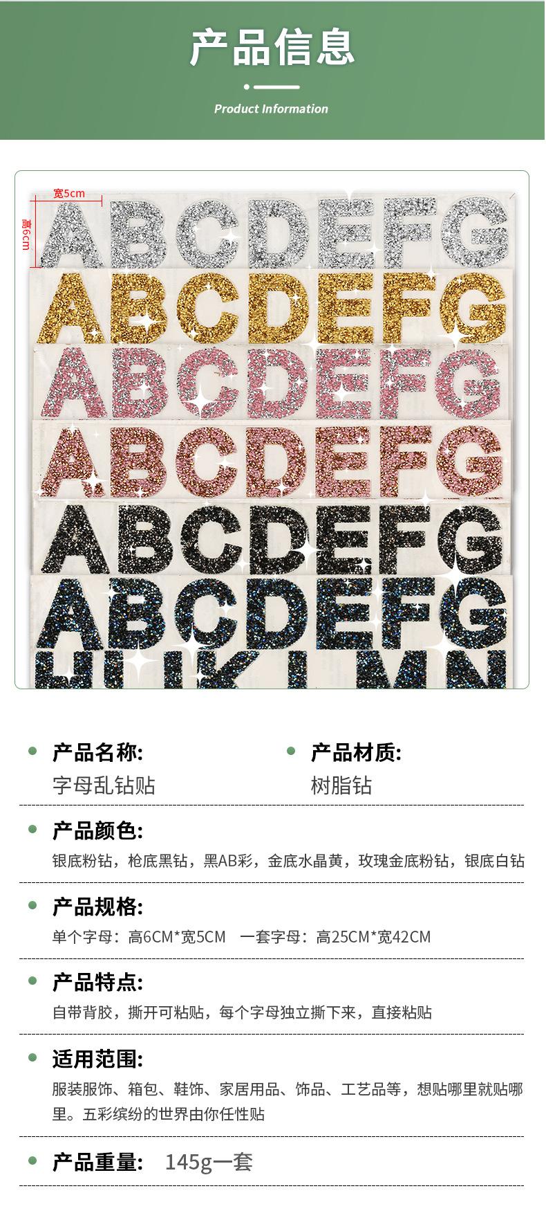 Diamantes de resina personalizados de fábrica, 26 letras en inglés, adhesivos de diamantes para bricolaje, accesorios de ropa, zapatos, bolsos y accesorios.