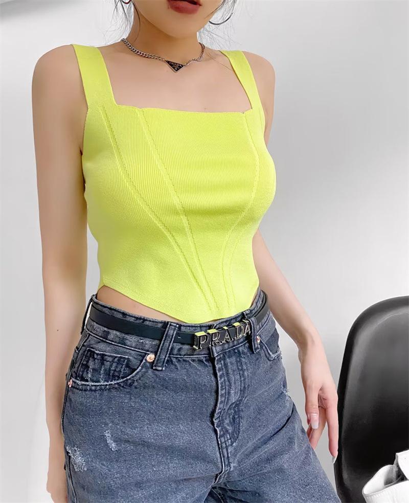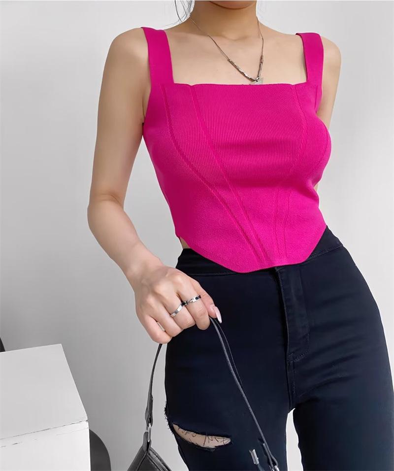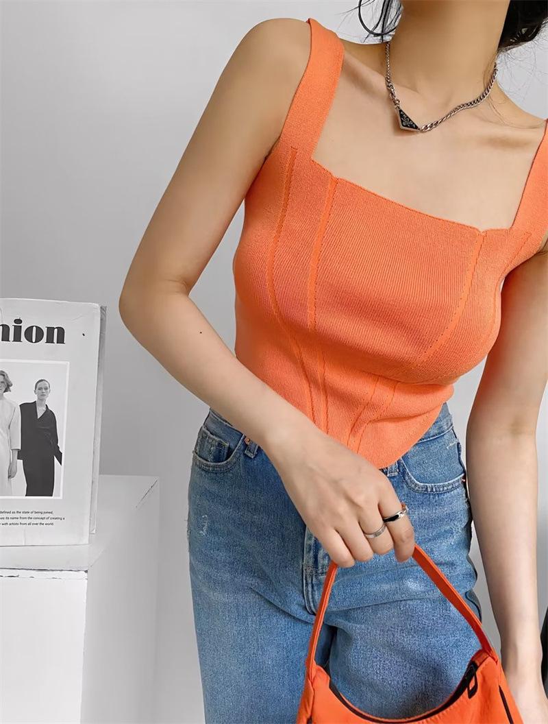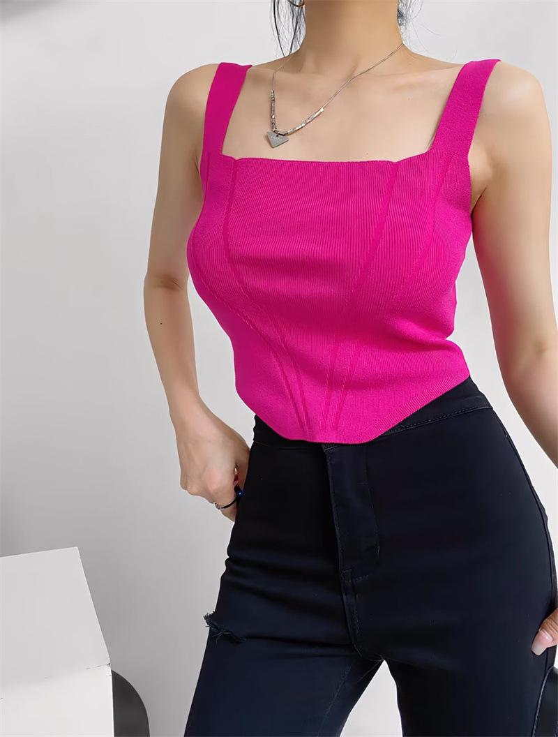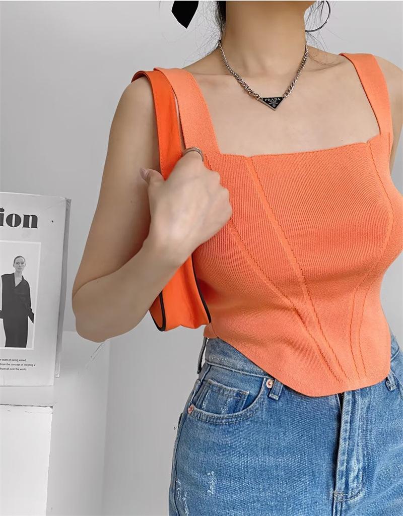 Chaleco de cuello cuadrado estilo dulce y picante de color puro nuevo de verano 2023, top ajustado sexy, tirantes pequeños y curvos para mujer