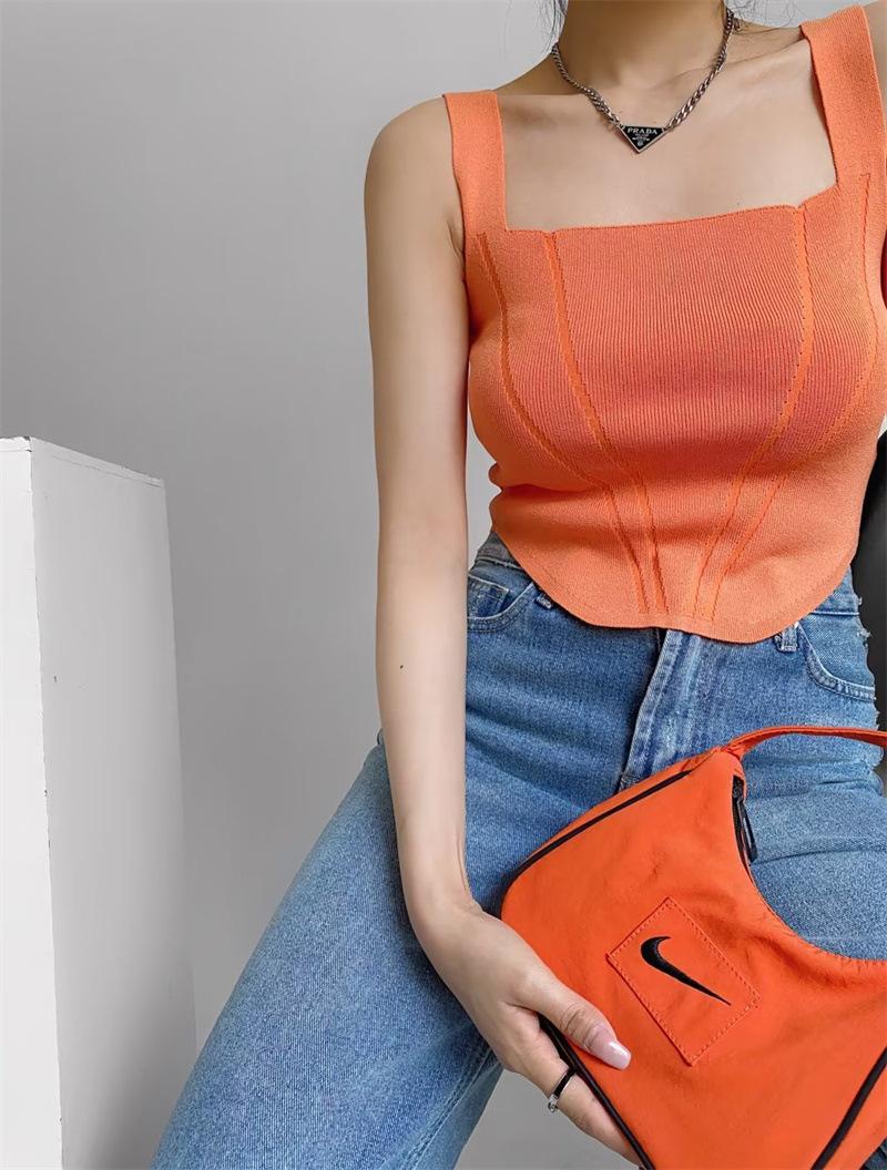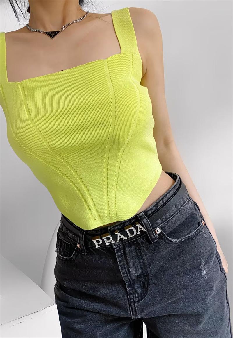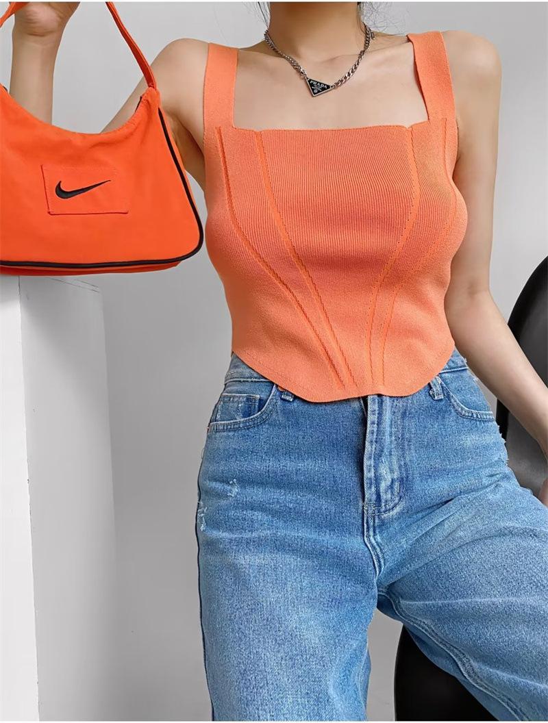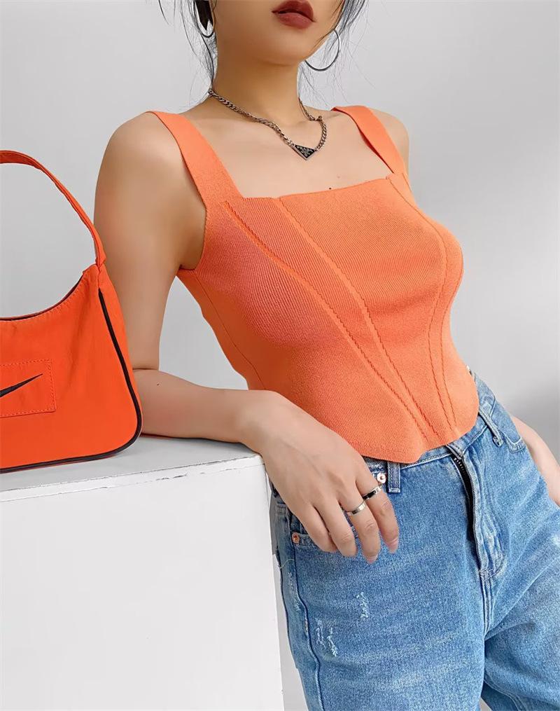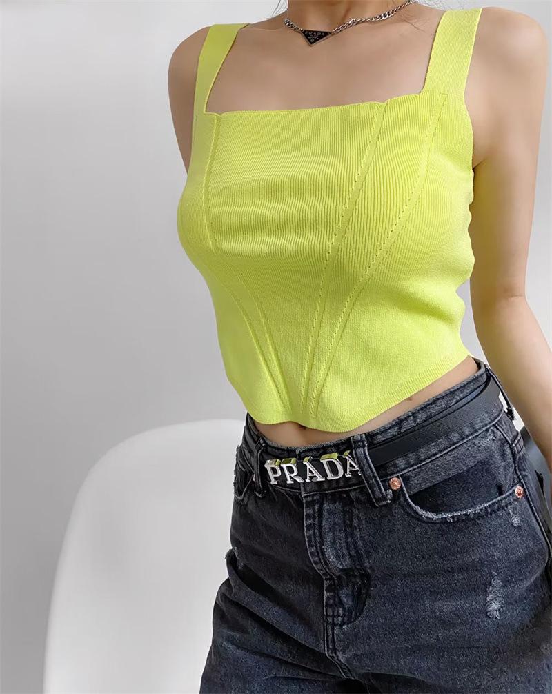 Chaleco de cuello cuadrado estilo dulce y picante de color puro nuevo de verano 2023, top ajustado sexy, tirantes pequeños y curvos para mujer