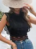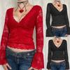 Blusa corta hueca de manga larga con cuello en V y encaje, sexy, en blanco y negro, para mujer, verano 2024