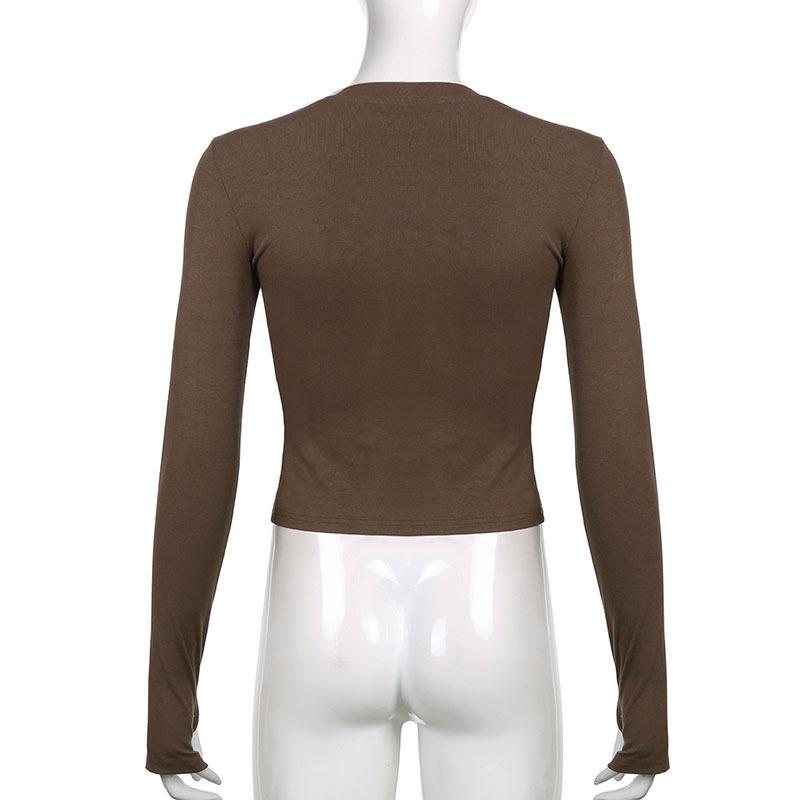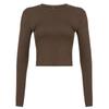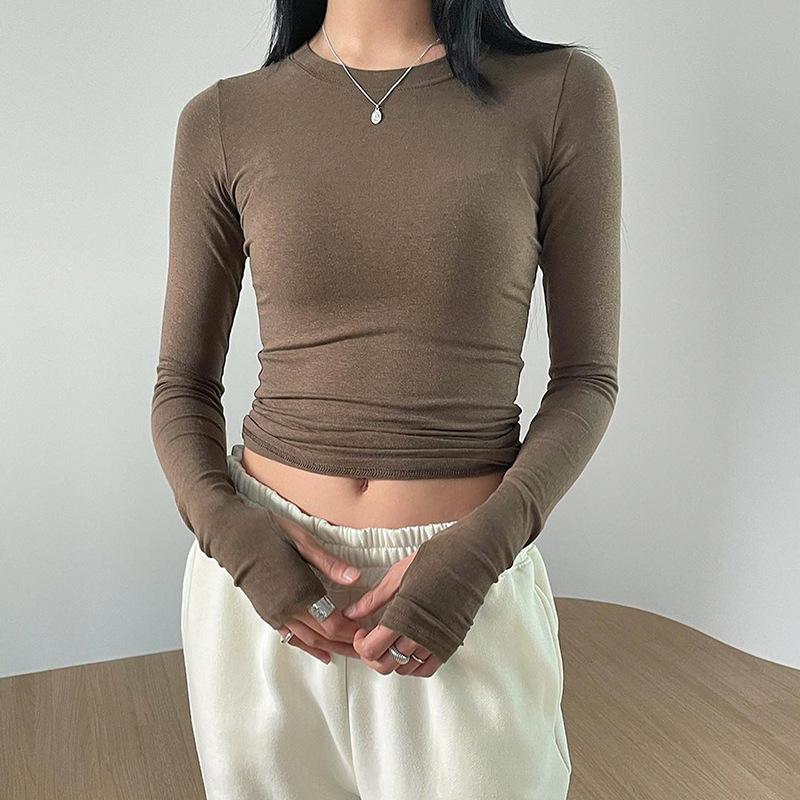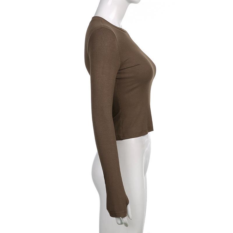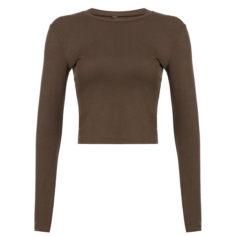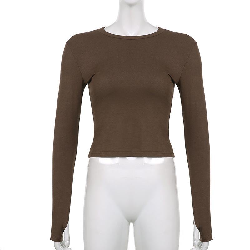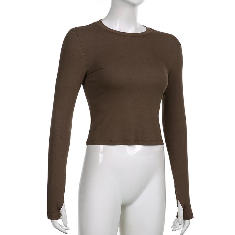 Camiseta de manga larga con hebilla de pulgar marrón para mujer, top informal de cuello redondo ajustado con parte inferior elástica de color sólido para primavera y otoño