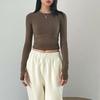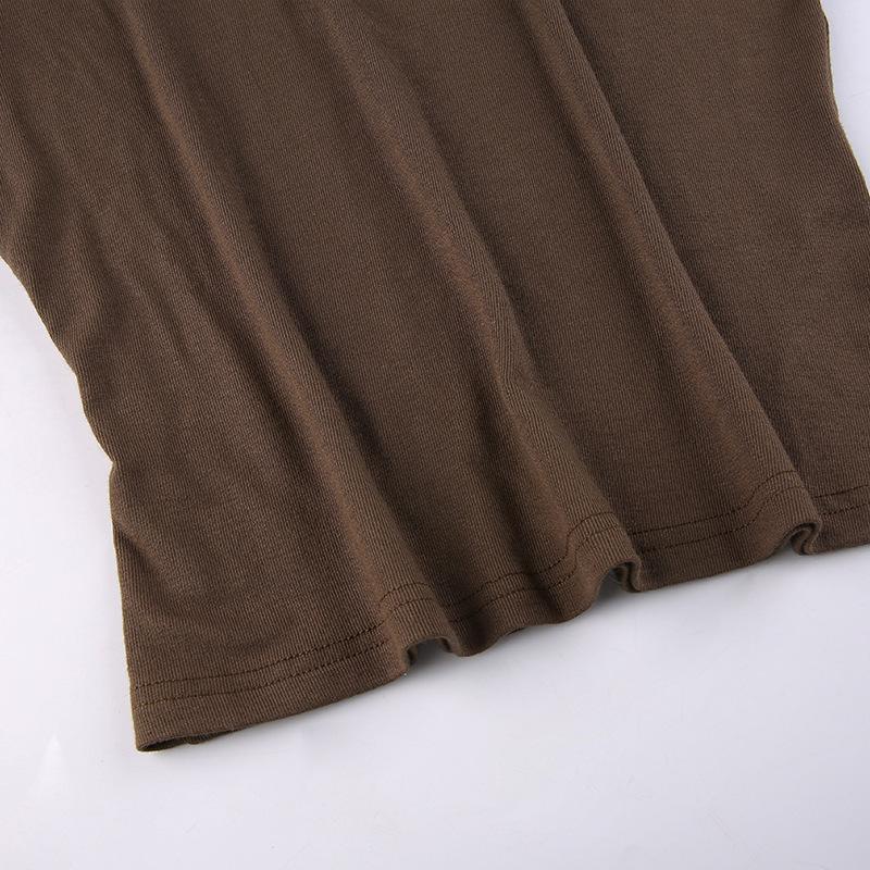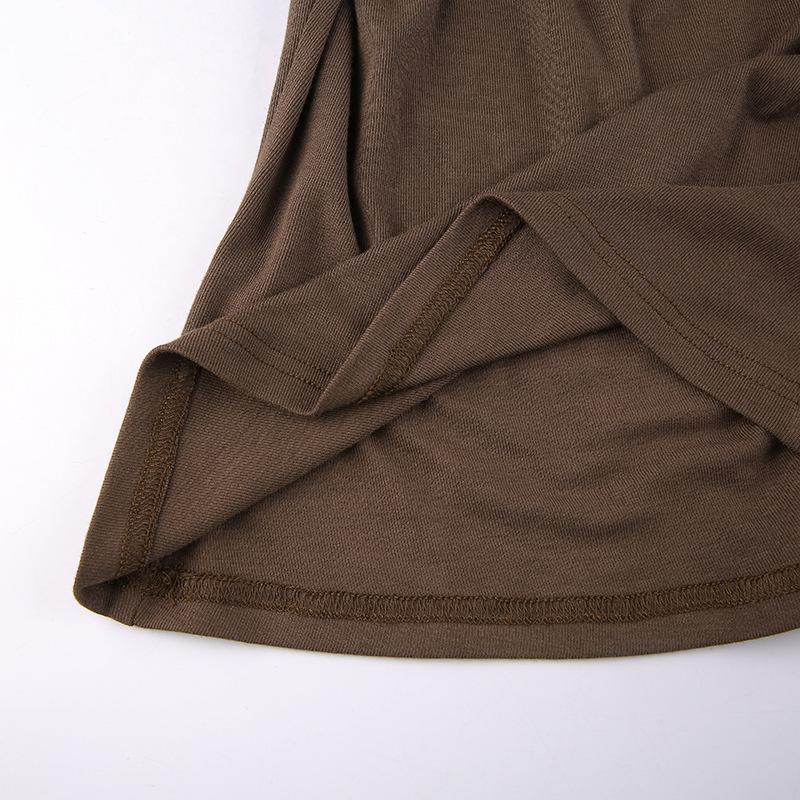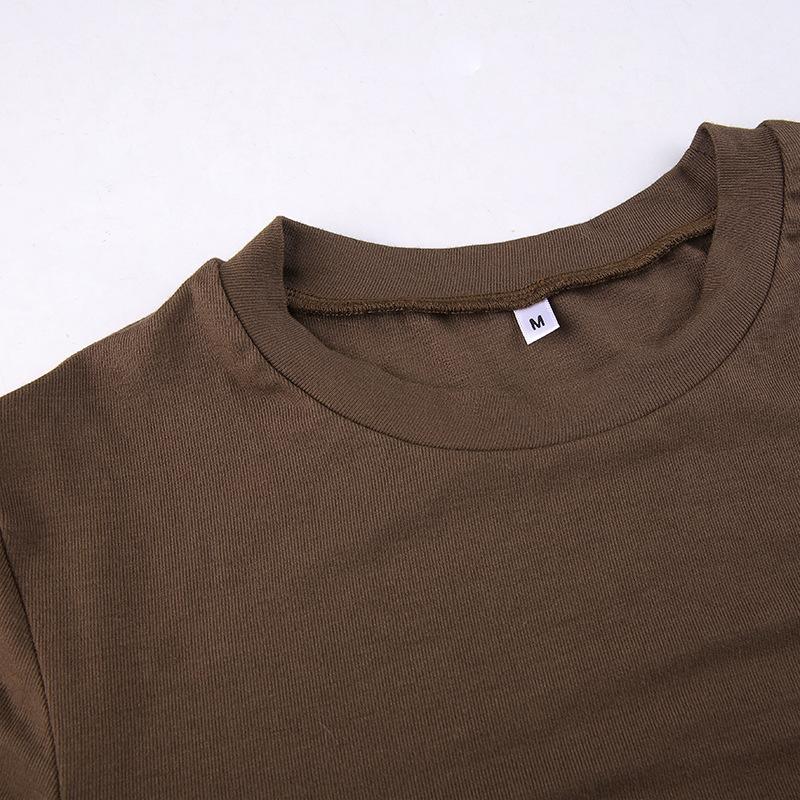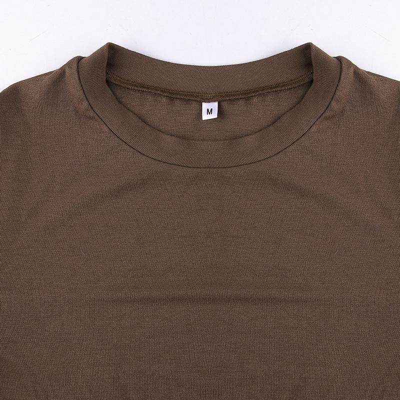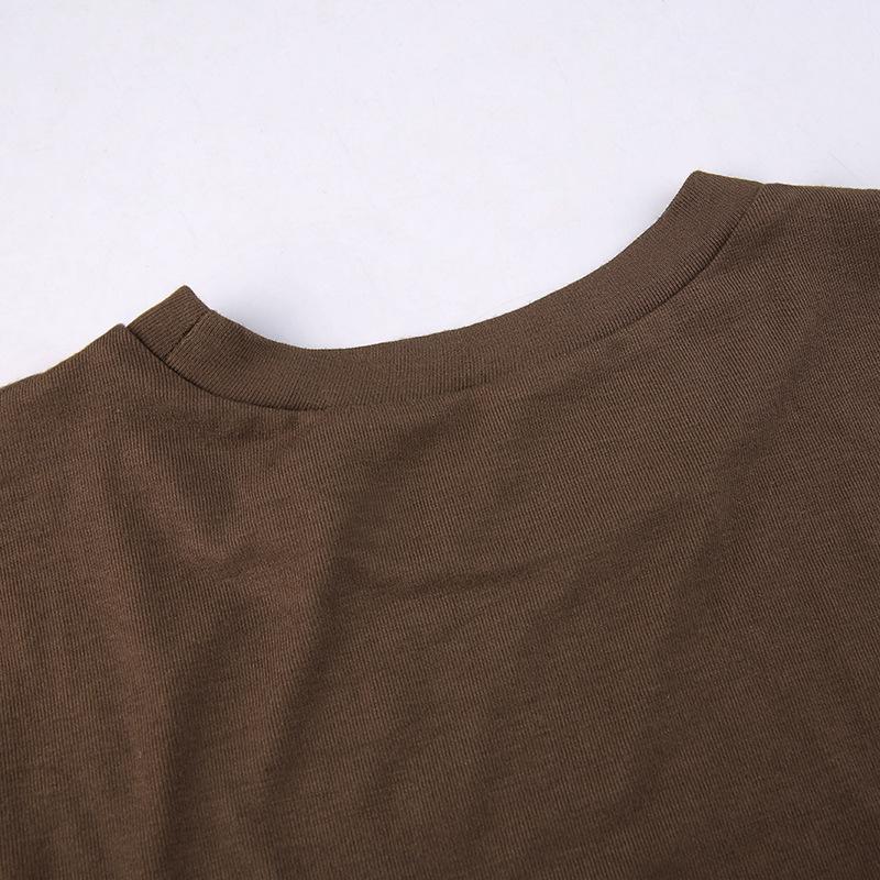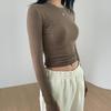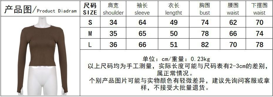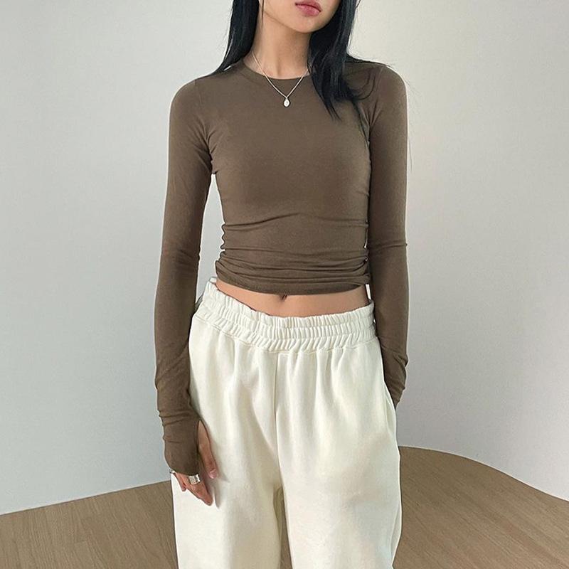 Camiseta de manga larga con hebilla de pulgar marrón para mujer, top informal de cuello redondo ajustado con parte inferior elástica de color sólido para primavera y otoño