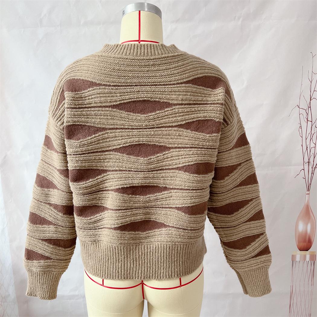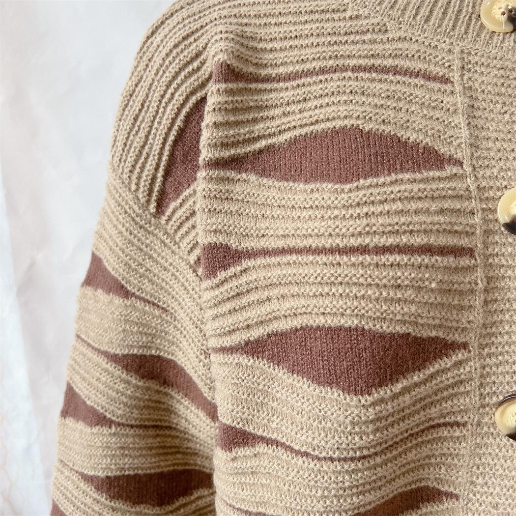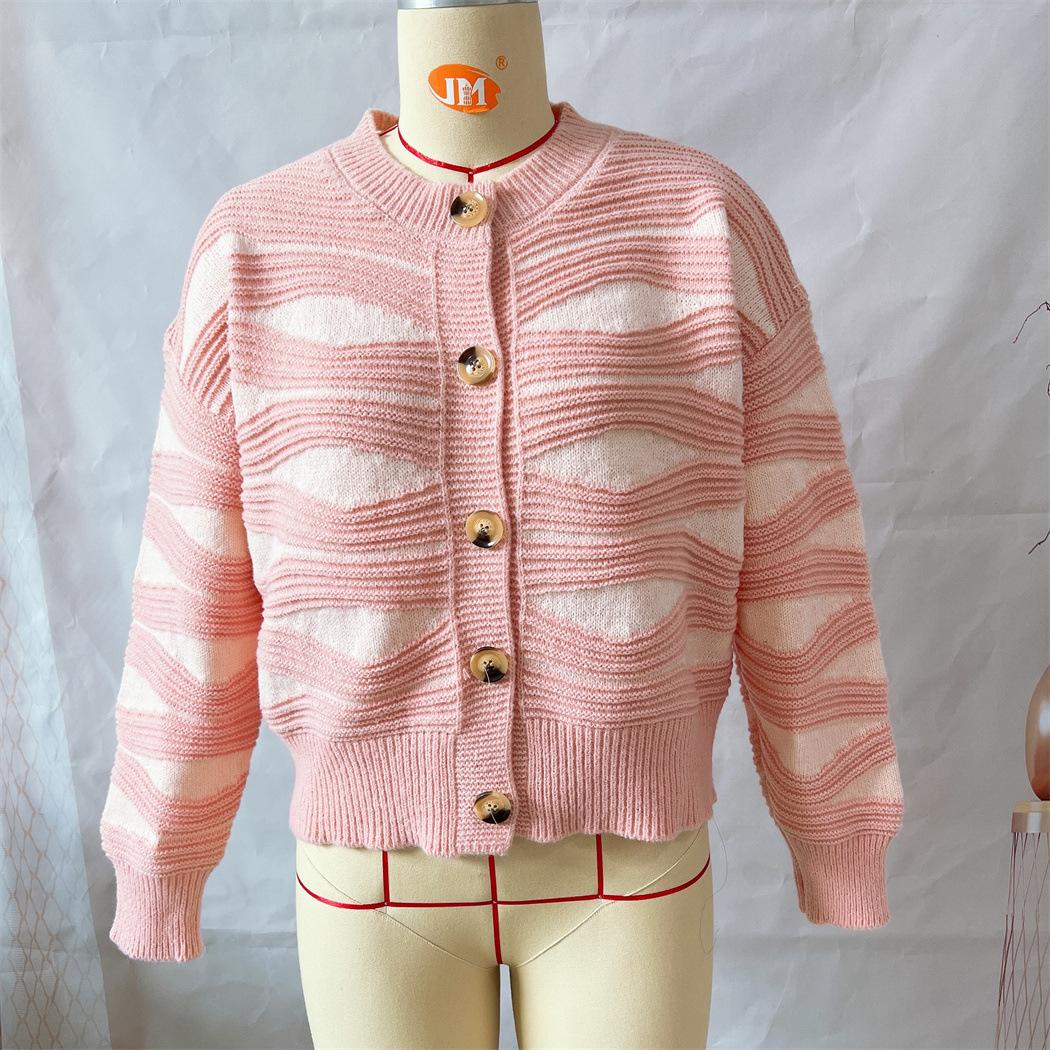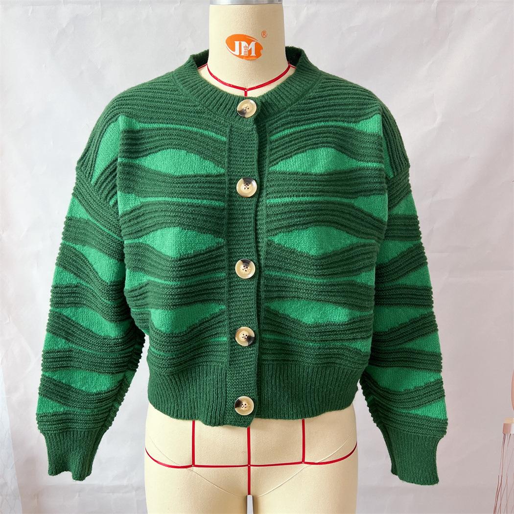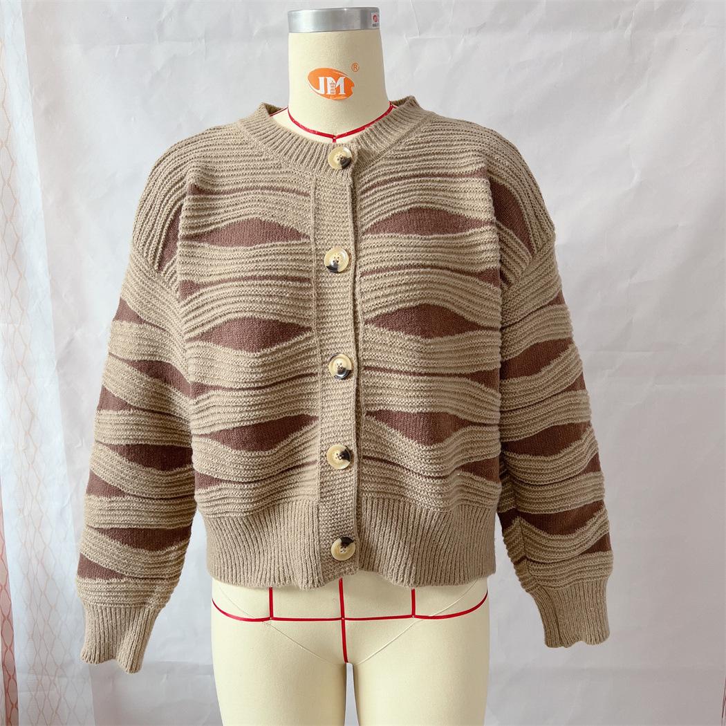 Suéter tipo cárdigan corto con cuello redondo y botonadura sencilla con rayas irregulares en contraste de color para otoño e invierno transfronterizo europeo y americano para mujer