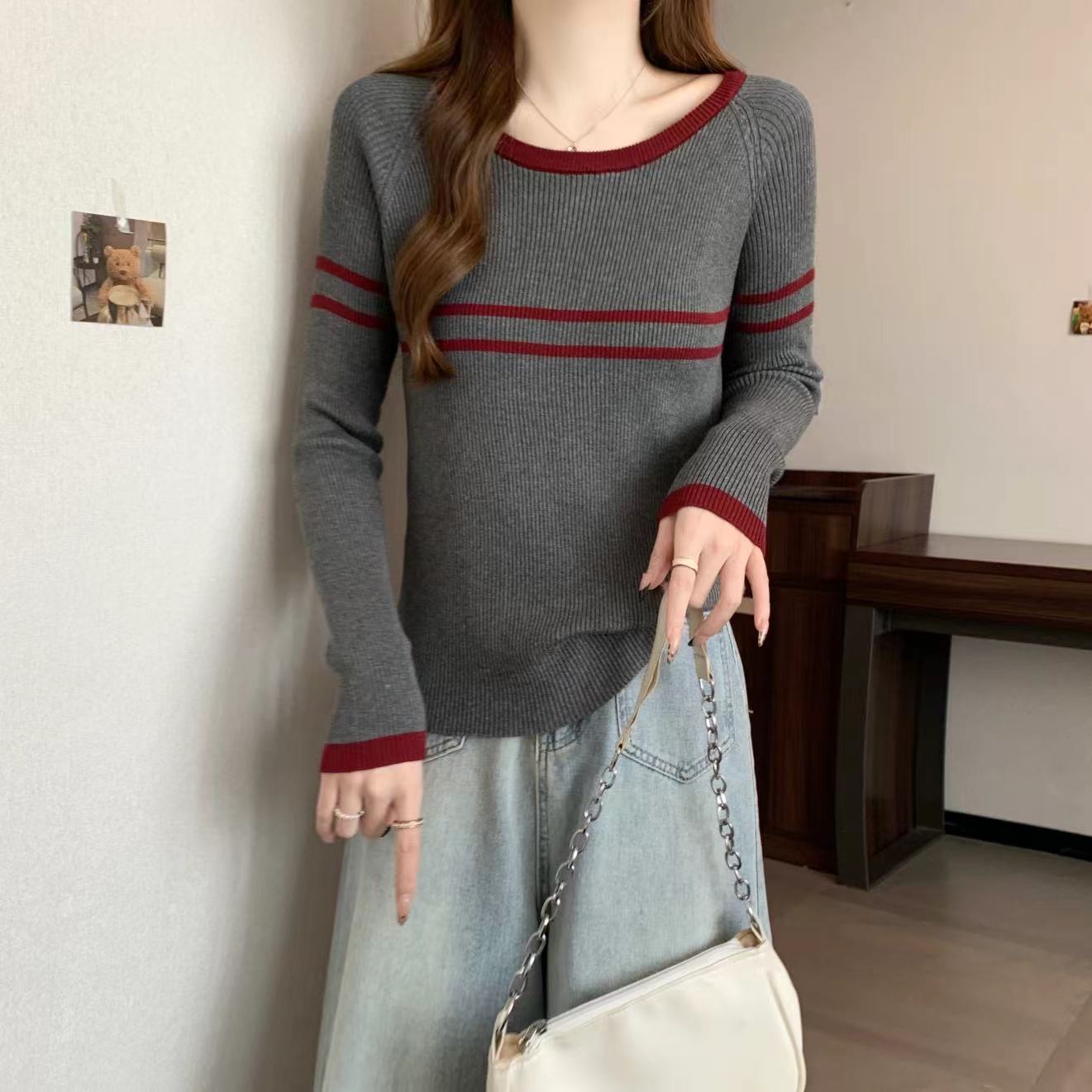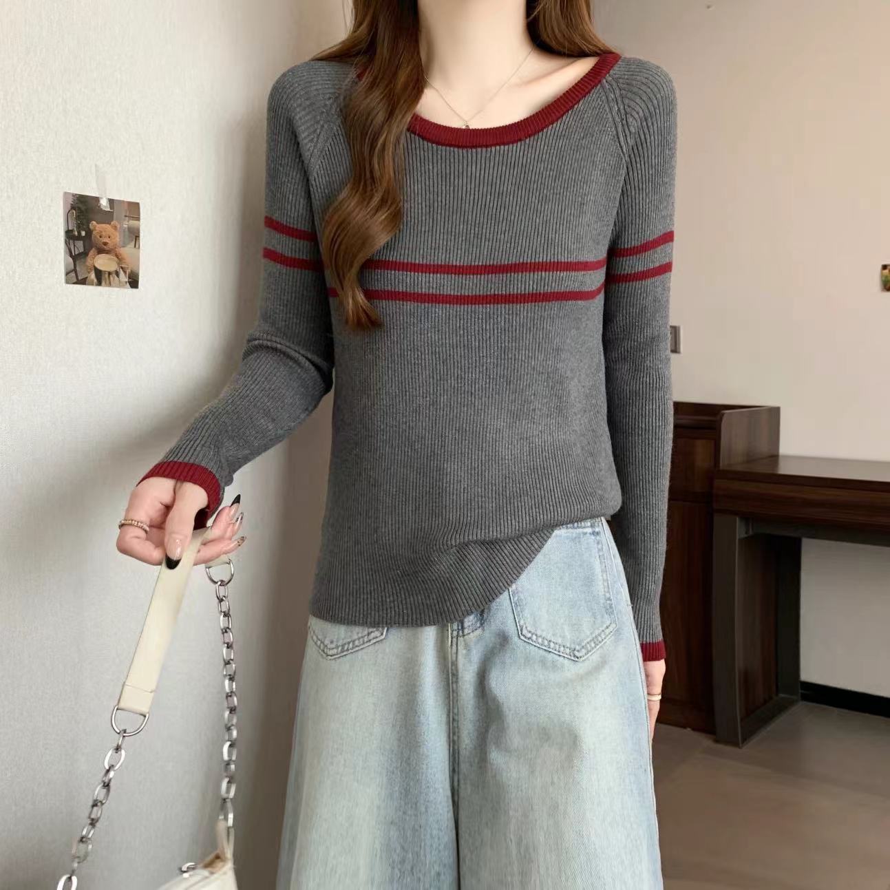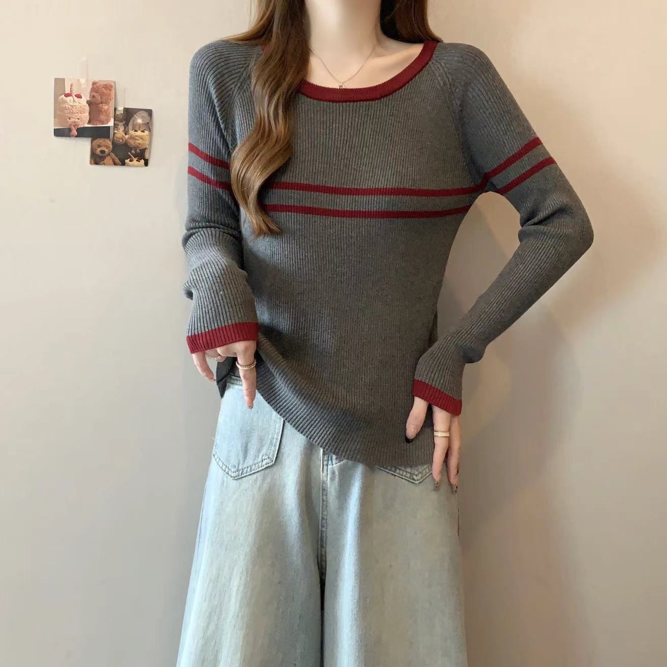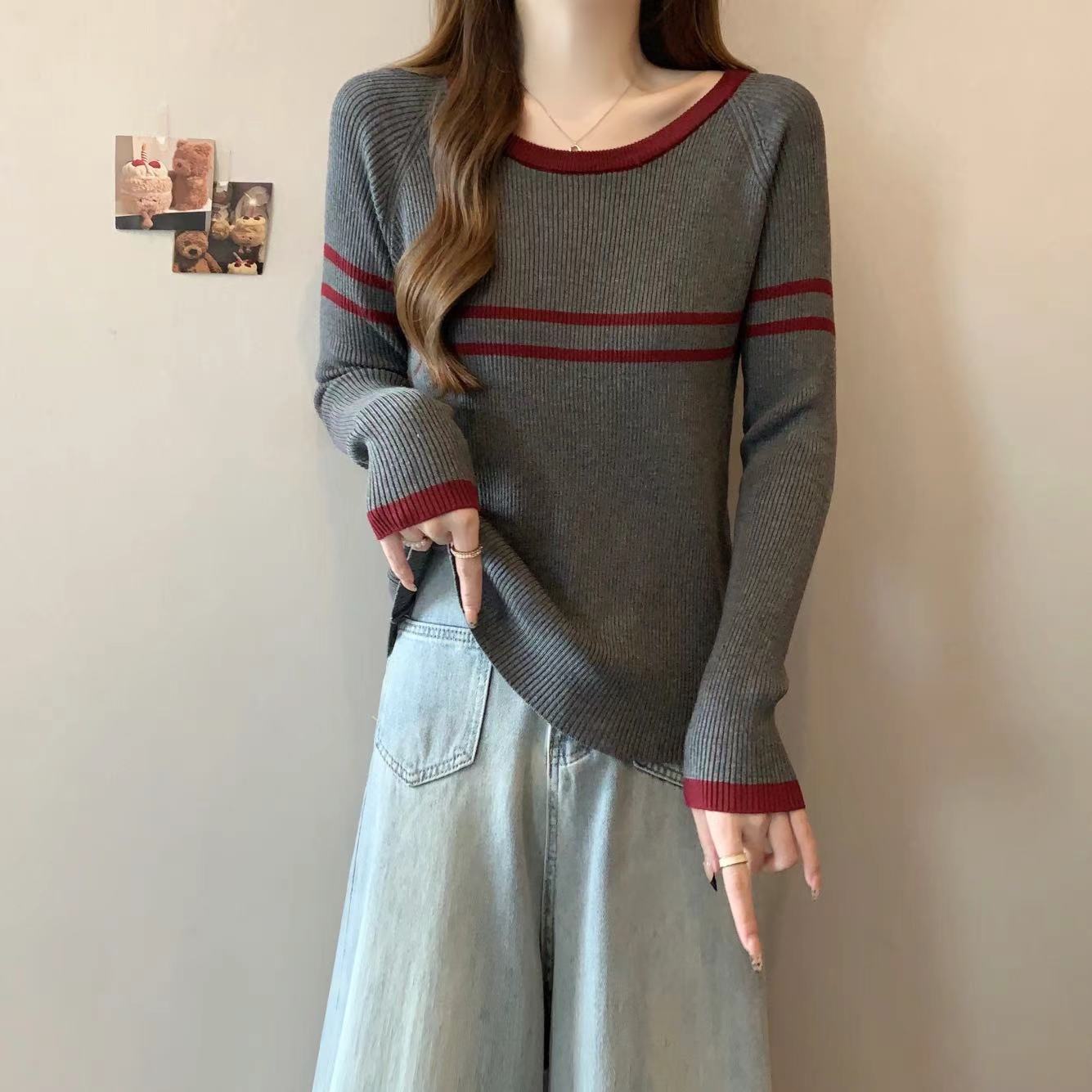 Suéter de punto de color contrastante de estilo coreano, camisa de base a rayas para mujer, nuevo suéter de punto de cuello redondo de estilo occidental de talla grande y corte entallado para otoño e invierno.