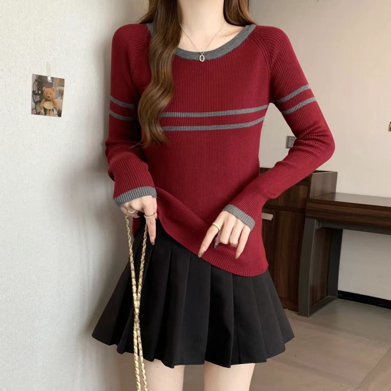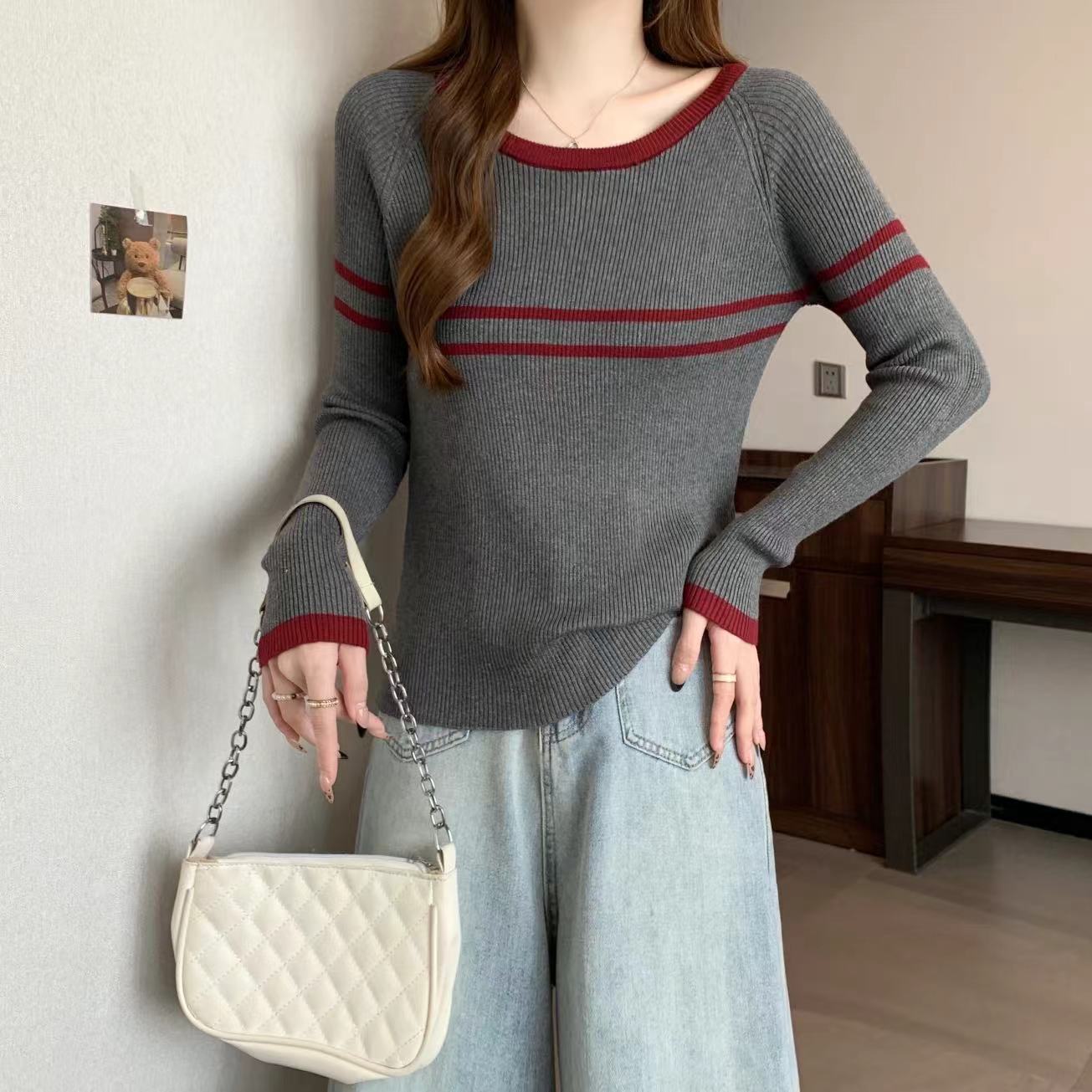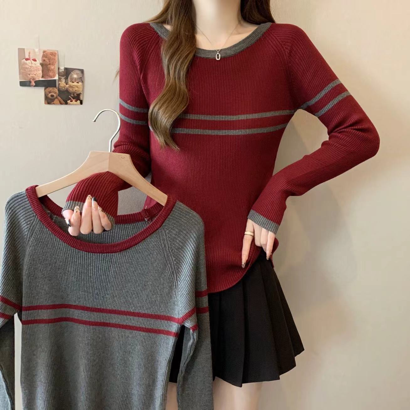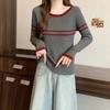 Suéter de punto de color contrastante de estilo coreano, camisa de base a rayas para mujer, nuevo suéter de punto de cuello redondo de estilo occidental de talla grande y corte entallado para otoño e invierno.