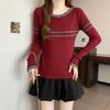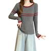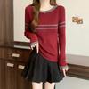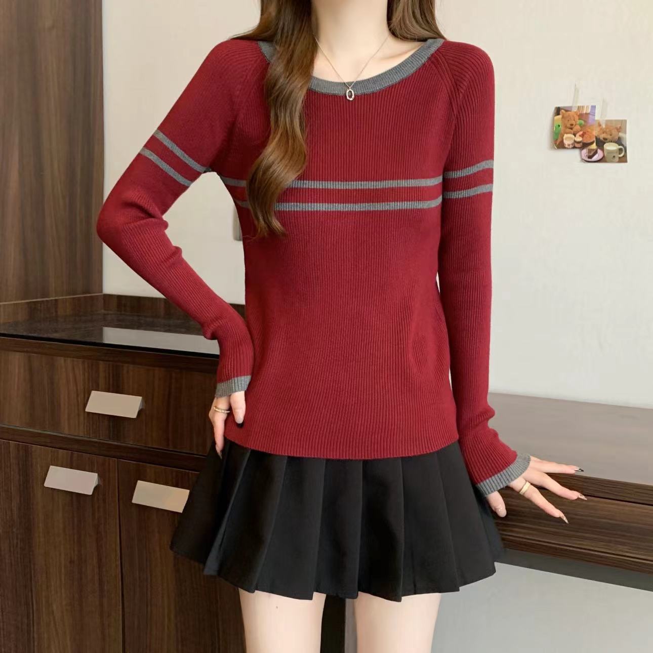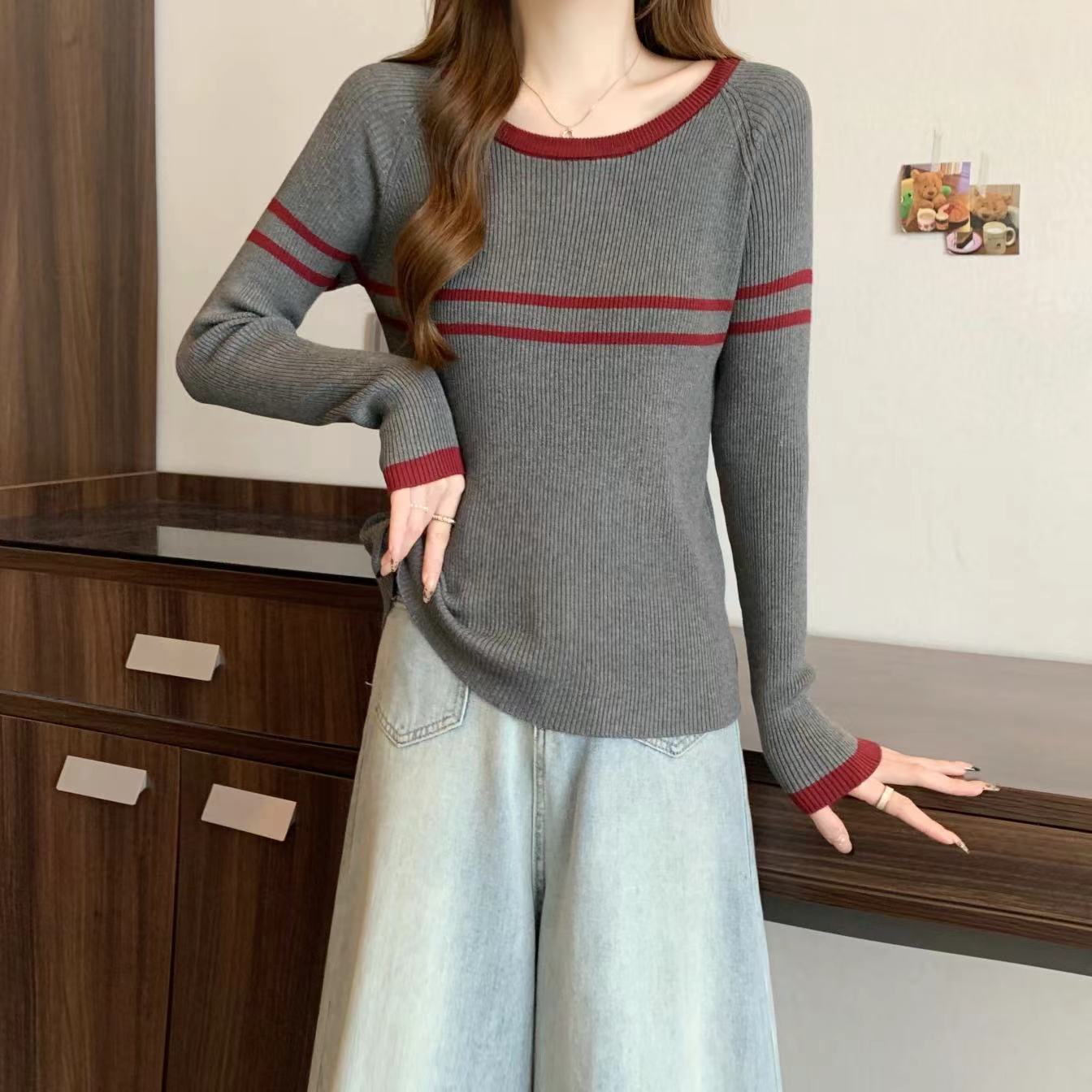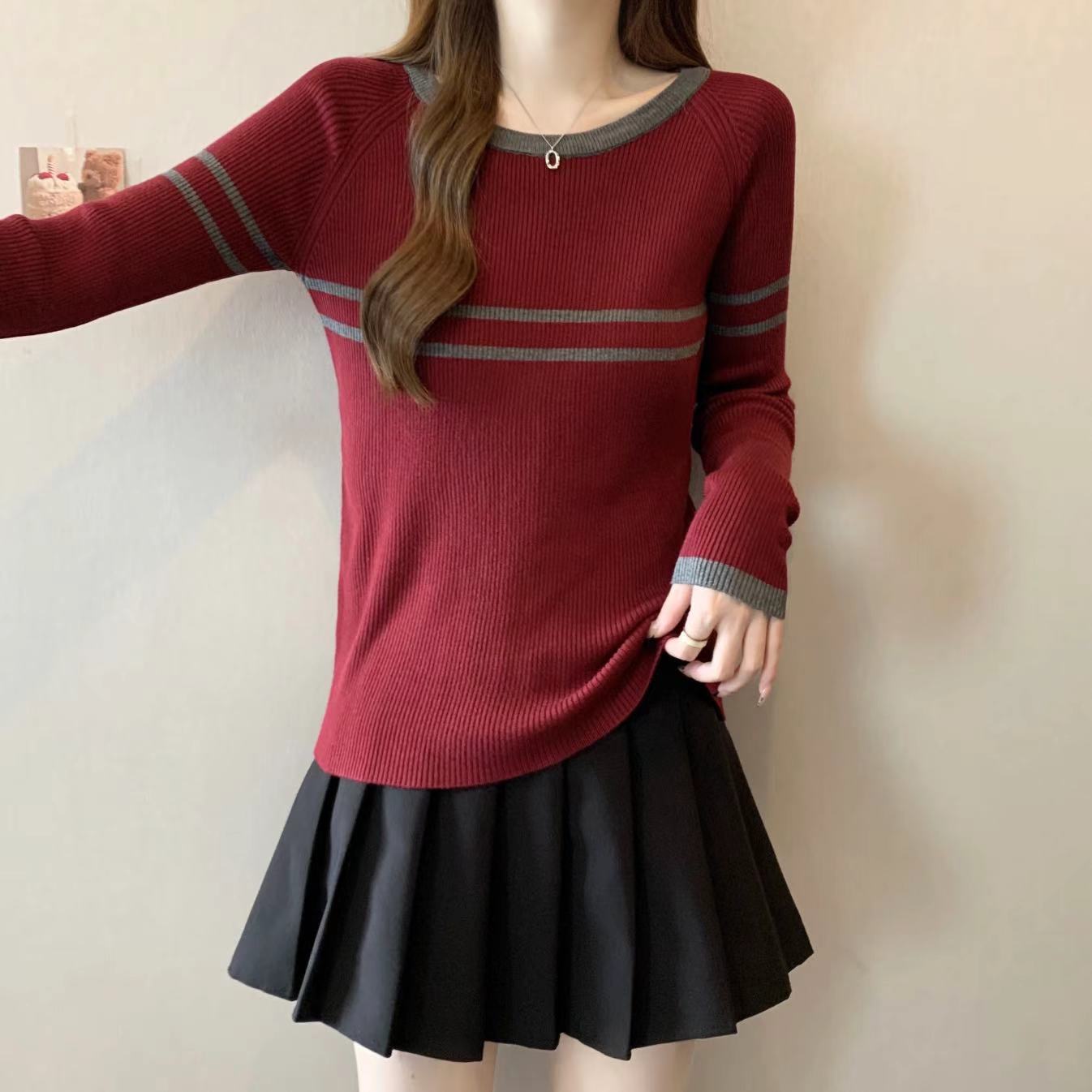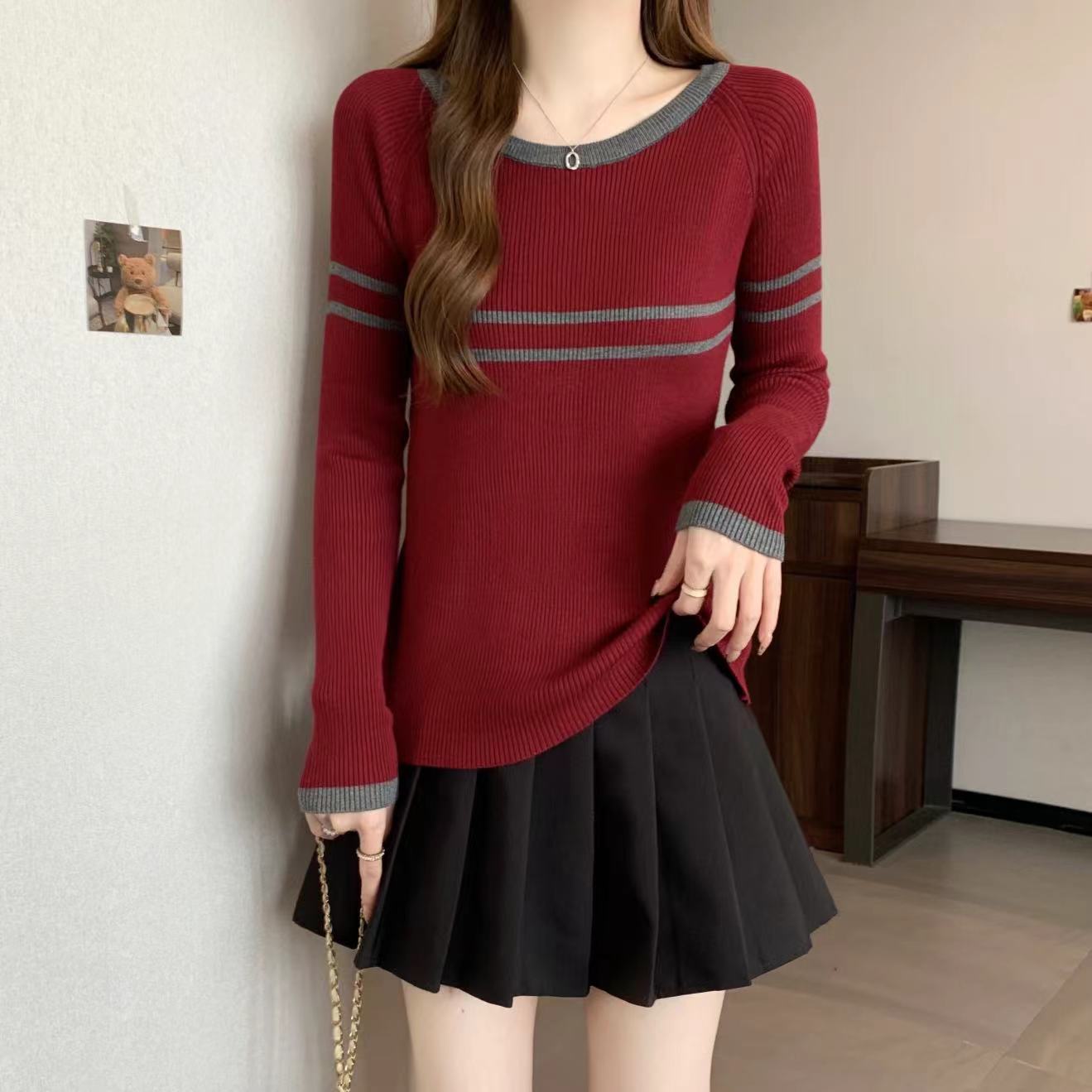 Suéter de punto de color contrastante de estilo coreano, camisa de base a rayas para mujer, nuevo suéter de punto de cuello redondo de estilo occidental de talla grande y corte entallado para otoño e invierno.