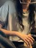 Camiseta de manga corta estilo frío para mujer, verano 2023, nueva camiseta holgada con hombros descubiertos y cuello redondo con estampado de letras.
