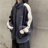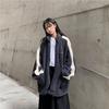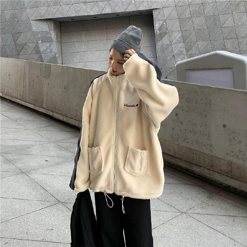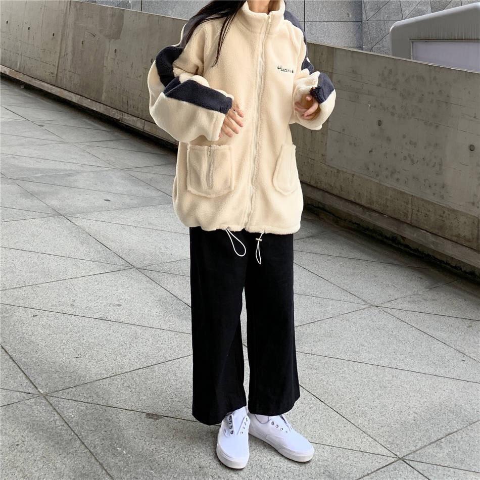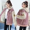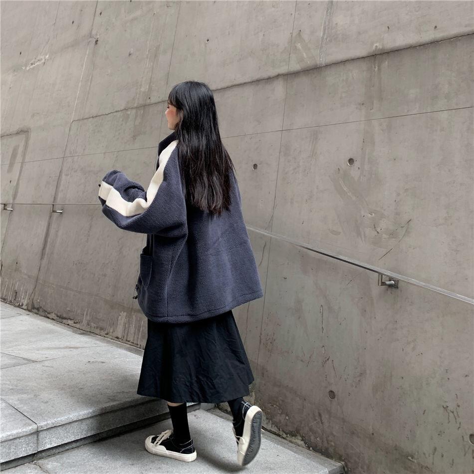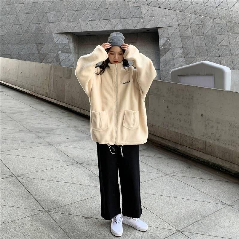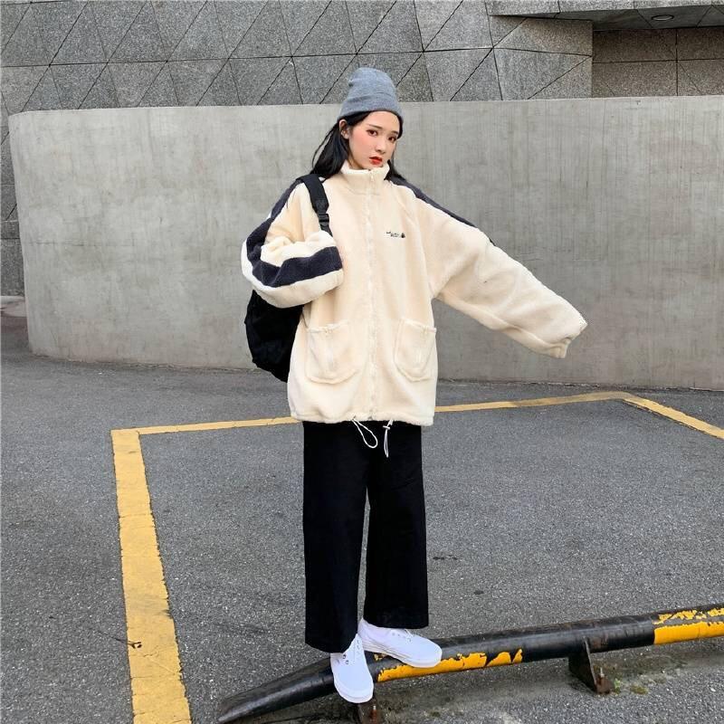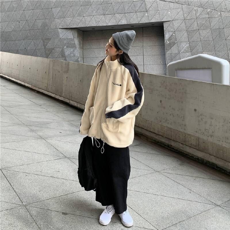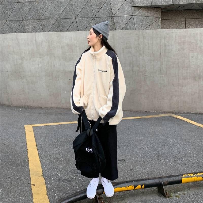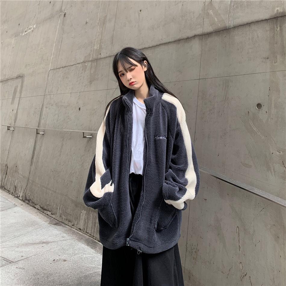 Chaqueta con cremallera estilo universitario de otoño e invierno para mujer, holgada, estudiantil, bordada, cuello alto, imitación borreguito, tipo béisbol, casual y versátil