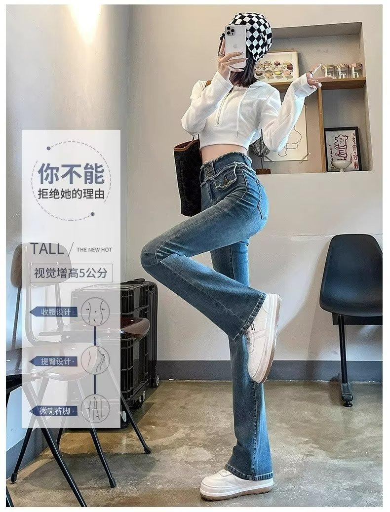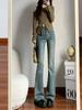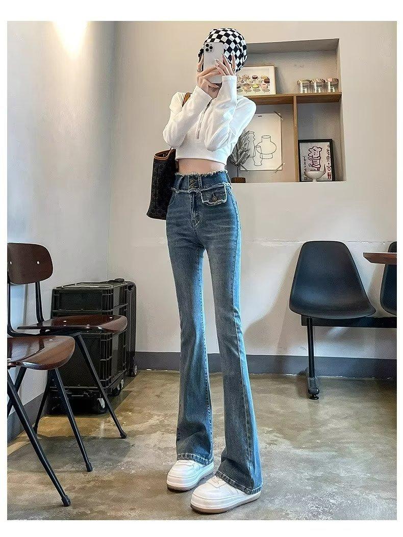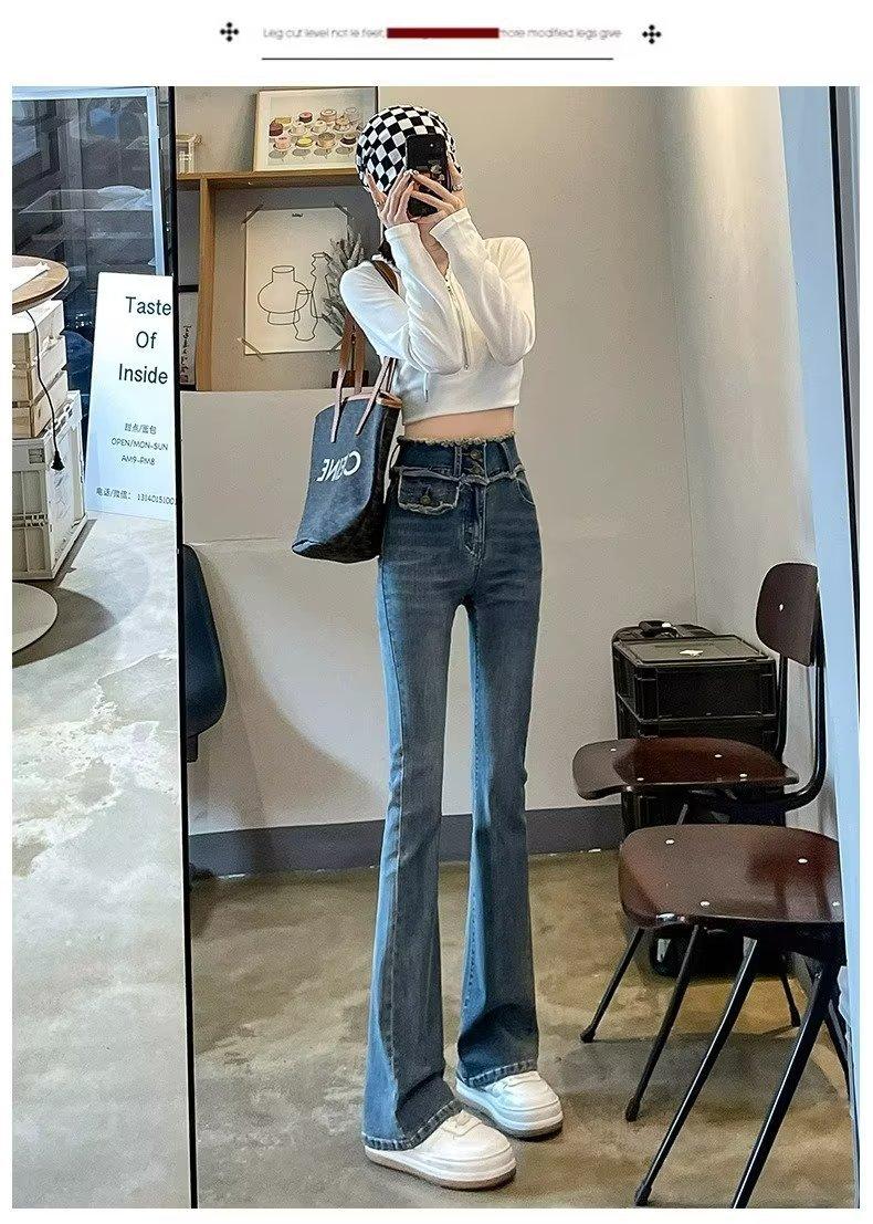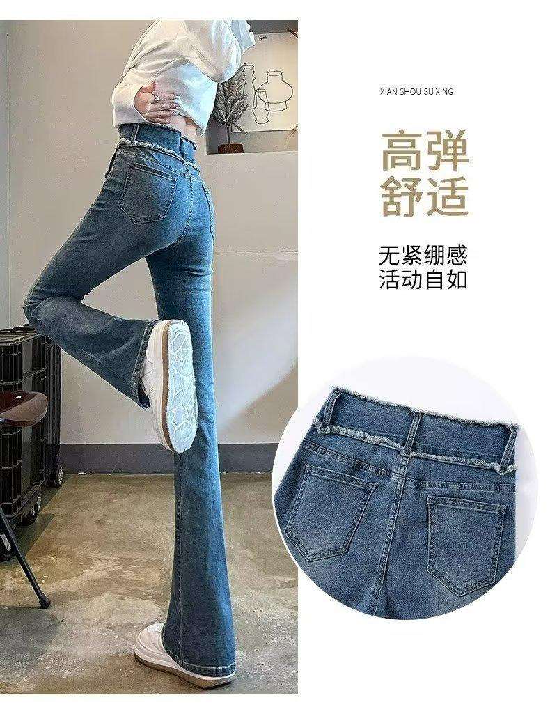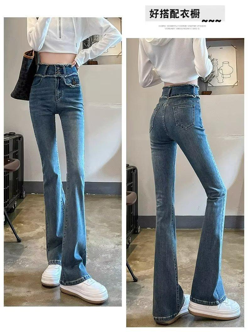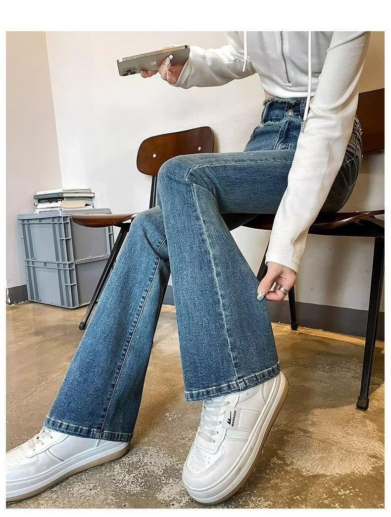 Jeans acampanados retro americanos para mujer otoño e invierno 2024 nuevos cintura alta corte ajustado herradura borde crudo pantalones acampanados