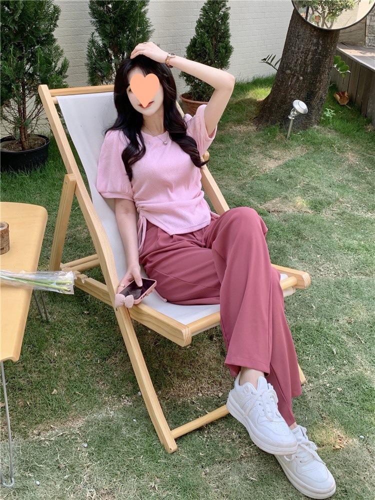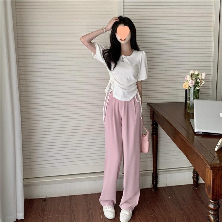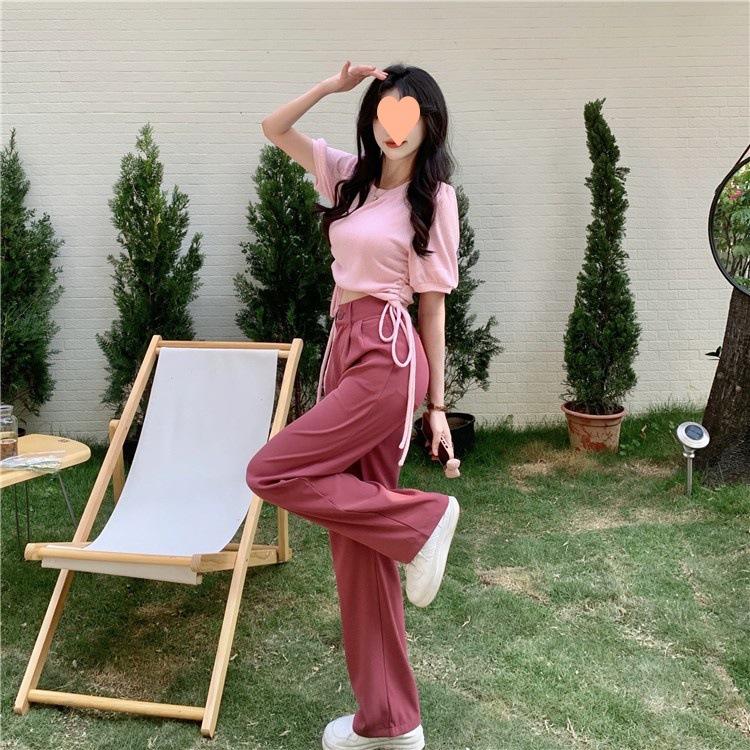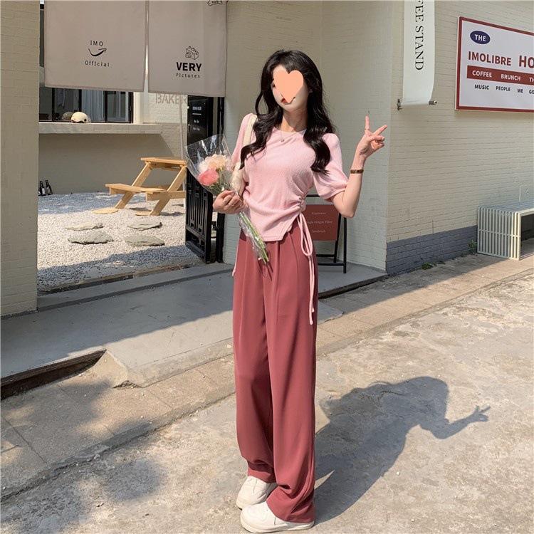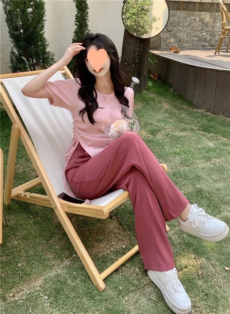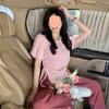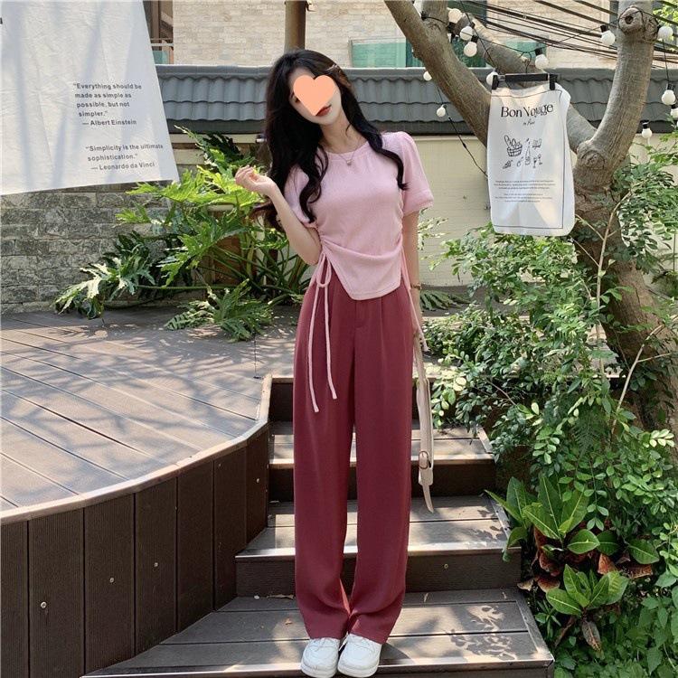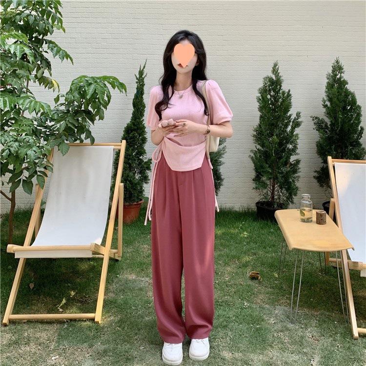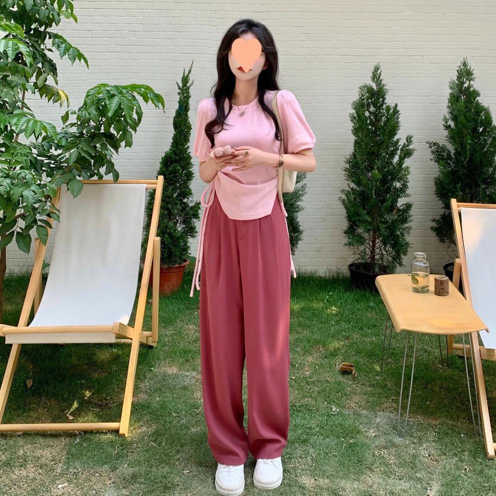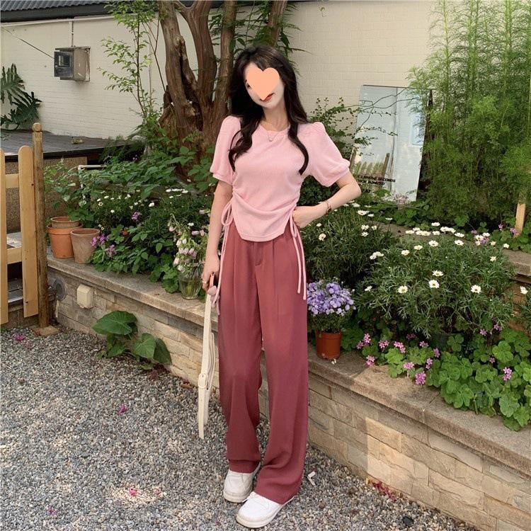 Playera de Manga Corta Abullonada con Diseño de Cordón Talla Grande para Mujer Top para Hombros + Pantalones de Traje Frambuesa
