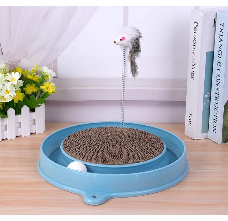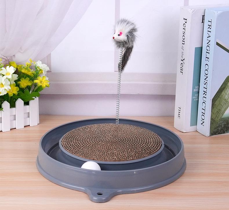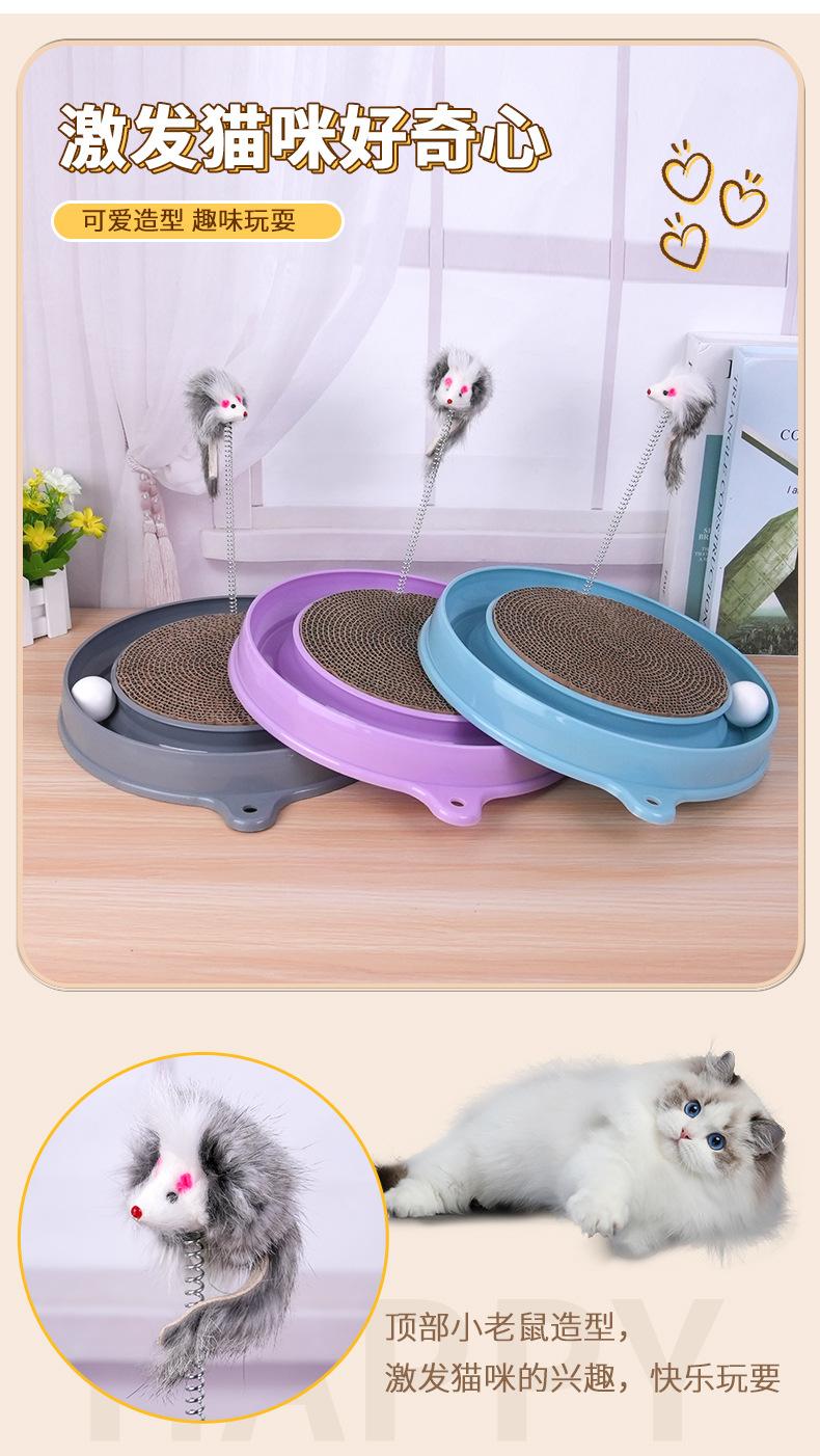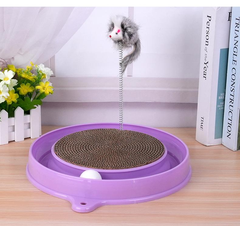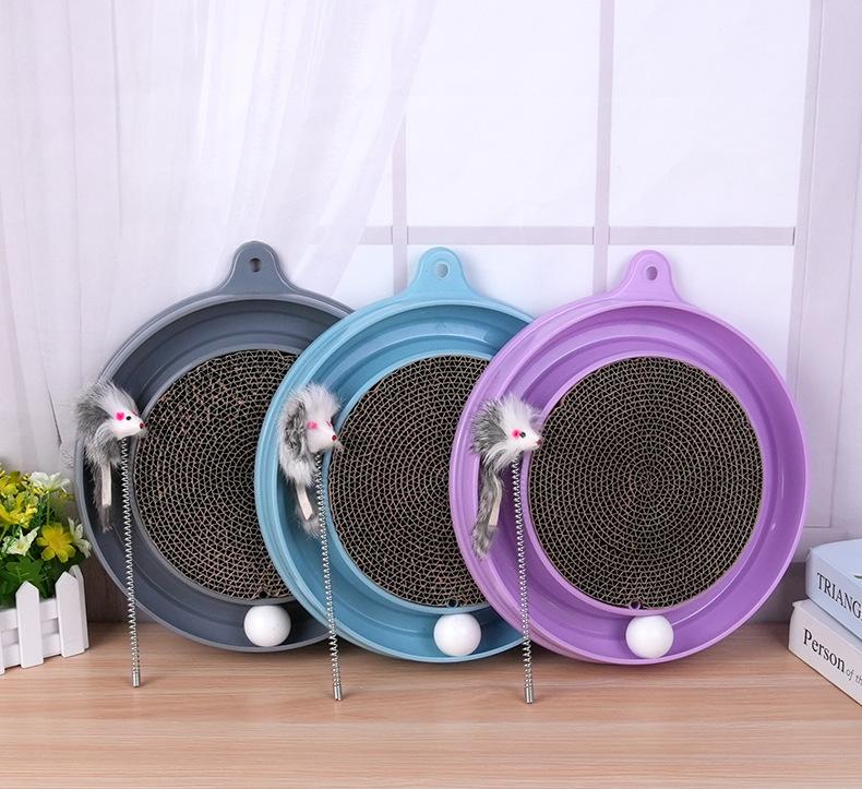 Fabricante de juguetes para gatos, rascador redondo, plato giratorio, papel corrugado, nido para gatos antipelusa, palo con resorte.