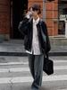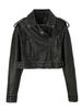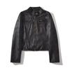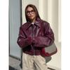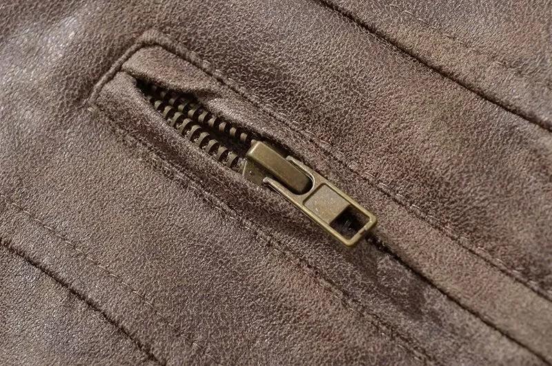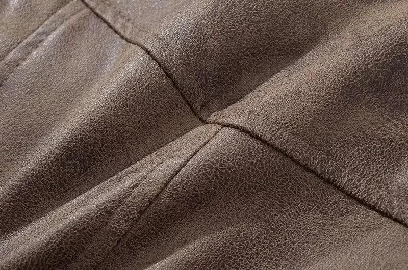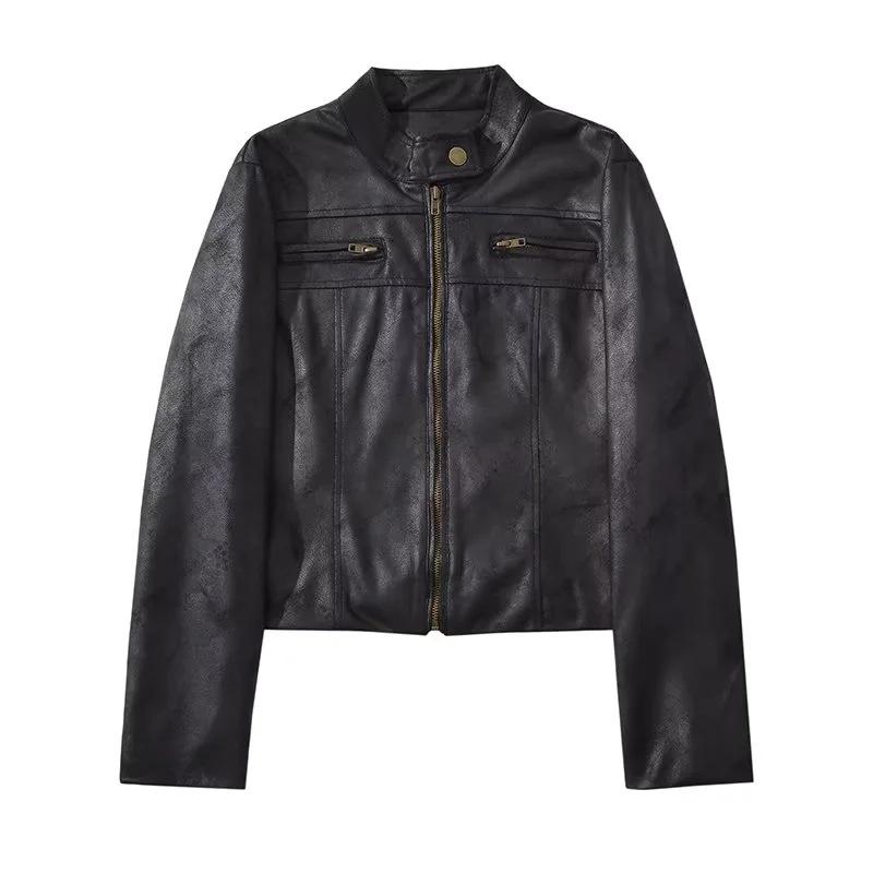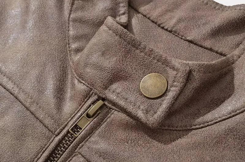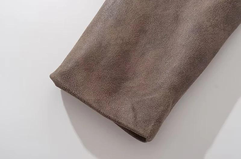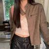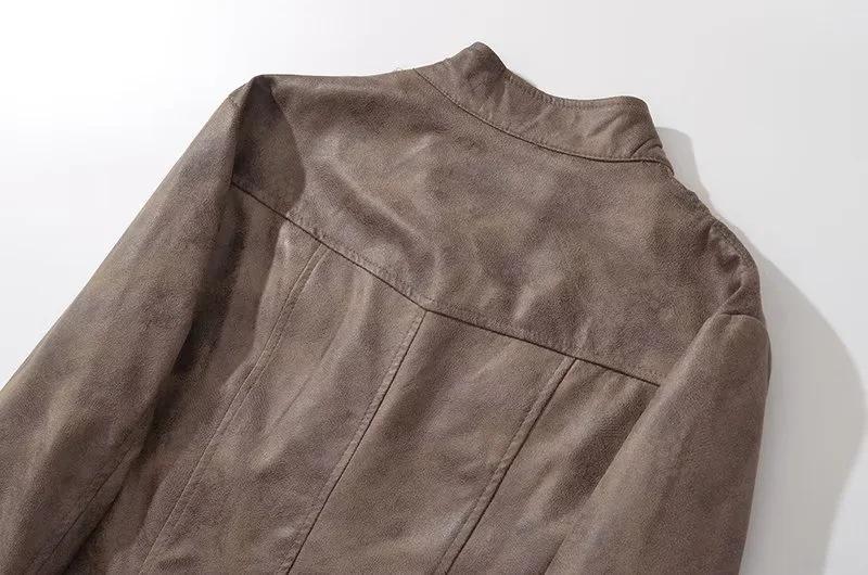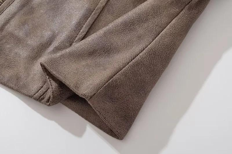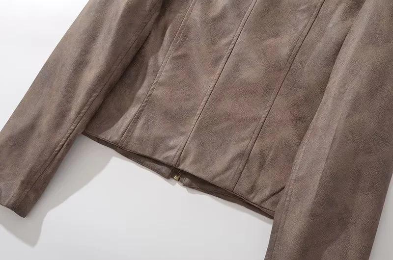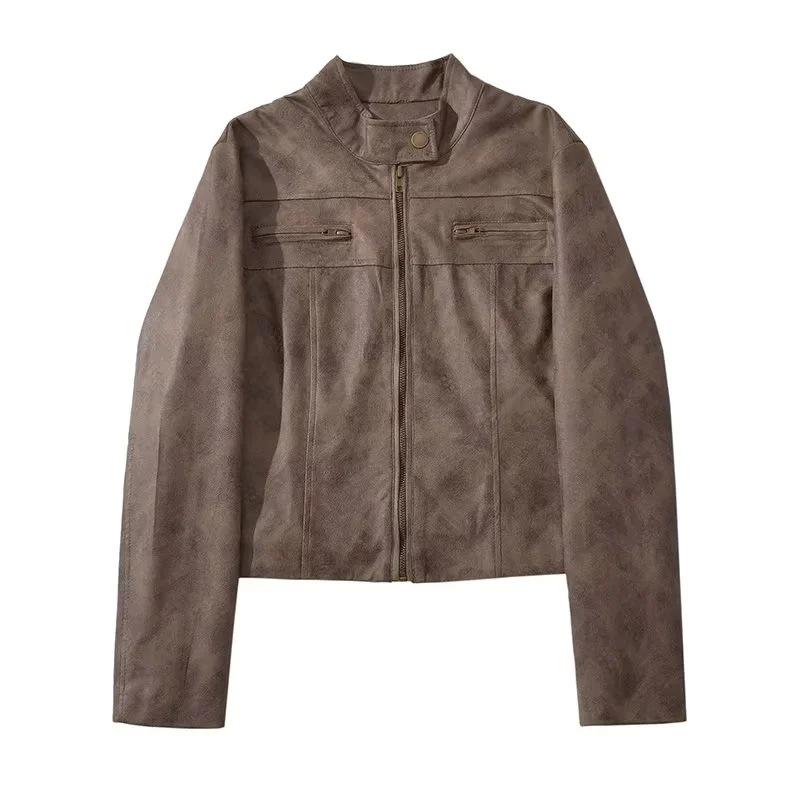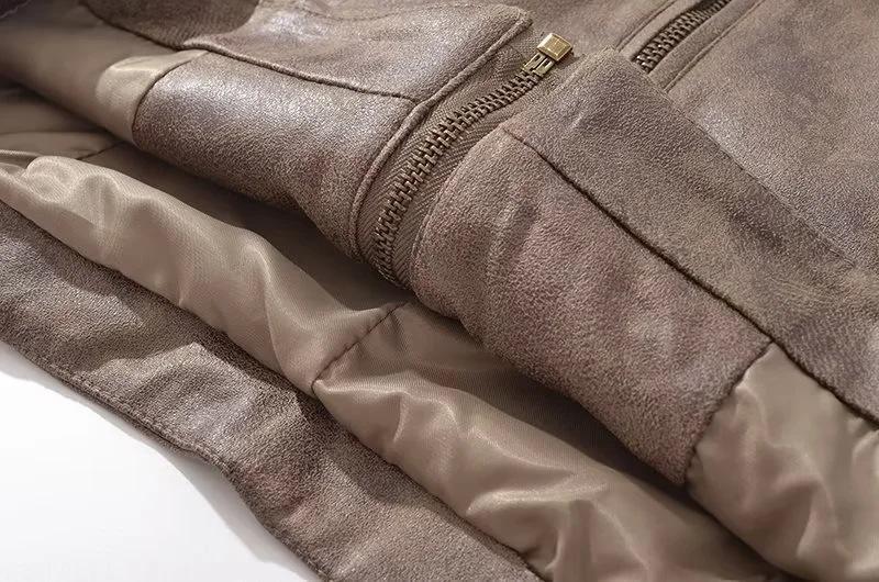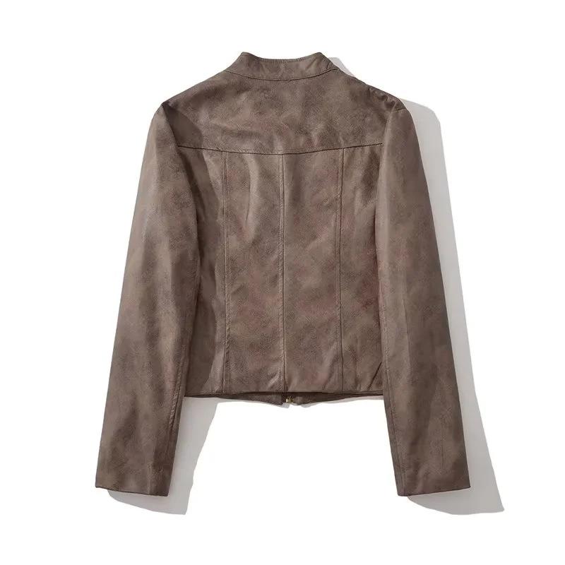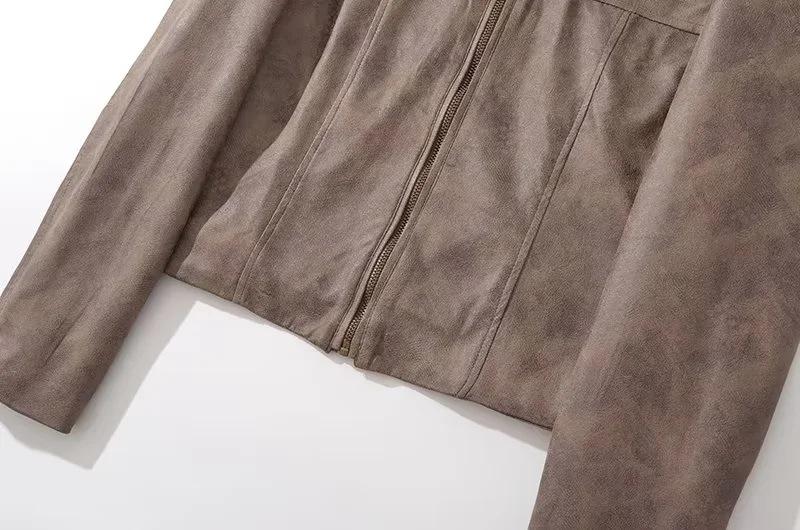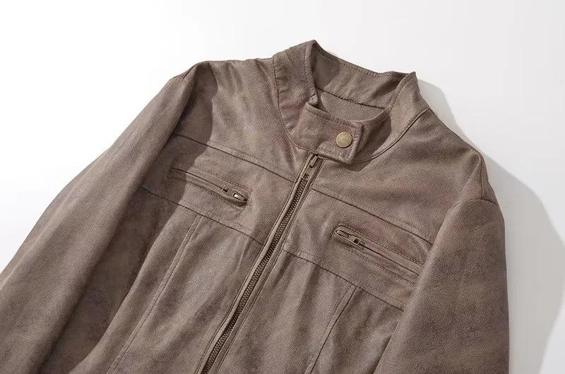 Chaqueta corta de ante marrón desgastado retro americano de otoño e invierno 2023, chaqueta de cuero con cuello alto ajustado para mujer, chaqueta con cremallera