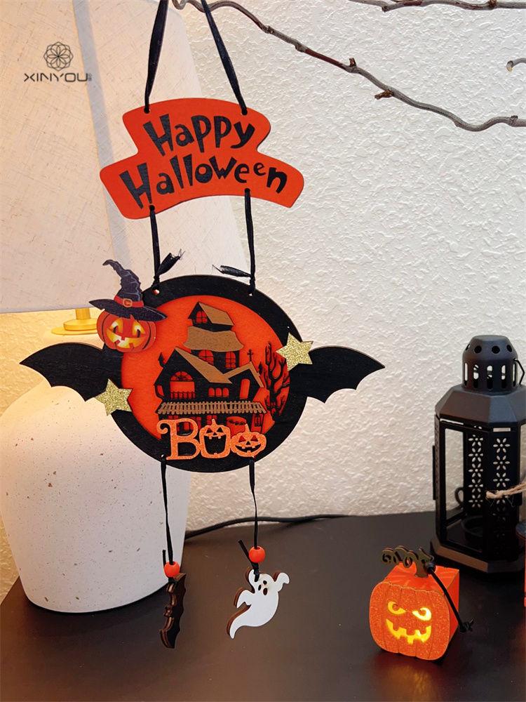 1 bat haunted house wooden door pendant, 1 pumpkin wooden door pendant