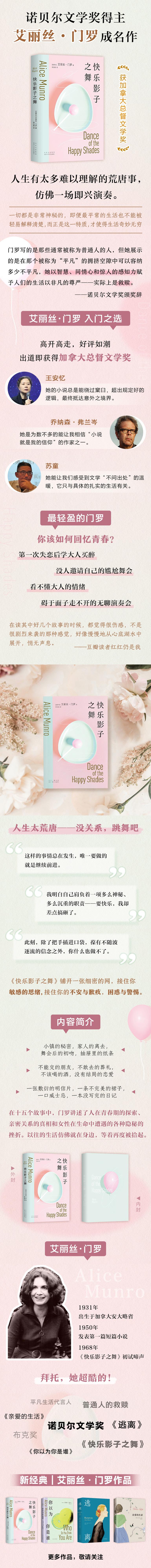Nacido en Ontario, Canadá en 1931, hizo su debut con A Dance of Happy Shadows en 1968. Ha publicado 14 colecciones de cuentos hasta ahora, y ha ganado el Premio del Gobernador General, el Premio Giller, el Premio de Escritores de la Commonwealth, el Premio del Círculo Nacional de Críticos de Libros, etc. Ganó el 3er Premio Booker en 2009 y el Premio Nobel de Literatura en 2013. Sus obras representativas incluyen Get Out, Dear Life, y Who Do You Think You Are?