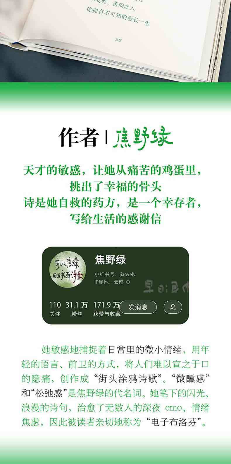 "Jiao Yelu es una bloguera de poesía en Xiaohongshu y una joven poeta nacida después de 1995. Ha colaborado con CCTV para convertirse en un tema candente, ha realizado exposiciones fuera de línea en todo el país y ha sido entrevistada y reportada por muchos medios conocidos como The Paper. Captura sensiblemente las emociones sutiles de la vida diaria y utiliza un lenguaje joven y métodos vanguardistas para crear "poesía de grafiti callejero" que a la gente le resulta difícil expresar. "Ligeramente ebria" y "relajada" son sinónimos de Jiao Yelu. Los versos brillantes y románticos de su pluma han curado a innumerables personas del emo nocturno y la ansiedad emocional, por lo que los lectores la llaman cariñosamente "ibuprofeno electrónico". La sensibilidad de un genio le permitió sacar los huesos de la felicidad de los huevos del dolor. La poesía es su receta para la autoayuda, una carta de agradecimiento de una superviviente a la vida."