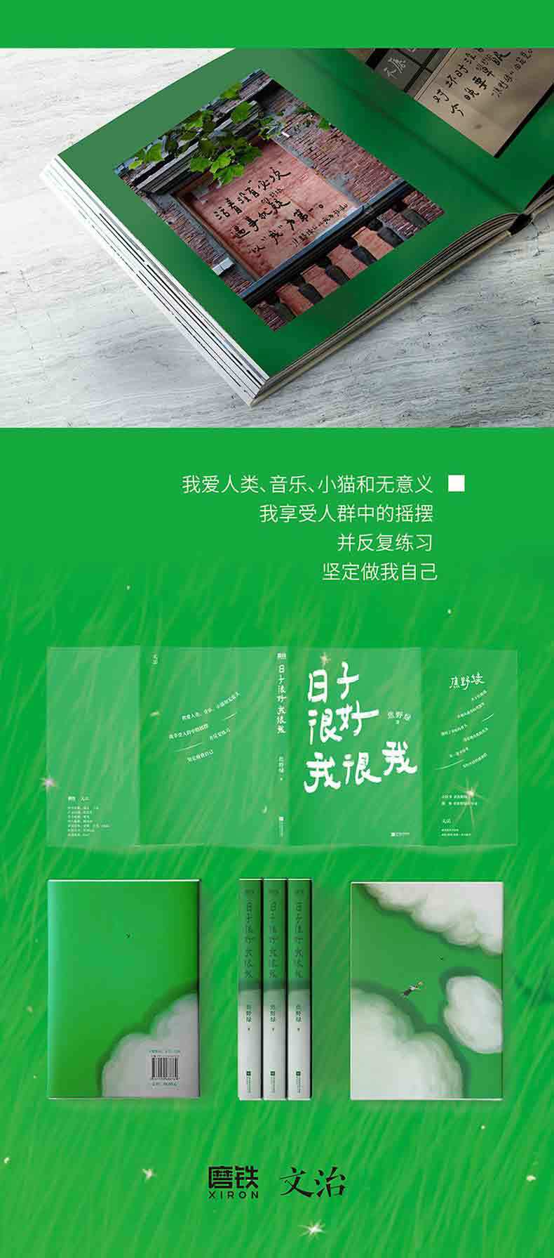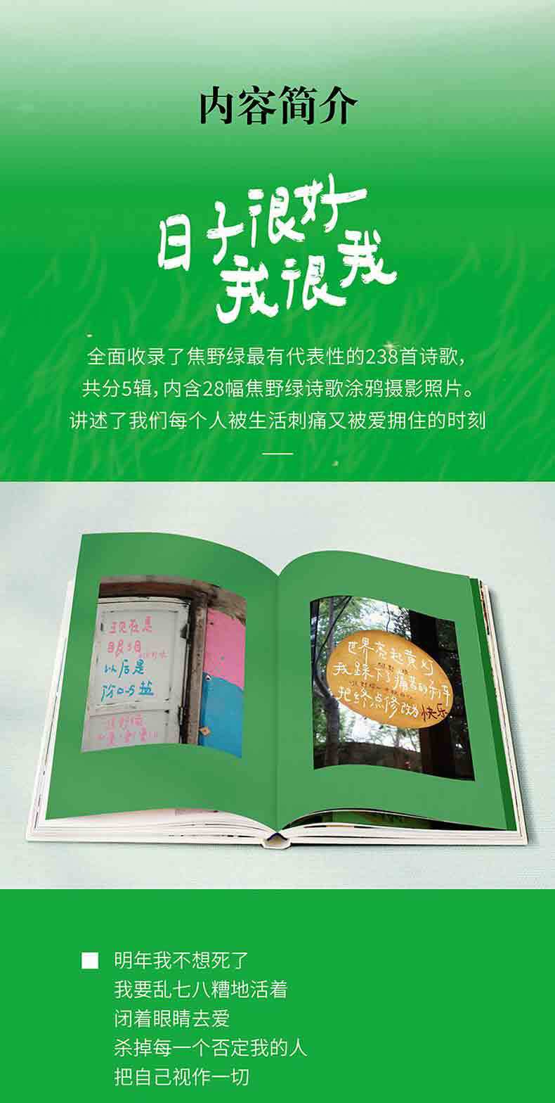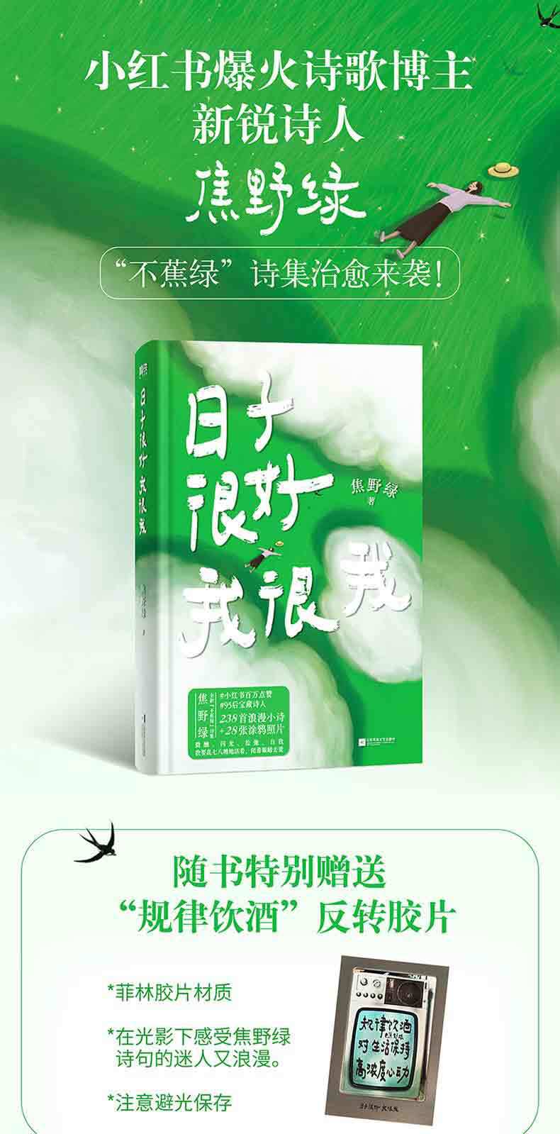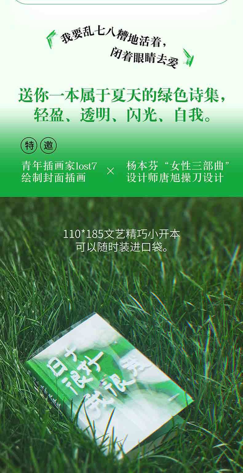 "Quiero vivir en un desastre y amar con los ojos cerrados." Jiao Yelu, una poeta joven y vanguardista que ha recibido más de un millón de 'me gusta' en Xiaohongshu, ha publicado una nueva colección de poemas sanadores llamada "No Banana Green". "La vida es buena, yo soy yo" contiene 238 poemas románticos, acompañados de 28 fotos de poesía de grafiti callejero, que cuentan los momentos en que cada uno de nosotros es herido por la vida y abrazado por el amor. Este es un pequeño libro verde lleno de transparencia. Es un pequeño libro de tapa dura, fácil de llevar. El famoso artista lost7 fue invitado especialmente a dibujar las ilustraciones de "No Banana Green". El color de tinta del texto de la página interior es verde metálico, y la portada está hecha de material transparente, llena del aliento fresco del verano.