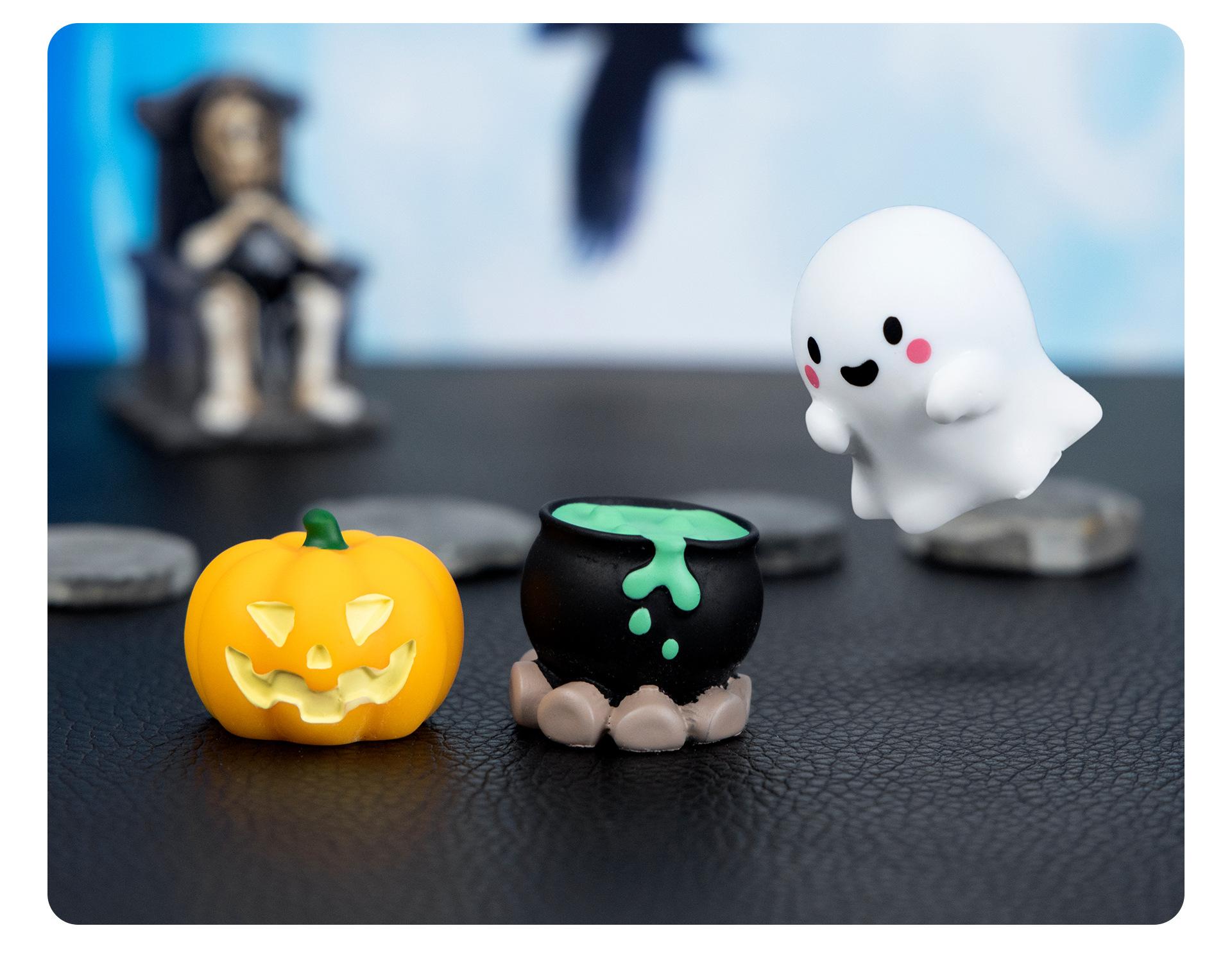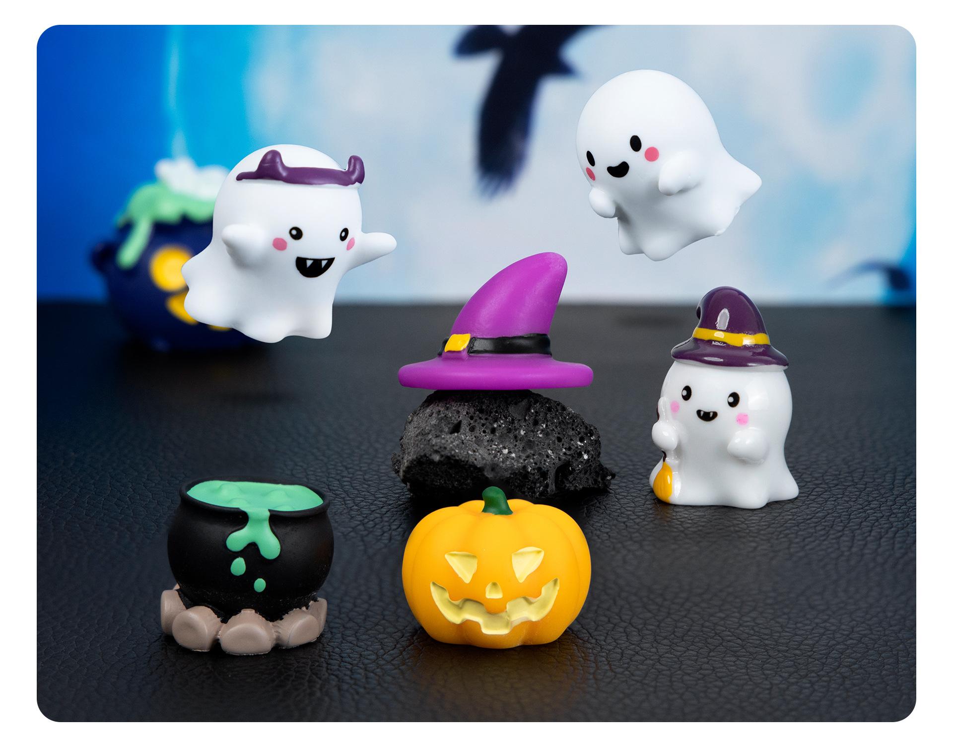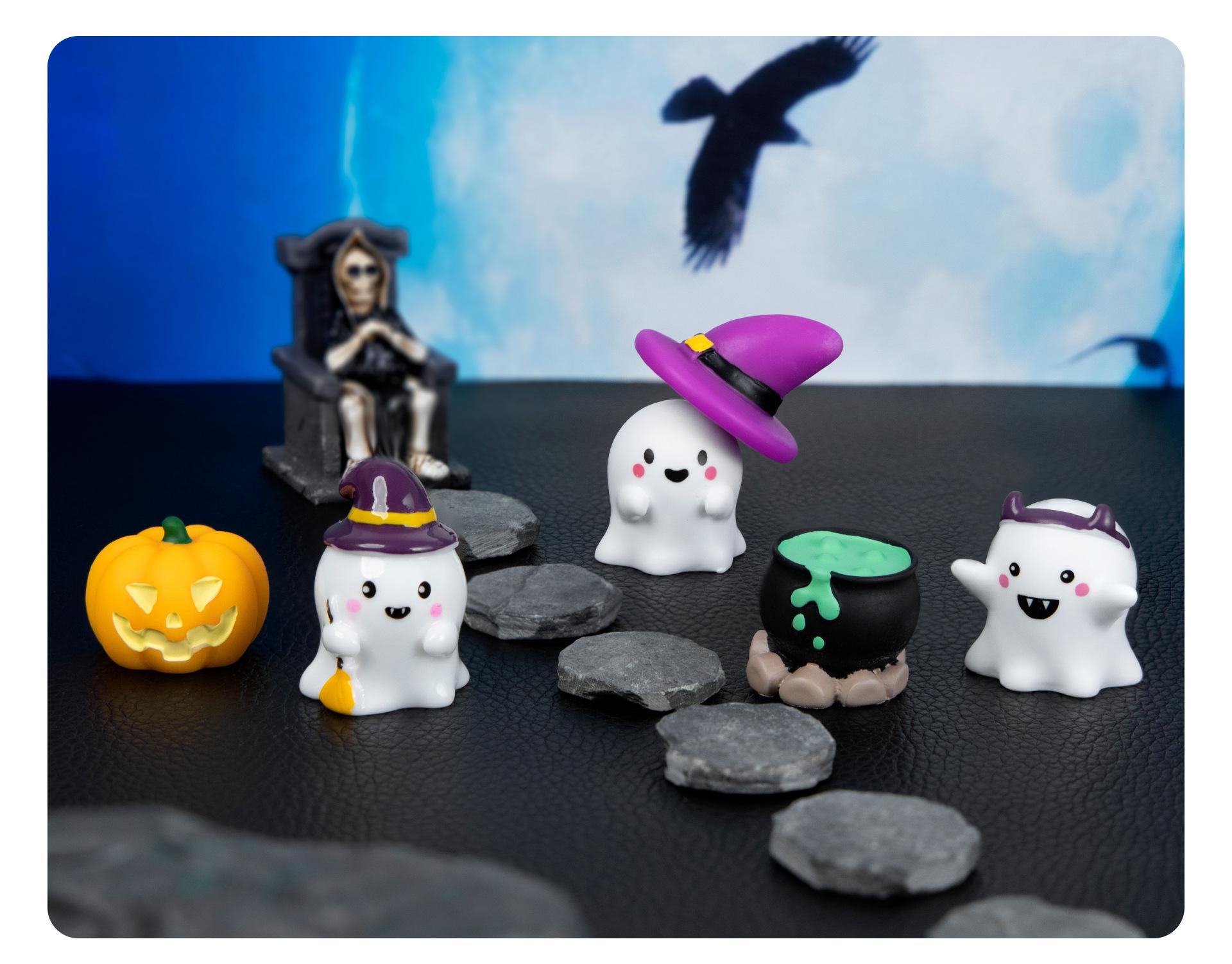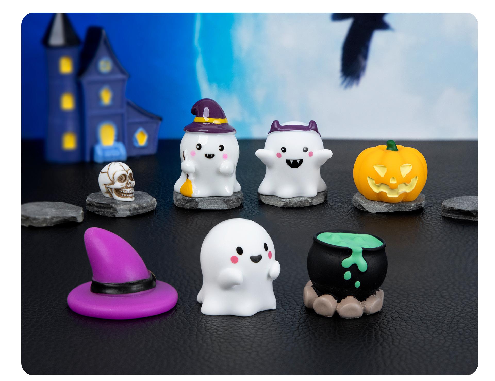 Purple magic hat, Green potion, Headband ghost, Bald ghost, Grin pumpkin, Sweeping ghost