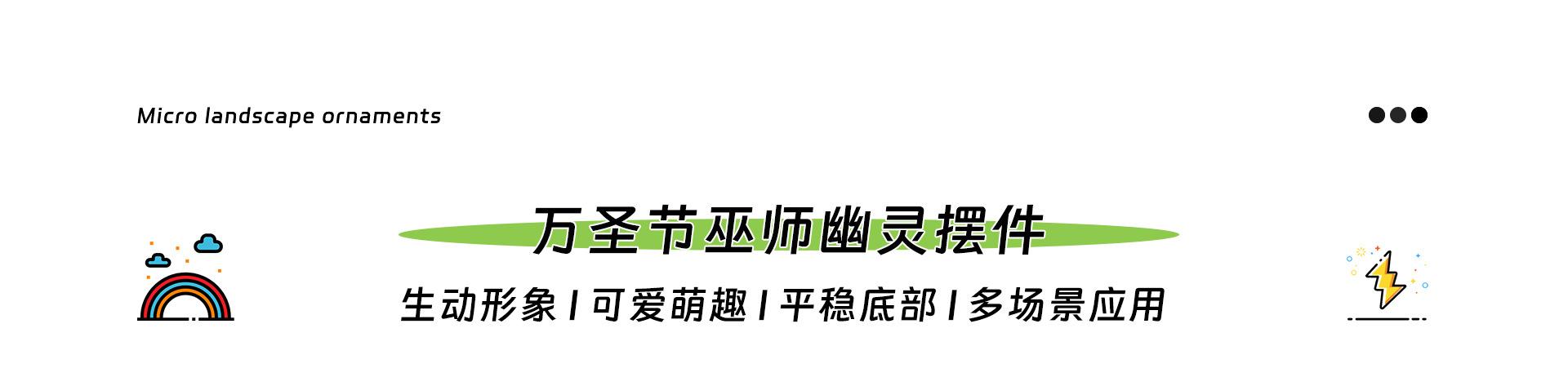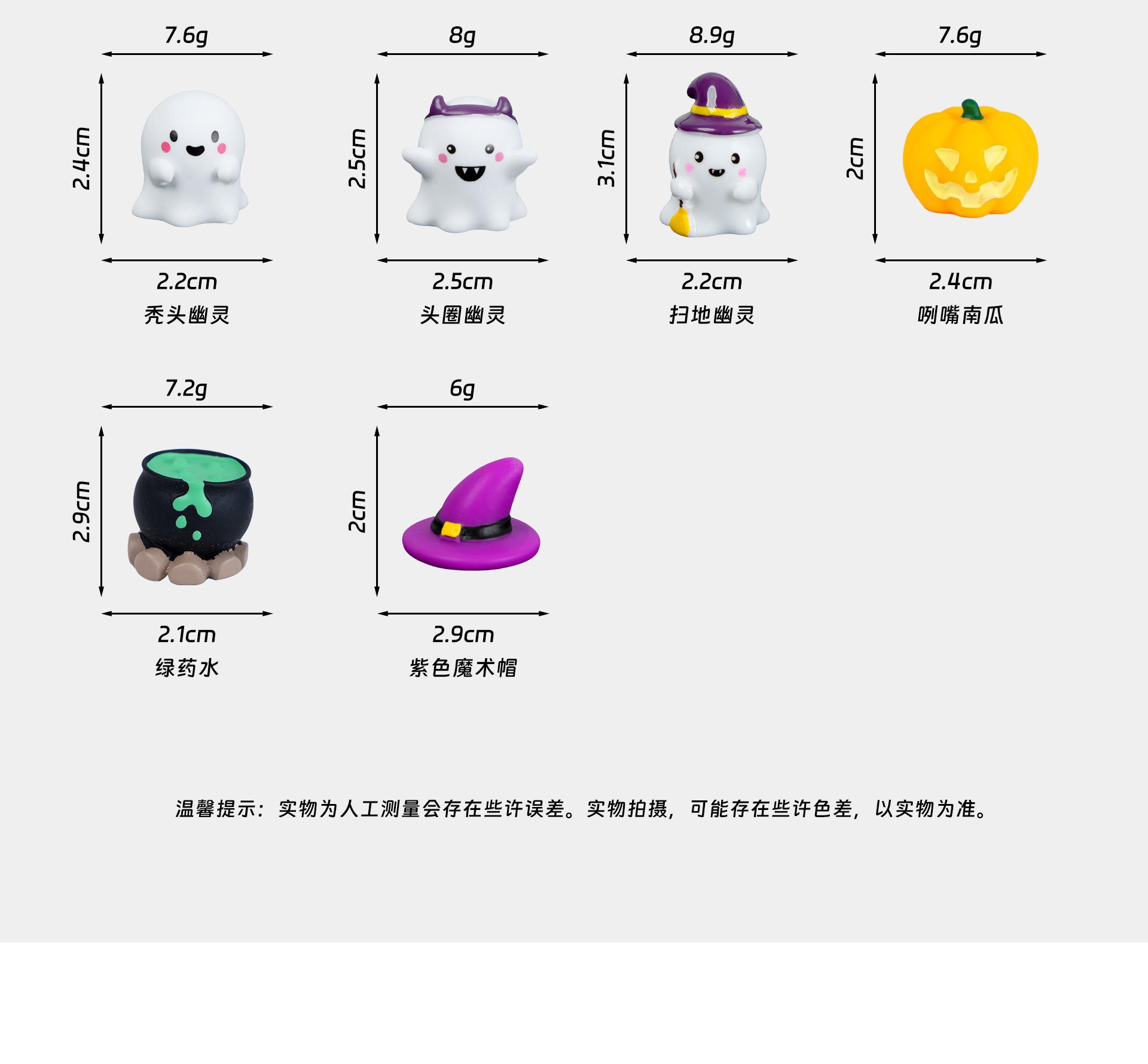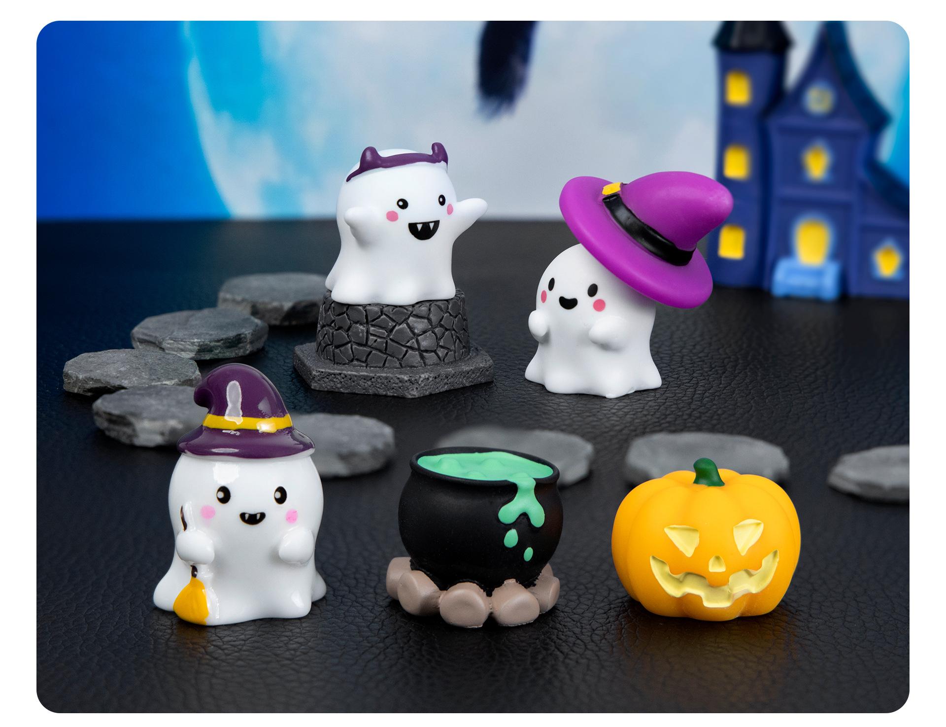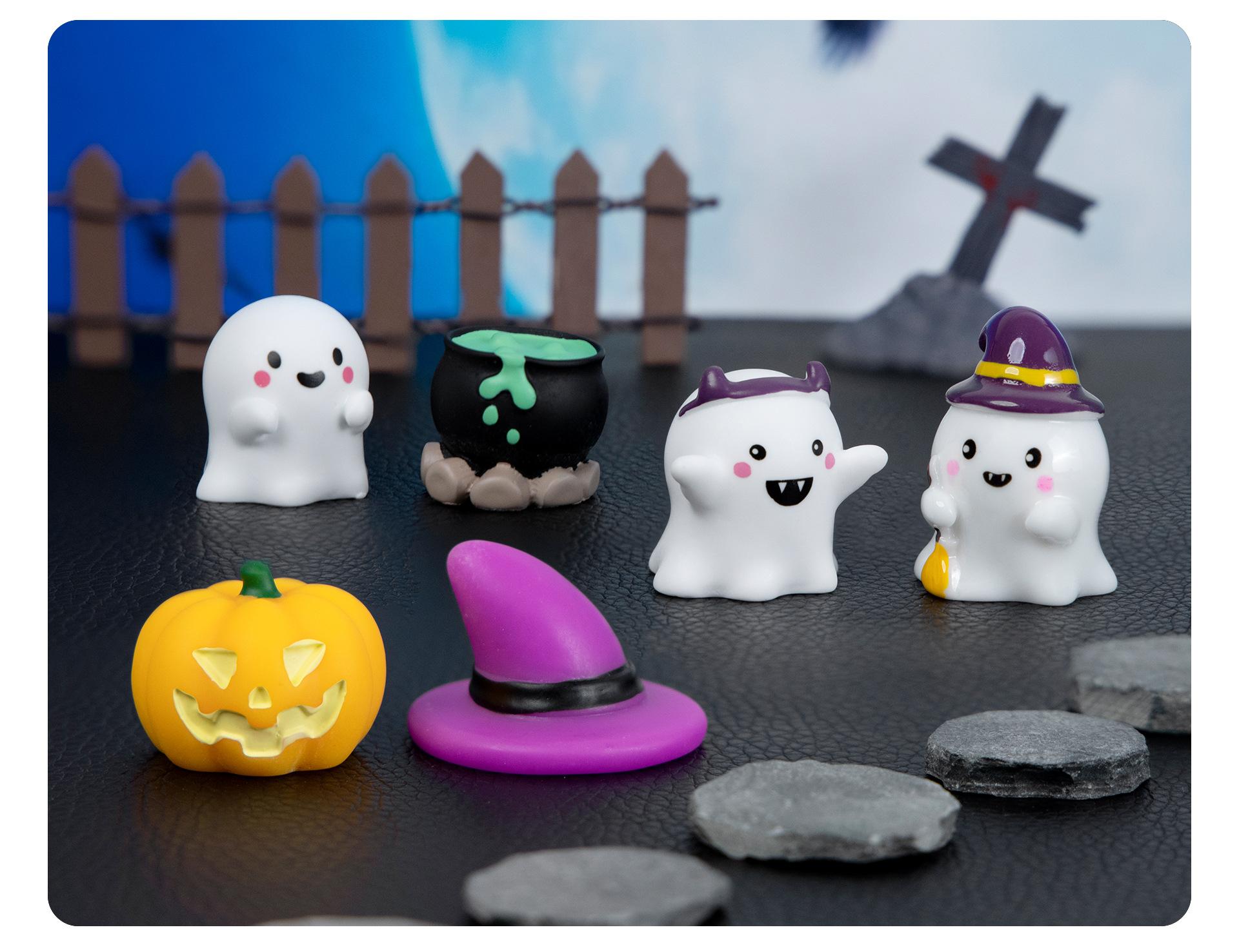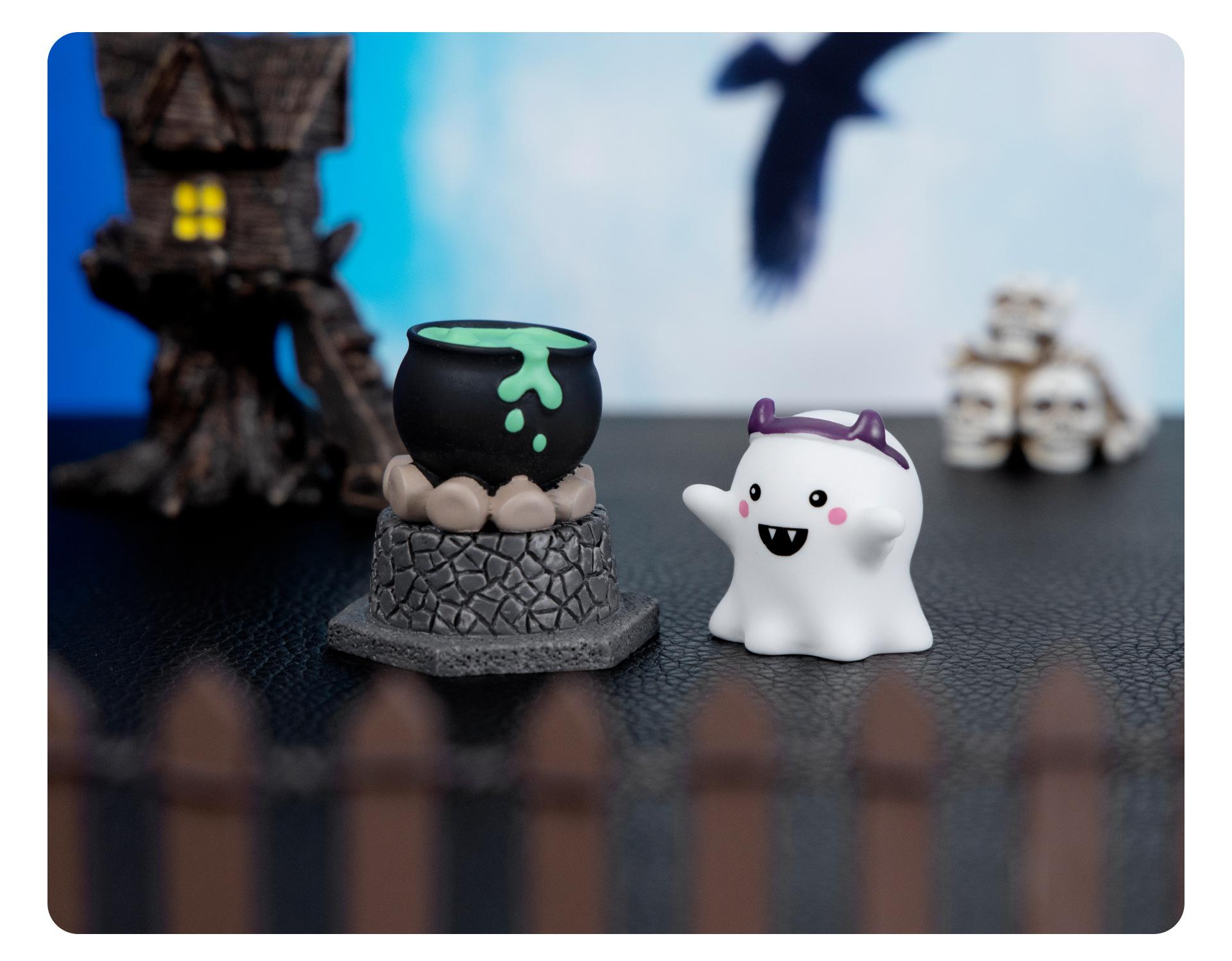 Purple magic hat, Green potion, Headband ghost, Bald ghost, Grin pumpkin, Sweeping ghost