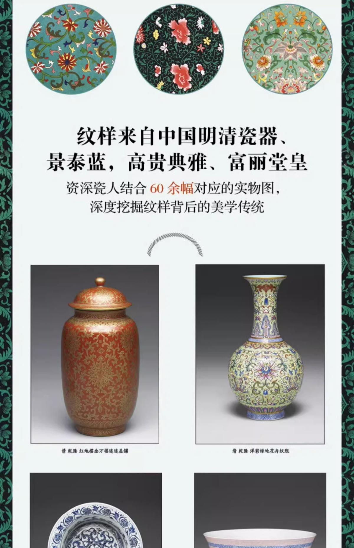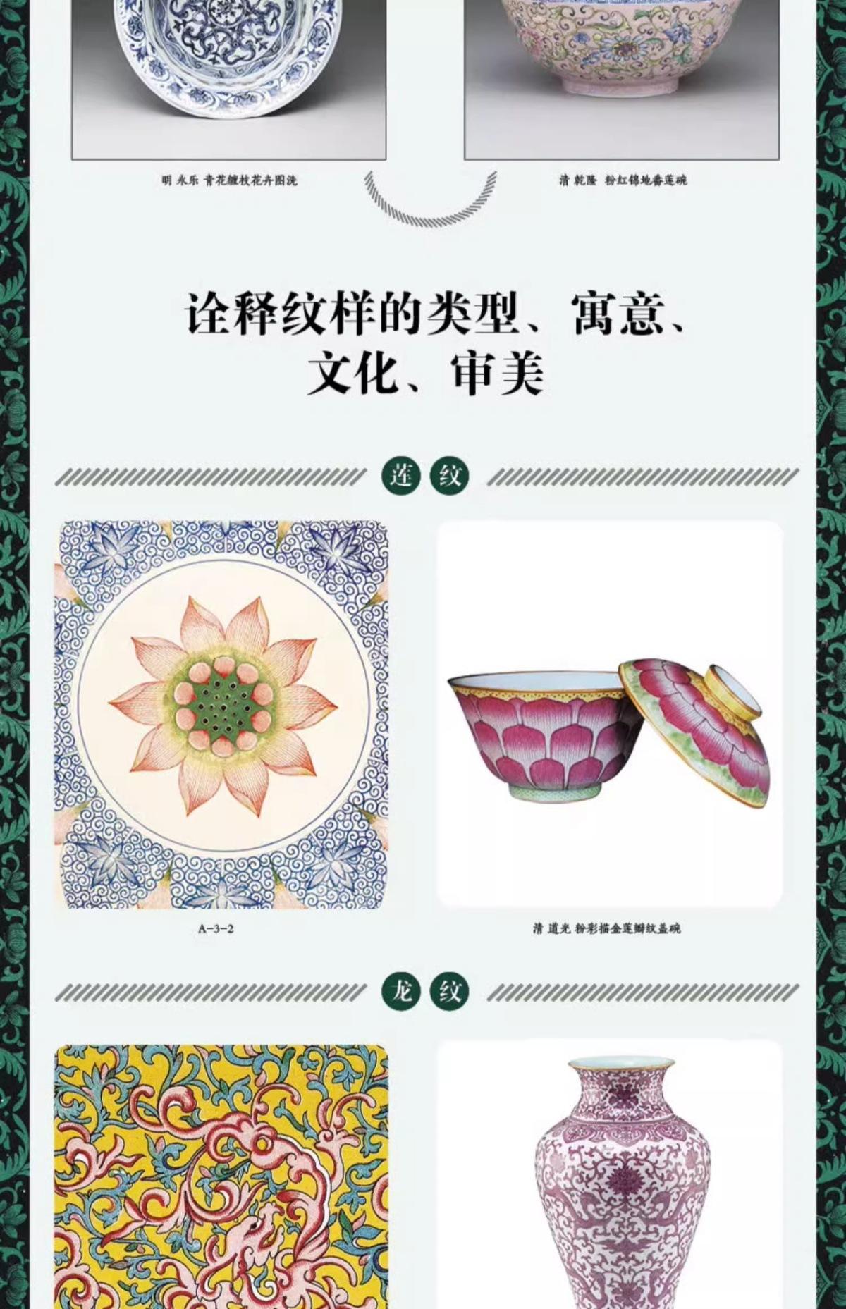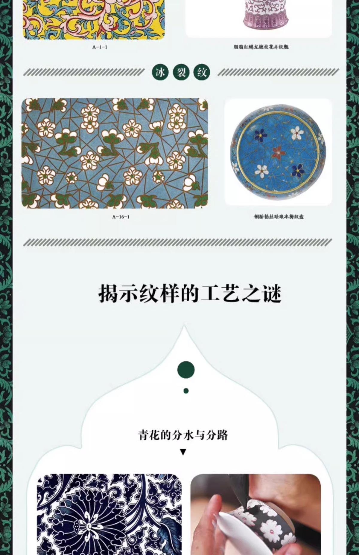 En este libro, "Patrones Chinos", se incluyen hasta 16 patrones en azul y blanco puro, 4 patrones en azul y blanco bajo cubierta roja, y al menos 5 patrones relacionados con el azul y el blanco, incluyendo el azul y blanco doucai, patrones de cinco colores, etc. La proporción de estos patrones en porcelana supera el 30 %. Los lectores interesados podrán encontrarlos fácilmente uno por uno.