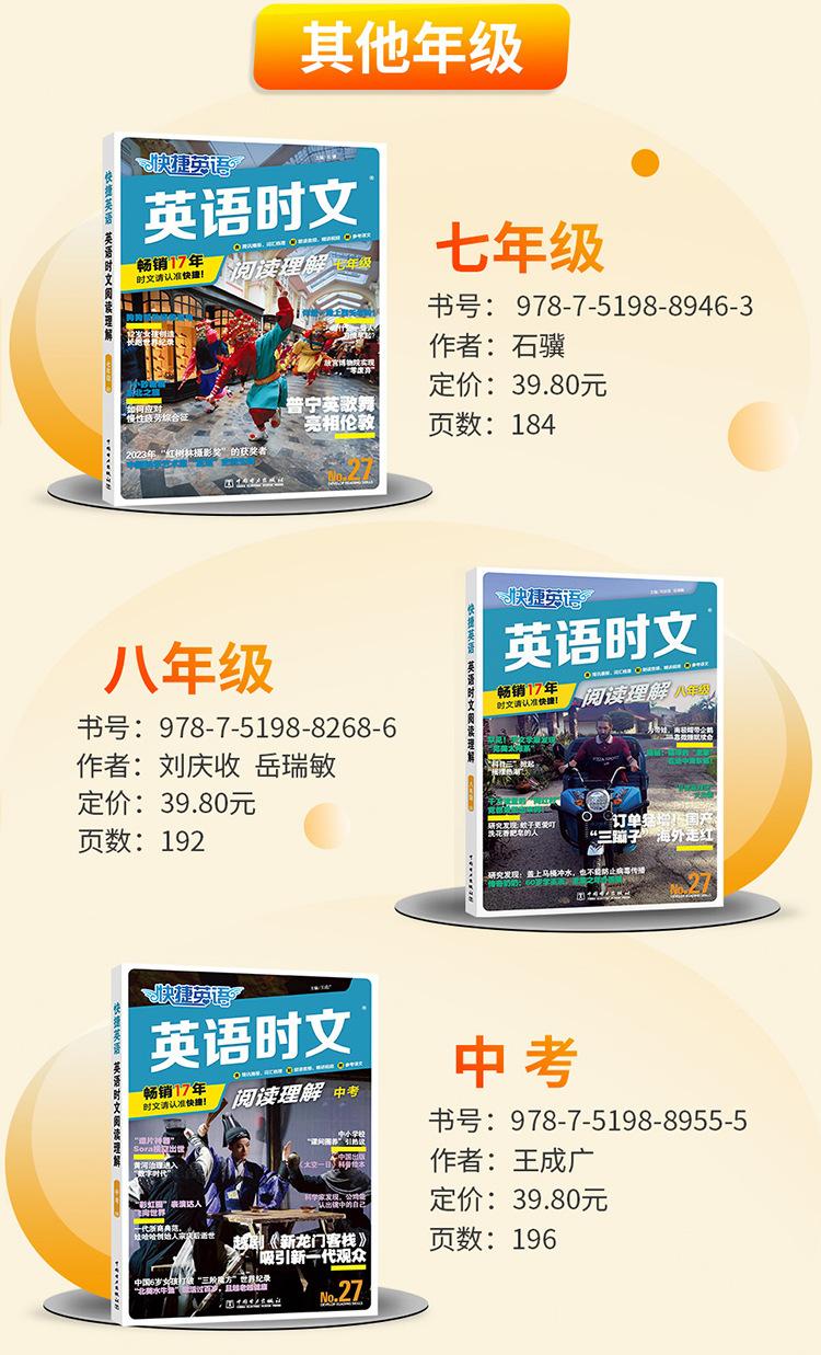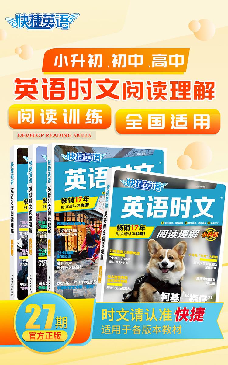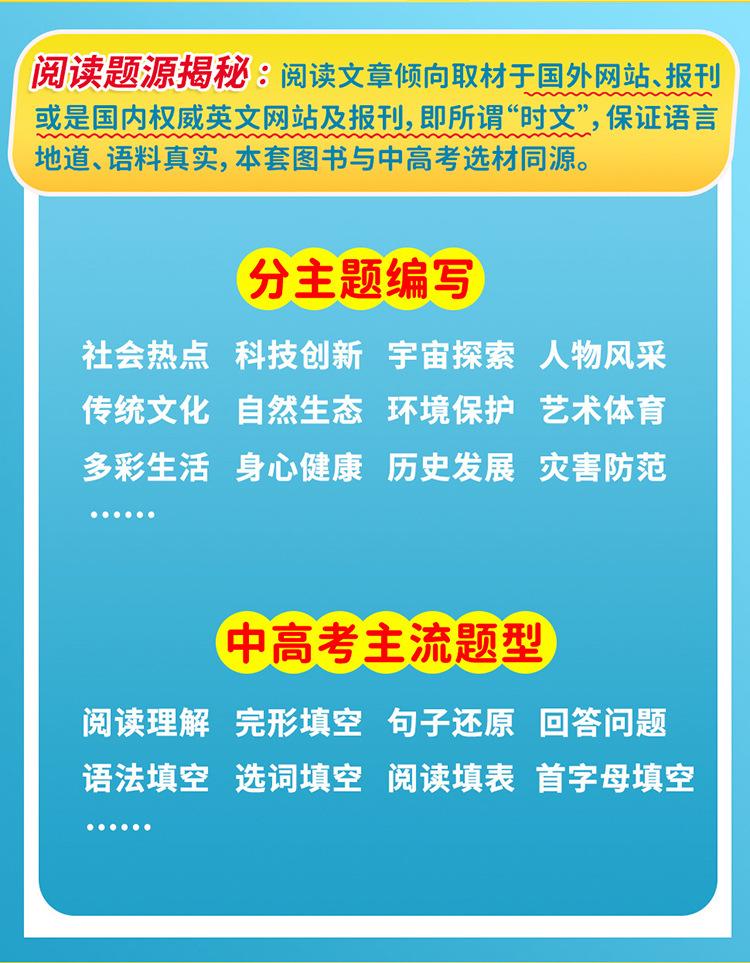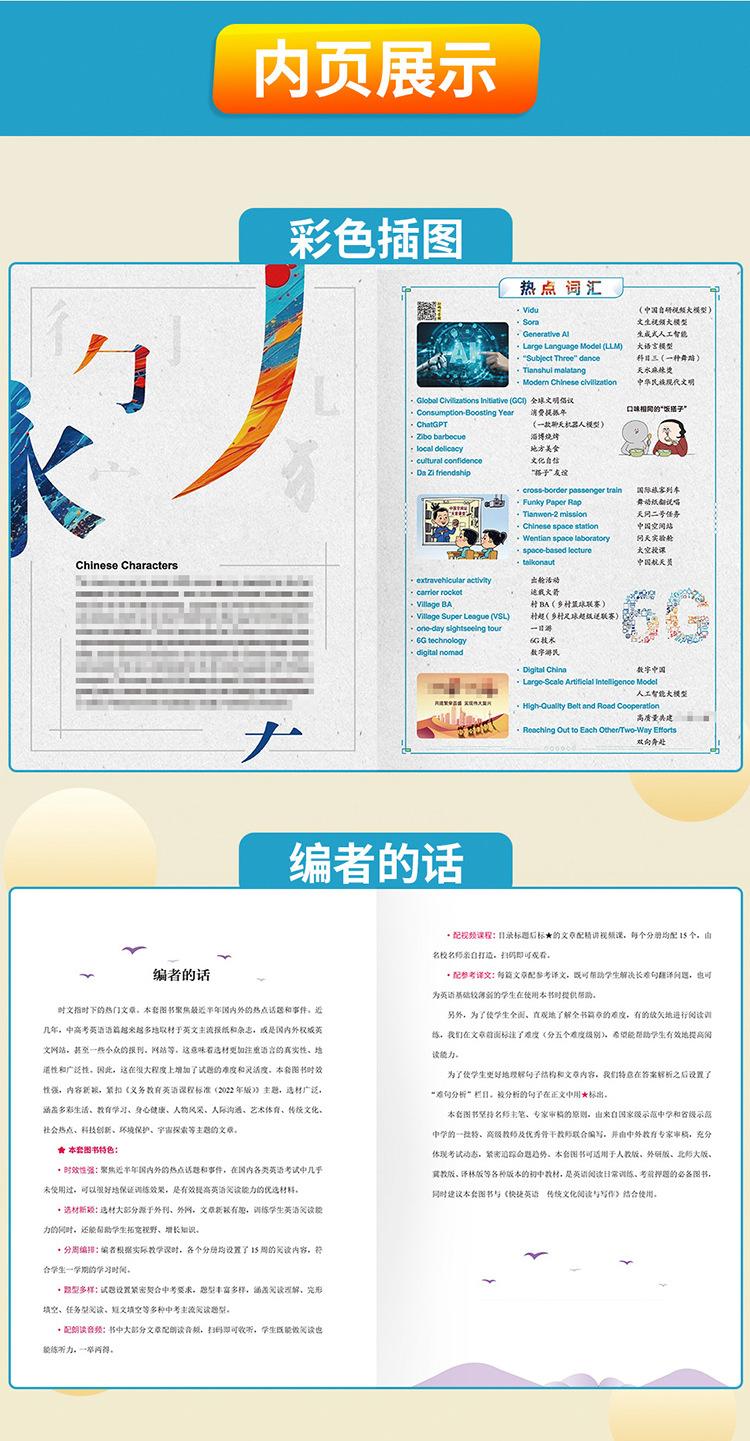 Los artículos de actualidad se refieren a artículos que son populares en el momento, es decir, "artículos que se centran en el progreso que las personas de todo el mundo han logrado en diversos campos". Los pasajes de lectura para el examen de ingreso a la escuela secundaria superior, el examen de ingreso a la universidad y varios exámenes de inglés tienden a ser tomados directamente de periódicos, revistas y libros convencionales en inglés originales, o de sitios web extranjeros en inglés. Estos artículos son consistentes con las preguntas reales del examen de ingreso a la escuela secundaria superior y del examen de ingreso a la universidad en términos de selección, estilo, tono y vocabulario y frases que aparecen con frecuencia. El contenido también está cada vez más estrechamente integrado con temas y eventos candentes actuales, incluidos eventos noticiosos populares, progreso científico y tecnológico y figuras de energía positiva en los corazones del pueblo chino. "Lectura Rápida de Artículos de Actualidad en Inglés" se ha publicado durante 17 años consecutivos. Los autores son todos profesores especiales de primera línea con muchos años de experiencia en la preparación para el examen de ingreso a la escuela secundaria superior y el examen de ingreso a la universidad. Cada año, pueden predecir las preguntas reales del examen de ingreso a la escuela secundaria superior y del examen de ingreso a la universidad en varios lugares, como predecir la prueba cloze del Examen de Ingreso a la Universidad de Primavera de Zhejiang en 2024, predecir las preguntas de lectura del examen de ingreso a la escuela secundaria superior en una determinada ciudad de Zhejiang (Jiaxing, Zhoushan) y otros lugares en 2023, predecir las preguntas de lectura del examen de ingreso a la escuela secundaria superior en una determinada ciudad de Jiangsu (Taizhou) y otros lugares en 2022, predecir las preguntas de lectura del examen de ingreso a la escuela secundaria superior en una determinada ciudad de Hubei (Jingzhou) y otros lugares en 2021, y predecir las preguntas de lectura del examen de ingreso a la escuela secundaria superior en una determinada ciudad del noreste de China (Jinzhou, Liaoning) y otros lugares en 2020. De hecho, no son predicciones, sino que estas preguntas reales del examen de ingreso a la escuela secundaria superior son directamente de o adaptadas de esta serie de libros "Lectura Rápida de Artículos de Actualidad en Inglés". Hay muchos más, que no se enumerarán uno por uno. Para más detalles, consulte el anexo. "Lectura Rápida de Artículos de Actualidad en Inglés" utiliza los periódicos, revistas y libros convencionales originales en inglés como fuente de preguntas, y la selección se centra en los puntos clave, temas candentes y eventos actuales nacionales y extranjeros, y las preguntas son originales para garantizar buenos efectos de entrenamiento y predicción. El número 27 de "Lectura Rápida de Artículos de Actualidad" continúa manteniendo este concepto de escritura. Los artículos se mantienen al día con los tiempos y el contenido es novedoso e interesante, tales como: "Artefacto para hacer películas" Sora resultó, el fundador de Wahaha Zong Qinghou falleció, los "vehículos de tres ruedas" domésticos se hicieron populares en el extranjero, el "Gansu Malatang" se hizo popular, la ópera Yue "New Dragon Inn" atrajo a una nueva generación de público, Tang Hongbo se convirtió en el astronauta chino con el tiempo de vuelo en órbita más largo, un niño con parálisis cerebral se ganaba la vida vendiendo palomitas de maíz, y la "Tía Patas de Ganso" se hizo popular.