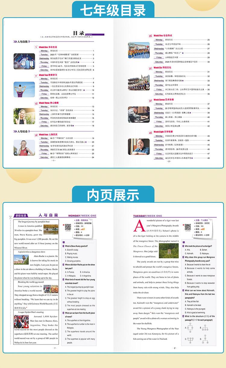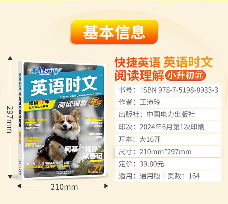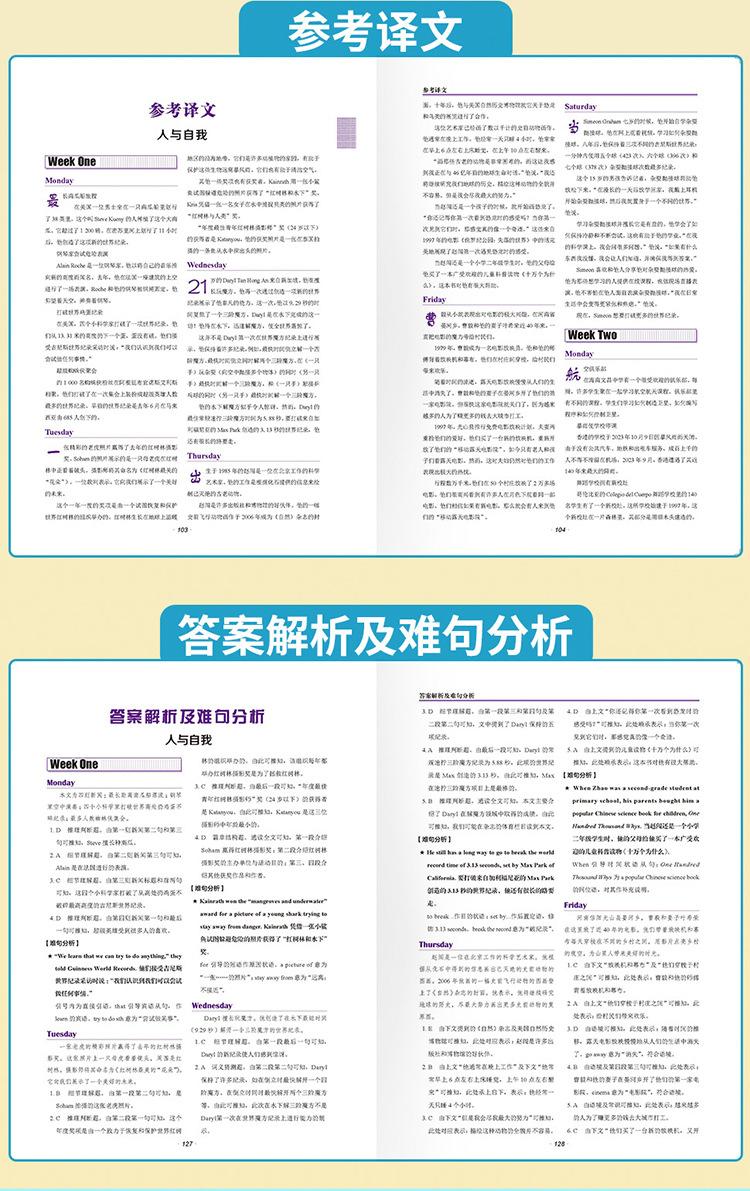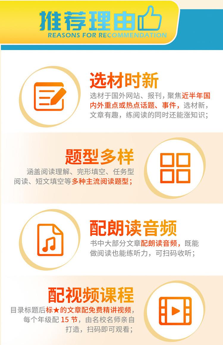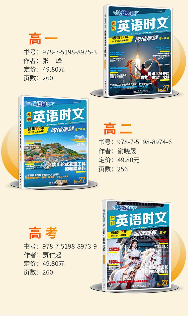 Los artículos de actualidad se refieren a artículos que son populares en el momento, es decir, "artículos que se centran en el progreso que las personas de todo el mundo han logrado en diversos campos". Los pasajes de lectura para el examen de ingreso a la escuela secundaria superior, el examen de ingreso a la universidad y varios exámenes de inglés tienden a ser tomados directamente de periódicos, revistas y libros convencionales en inglés originales, o de sitios web extranjeros en inglés. Estos artículos son consistentes con las preguntas reales del examen de ingreso a la escuela secundaria superior y del examen de ingreso a la universidad en términos de selección, estilo, tono y vocabulario y frases que aparecen con frecuencia. El contenido también está cada vez más estrechamente integrado con temas y eventos candentes actuales, incluidos eventos noticiosos populares, progreso científico y tecnológico y figuras de energía positiva en los corazones del pueblo chino. "Lectura Rápida de Artículos de Actualidad en Inglés" se ha publicado durante 17 años consecutivos. Los autores son todos profesores especiales de primera línea con muchos años de experiencia en la preparación para el examen de ingreso a la escuela secundaria superior y el examen de ingreso a la universidad. Cada año, pueden predecir las preguntas reales del examen de ingreso a la escuela secundaria superior y del examen de ingreso a la universidad en varios lugares, como predecir la prueba cloze del Examen de Ingreso a la Universidad de Primavera de Zhejiang en 2024, predecir las preguntas de lectura del examen de ingreso a la escuela secundaria superior en una determinada ciudad de Zhejiang (Jiaxing, Zhoushan) y otros lugares en 2023, predecir las preguntas de lectura del examen de ingreso a la escuela secundaria superior en una determinada ciudad de Jiangsu (Taizhou) y otros lugares en 2022, predecir las preguntas de lectura del examen de ingreso a la escuela secundaria superior en una determinada ciudad de Hubei (Jingzhou) y otros lugares en 2021, y predecir las preguntas de lectura del examen de ingreso a la escuela secundaria superior en una determinada ciudad del noreste de China (Jinzhou, Liaoning) y otros lugares en 2020. De hecho, no son predicciones, sino que estas preguntas reales del examen de ingreso a la escuela secundaria superior son directamente de o adaptadas de esta serie de libros "Lectura Rápida de Artículos de Actualidad en Inglés". Hay muchos más, que no se enumerarán uno por uno. Para más detalles, consulte el anexo. "Lectura Rápida de Artículos de Actualidad en Inglés" utiliza los periódicos, revistas y libros convencionales originales en inglés como fuente de preguntas, y la selección se centra en los puntos clave, temas candentes y eventos actuales nacionales y extranjeros, y las preguntas son originales para garantizar buenos efectos de entrenamiento y predicción. El número 27 de "Lectura Rápida de Artículos de Actualidad" continúa manteniendo este concepto de escritura. Los artículos se mantienen al día con los tiempos y el contenido es novedoso e interesante, tales como: "Artefacto para hacer películas" Sora resultó, el fundador de Wahaha Zong Qinghou falleció, los "vehículos de tres ruedas" domésticos se hicieron populares en el extranjero, el "Gansu Malatang" se hizo popular, la ópera Yue "New Dragon Inn" atrajo a una nueva generación de público, Tang Hongbo se convirtió en el astronauta chino con el tiempo de vuelo en órbita más largo, un niño con parálisis cerebral se ganaba la vida vendiendo palomitas de maíz, y la "Tía Patas de Ganso" se hizo popular.