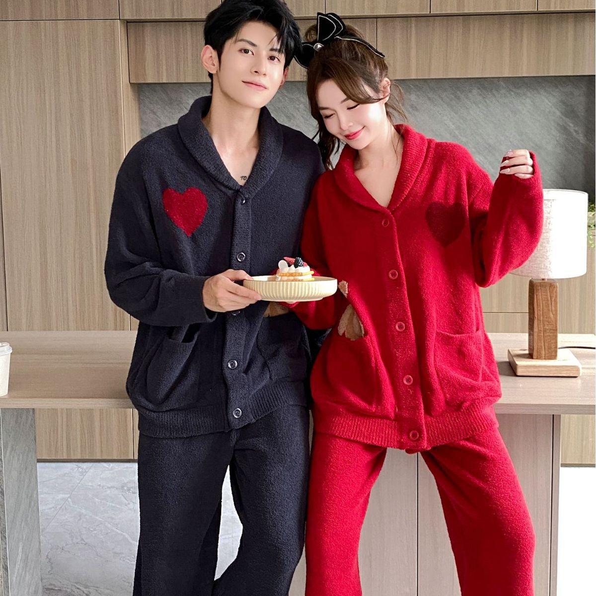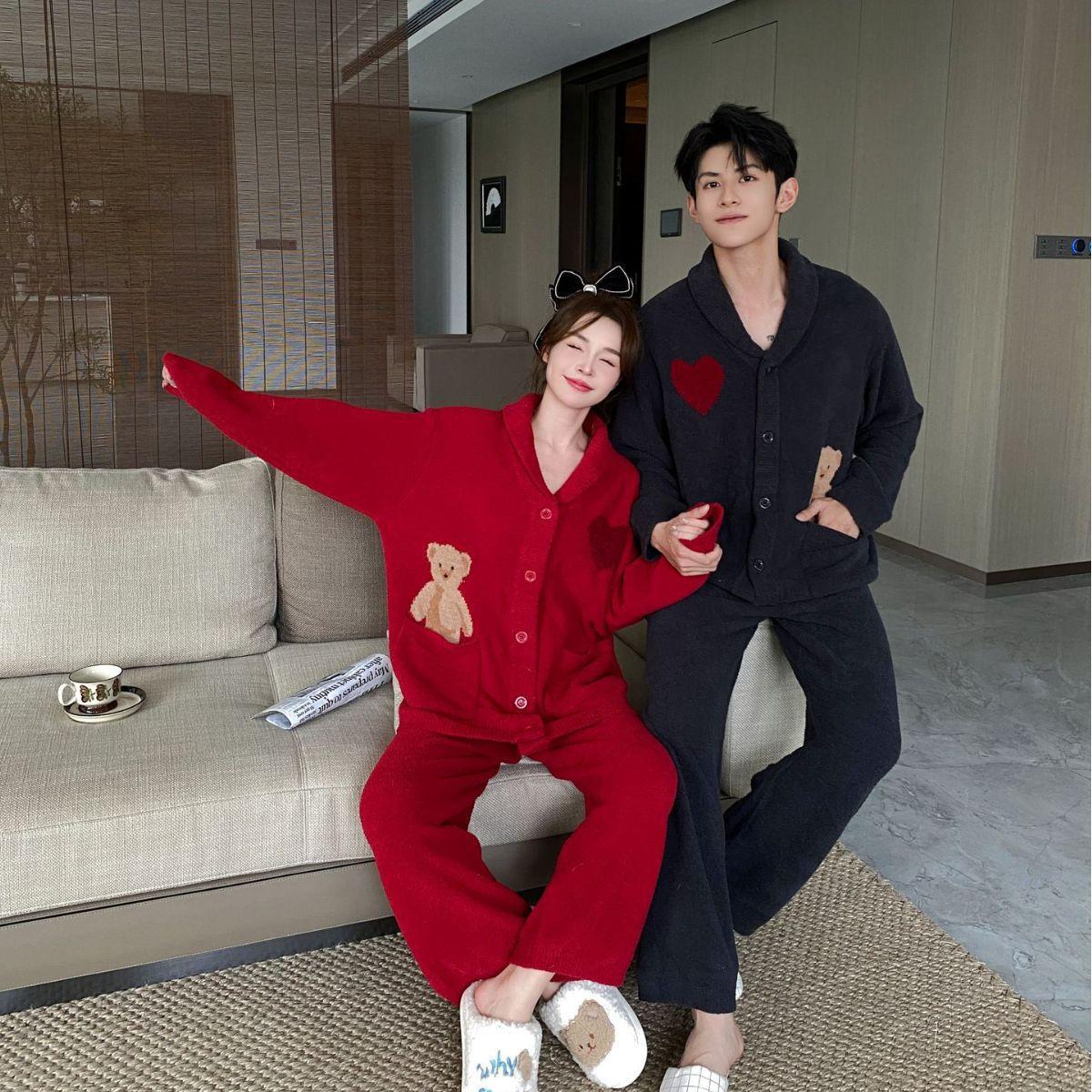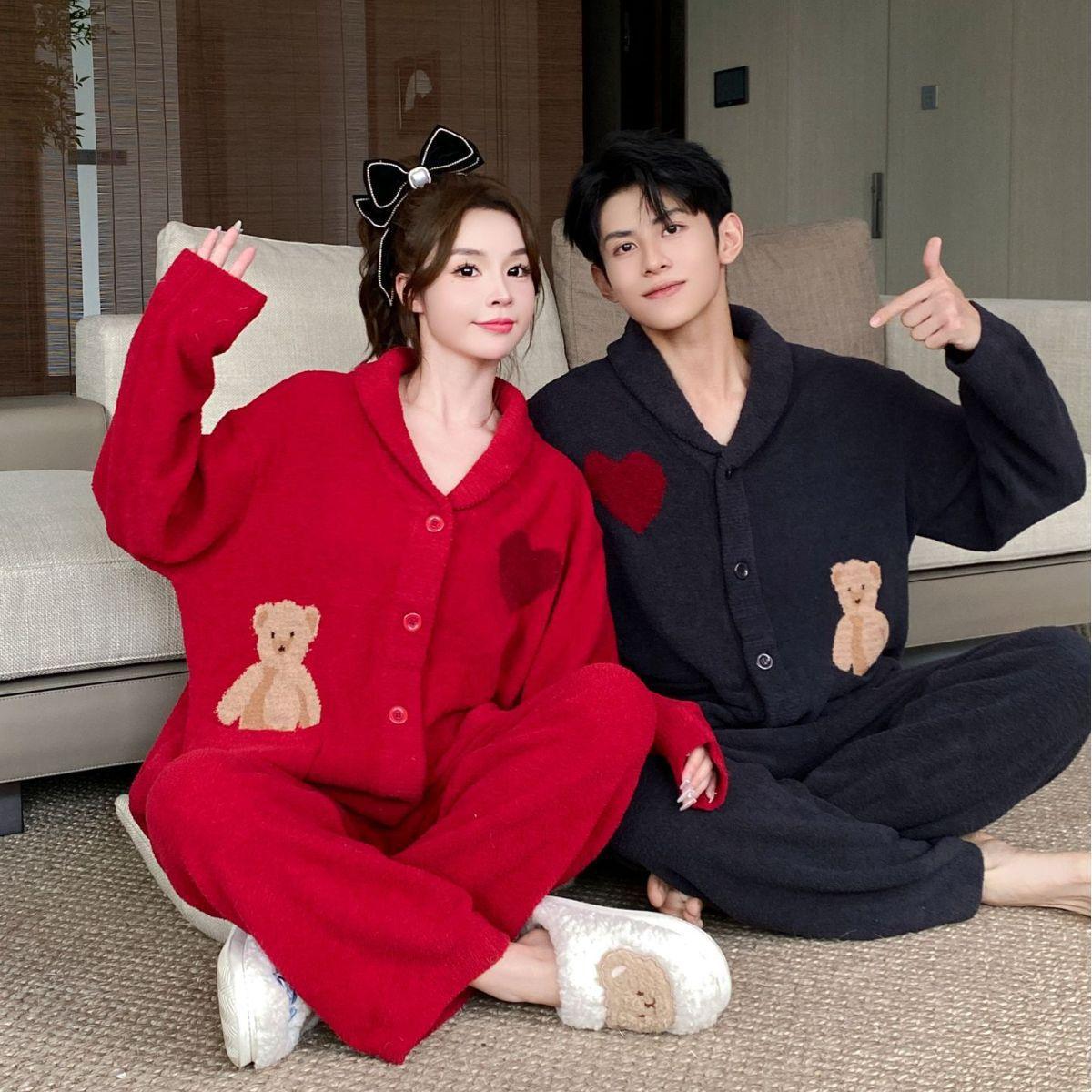 Pijama de pareja de osos de dibujos animados para mujer, de medio terciopelo, otoño e invierno, nuevo cárdigan rojo, ropa exterior cálida para hombre.