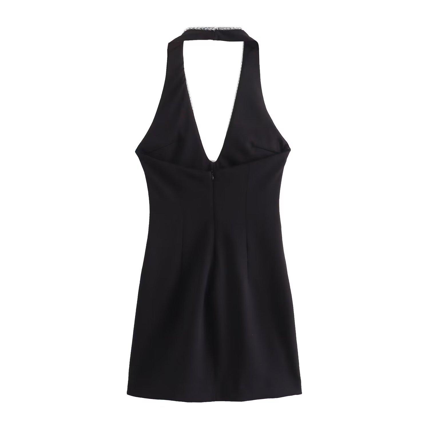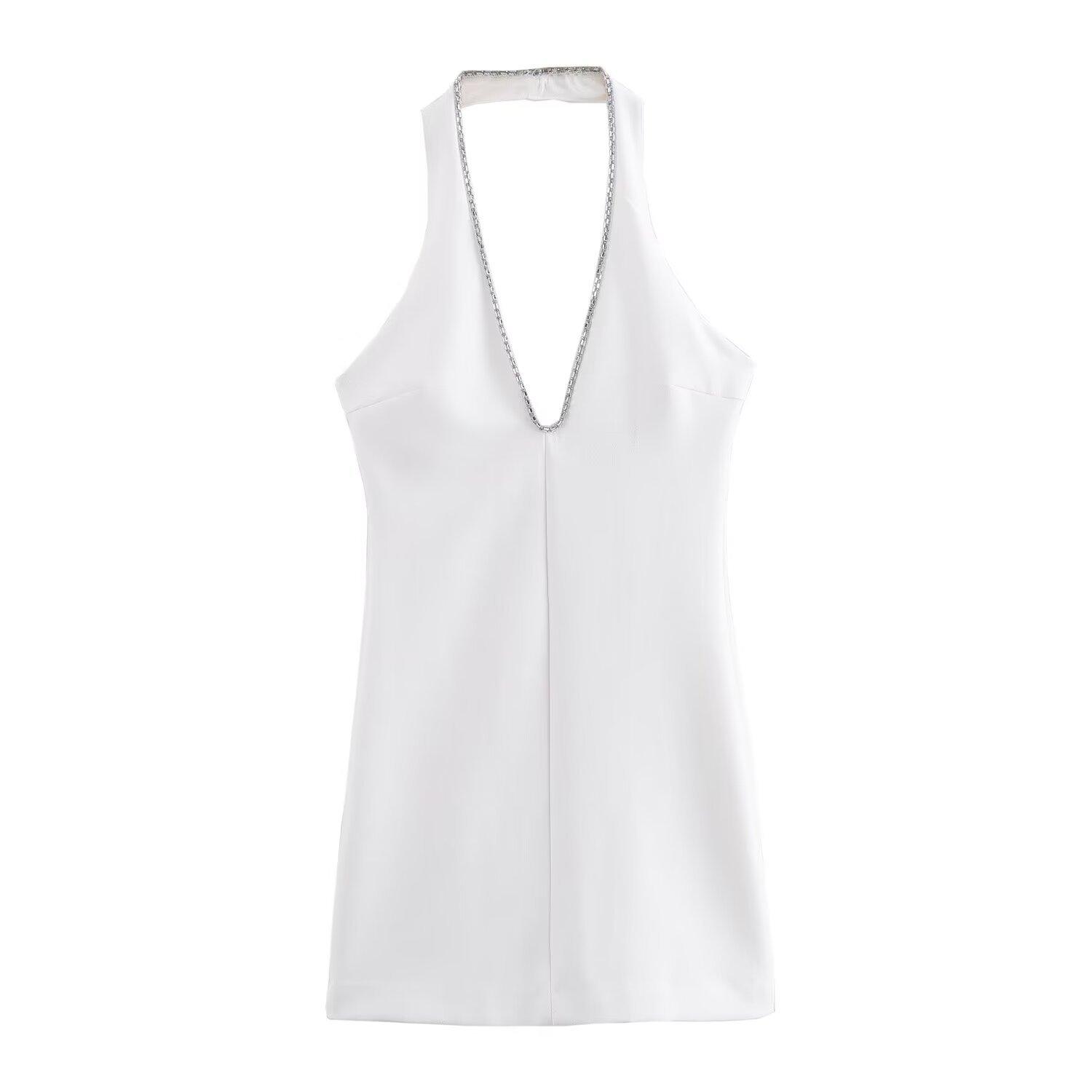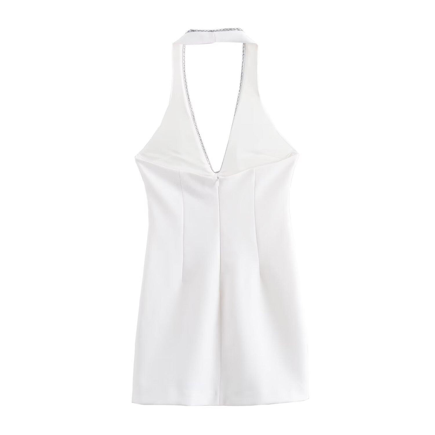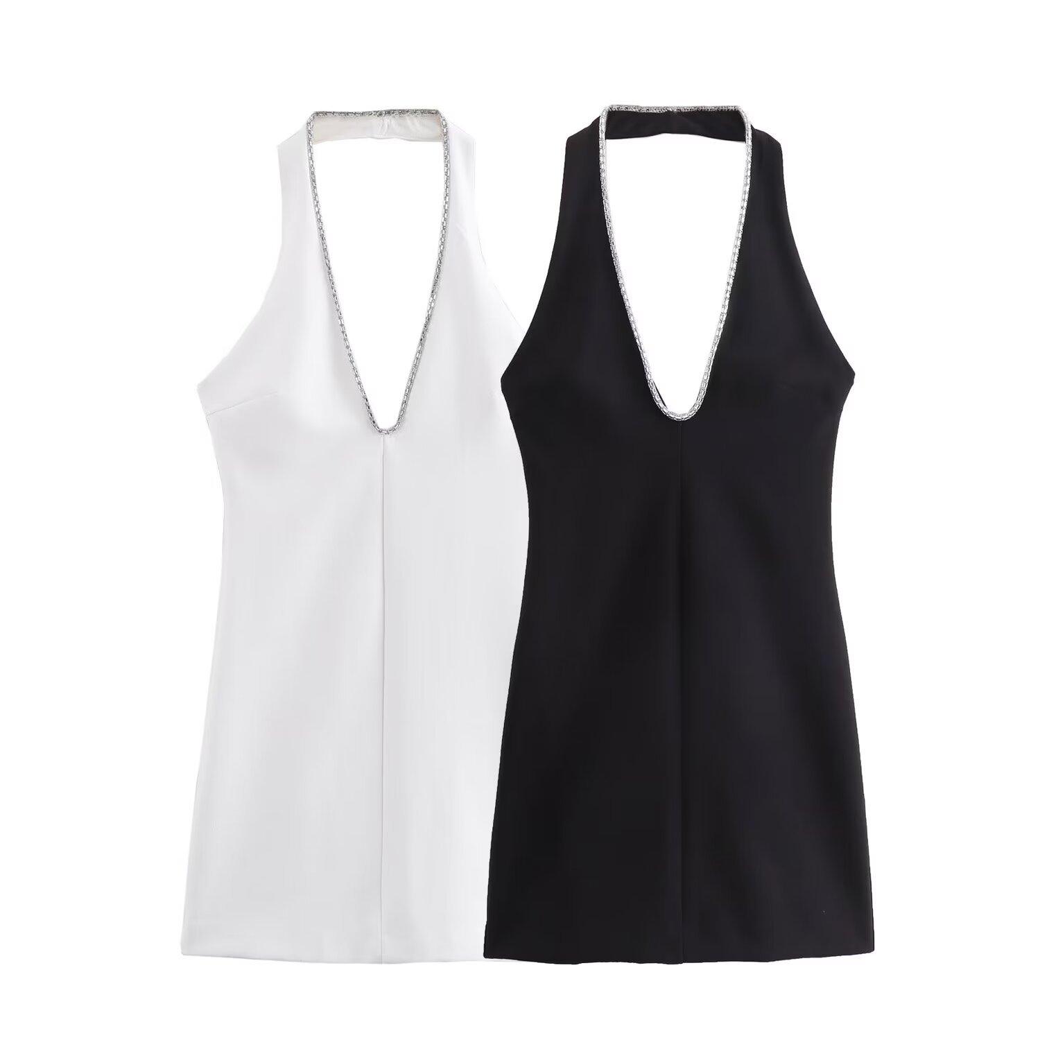 Vestido ajustado sin espalda con cuello colgante y incrustaciones de joyas de temperamento blanco y negro para mujer transfronteriza europea y americana de verano 2024