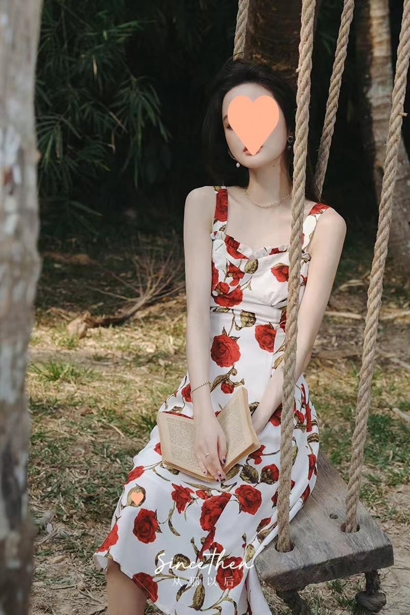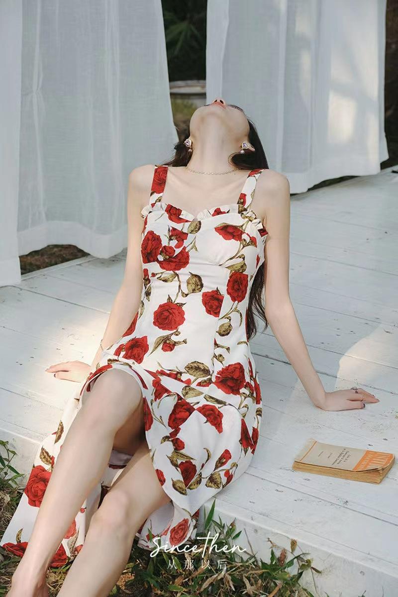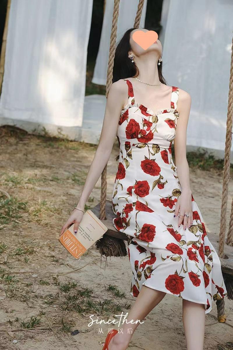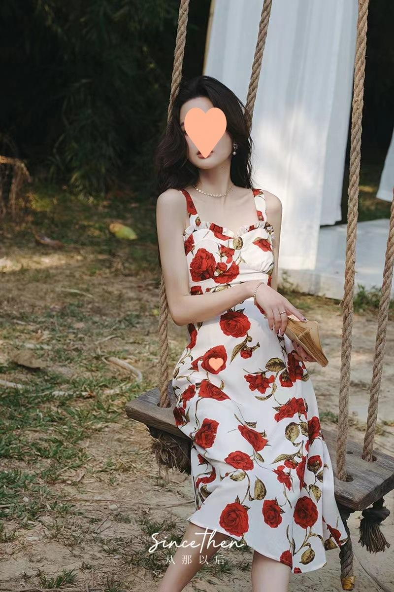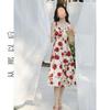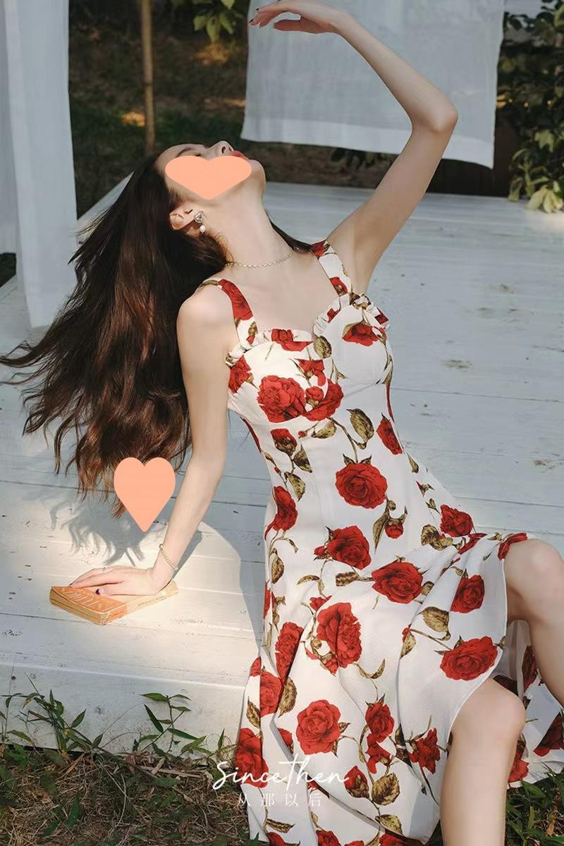 Vestido largo elegante de gasa con estampado floral estilo francés Hepburn con rosas rojas para mujer de verano