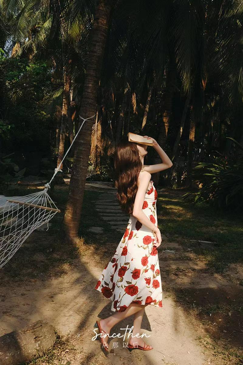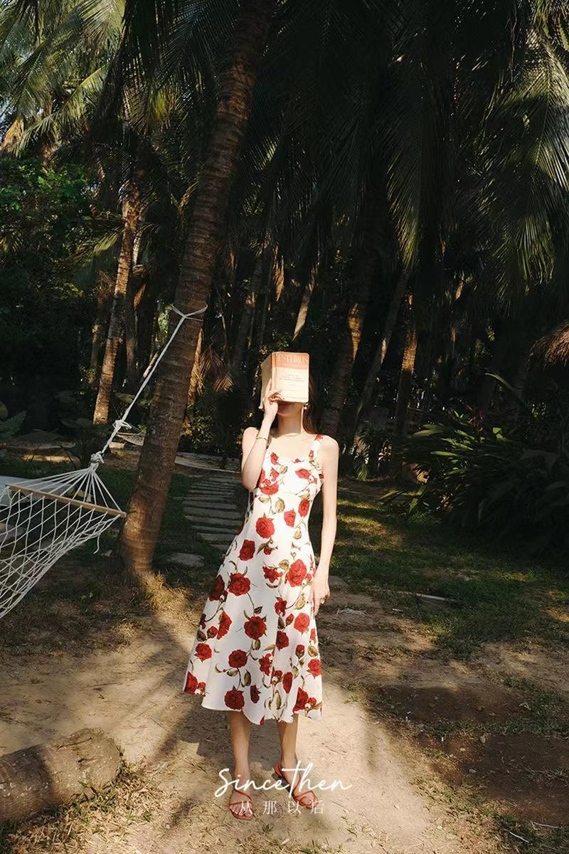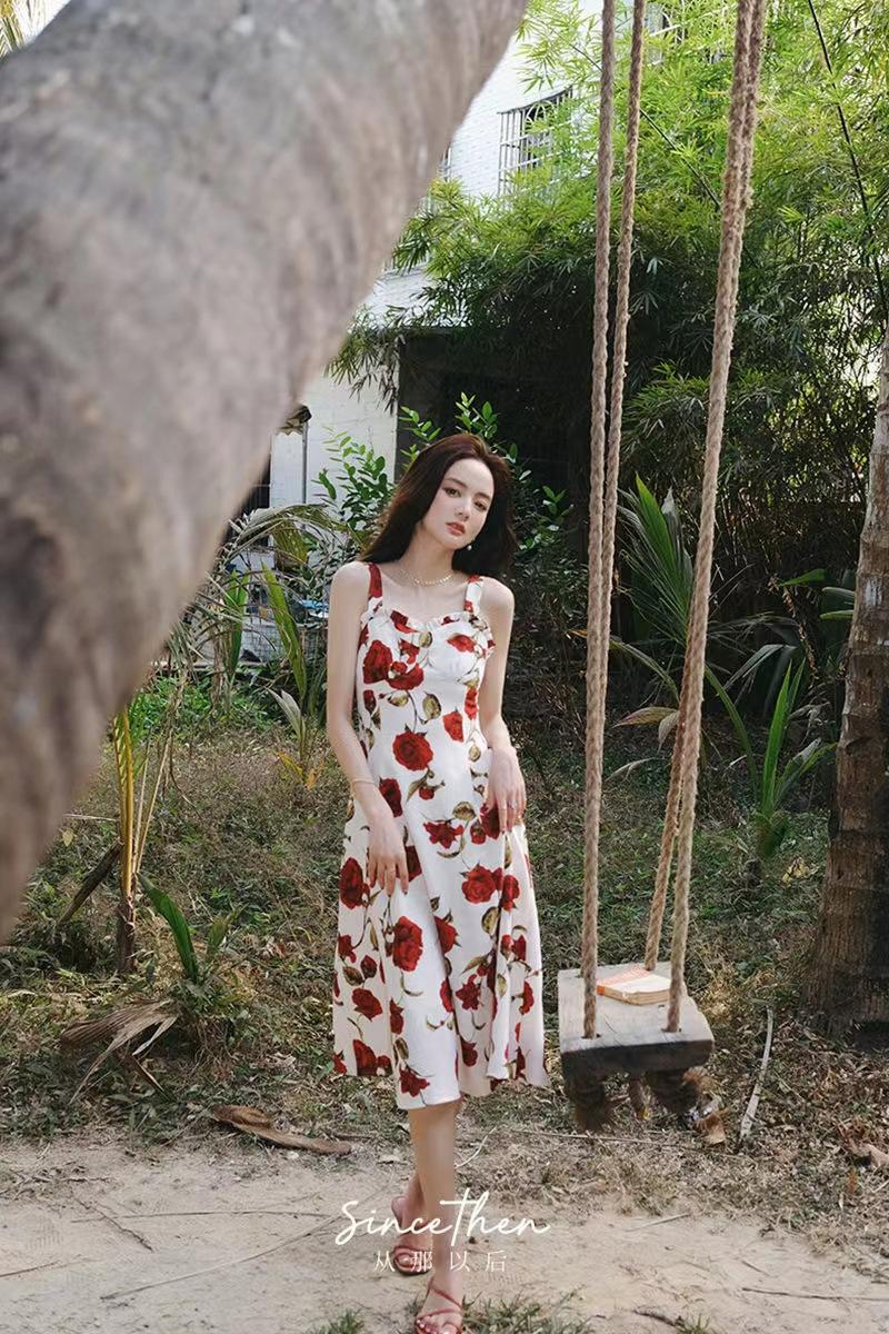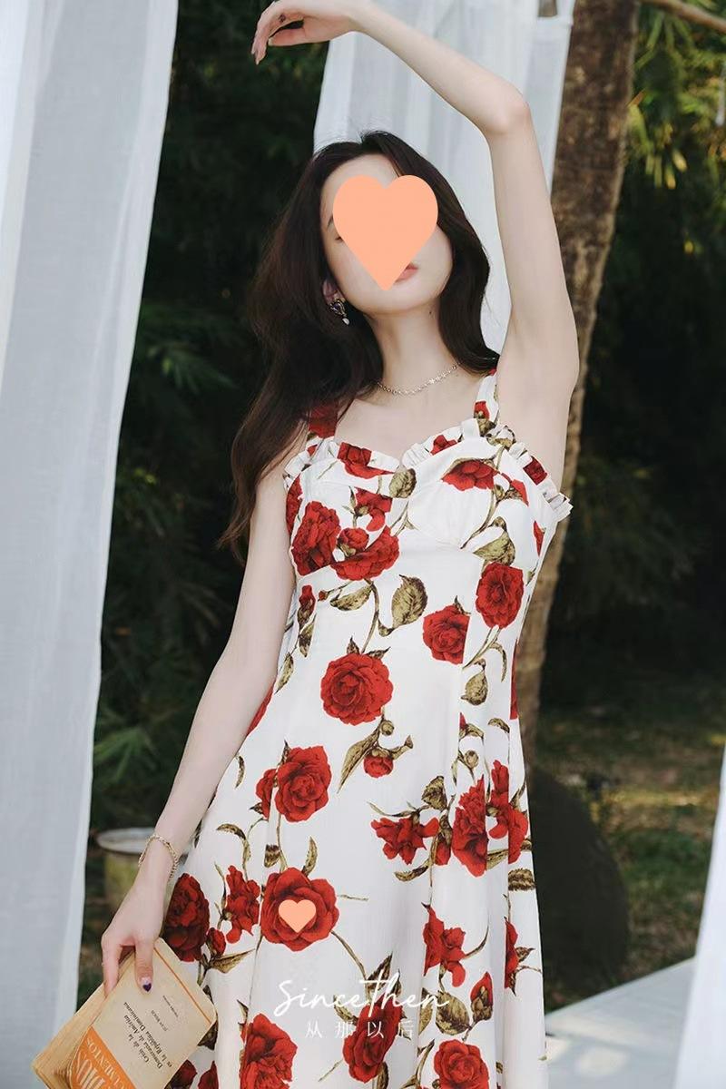 Vestido largo elegante de gasa con estampado floral estilo francés Hepburn con rosas rojas para mujer de verano