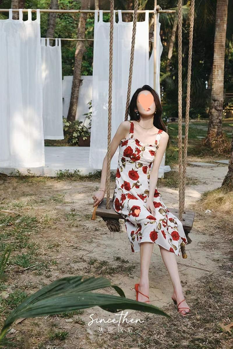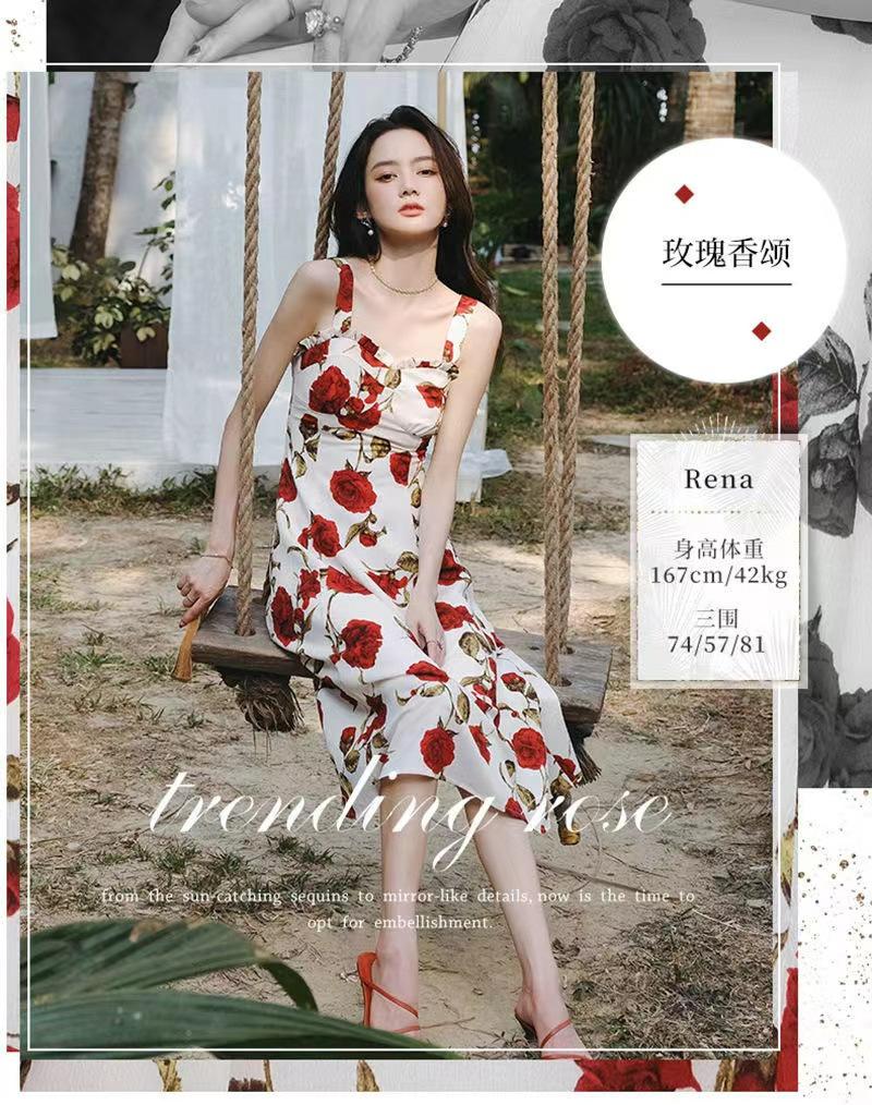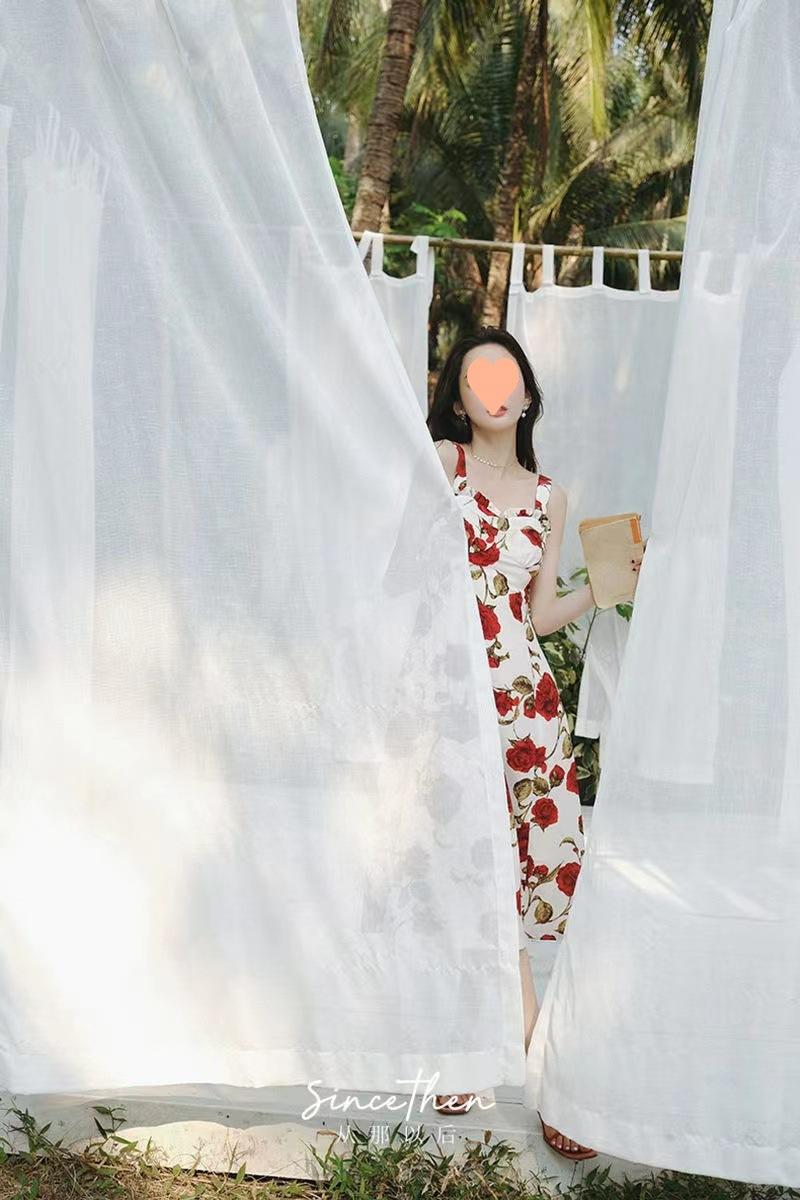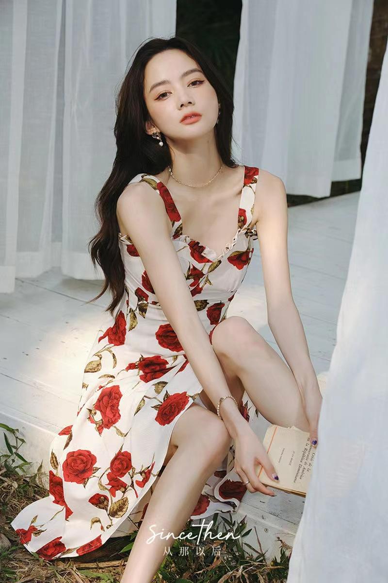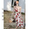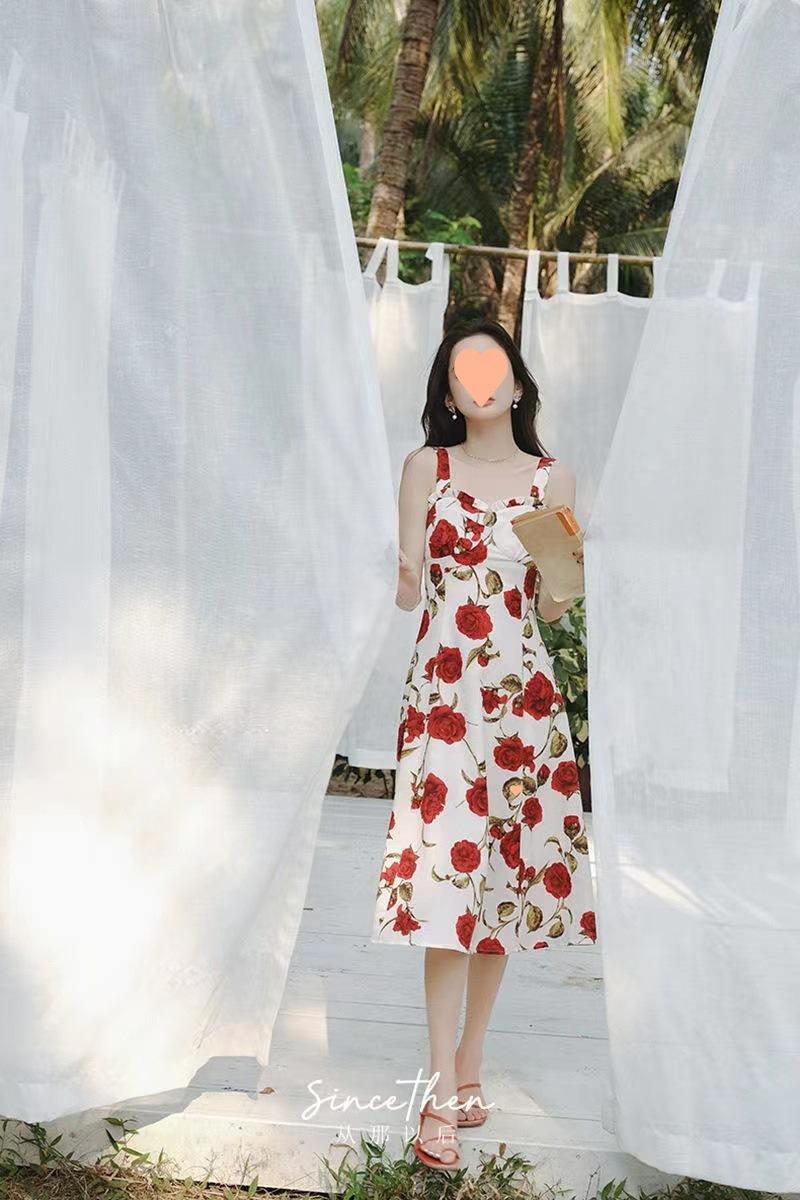 Vestido largo elegante de gasa con estampado floral estilo francés Hepburn con rosas rojas para mujer de verano
