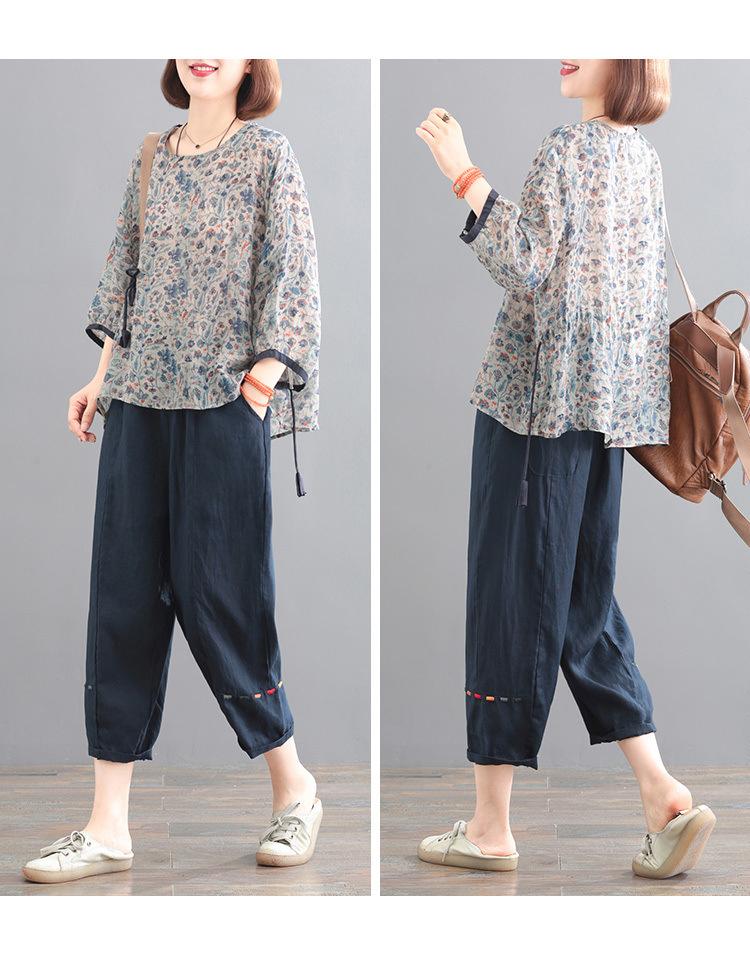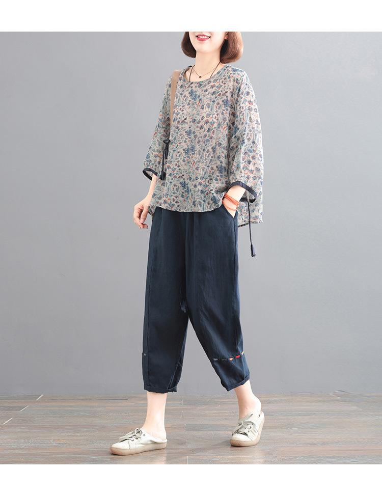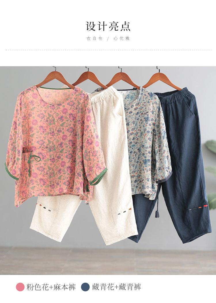Navy Blue Blossoms Top Navy Blue Pants, Pink Flower Top Linen Pants, Navy Blue Flower Single Top, Pink Flower ...