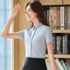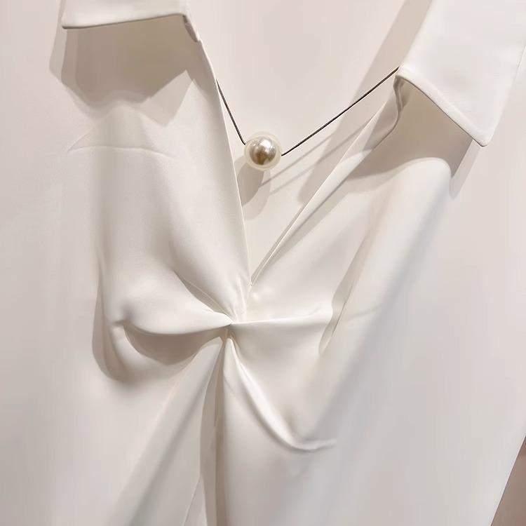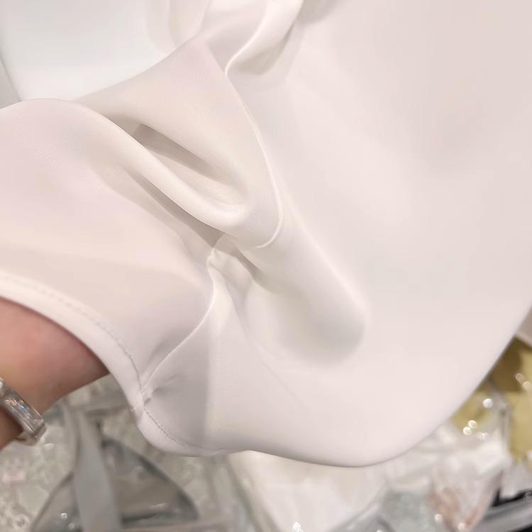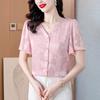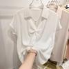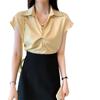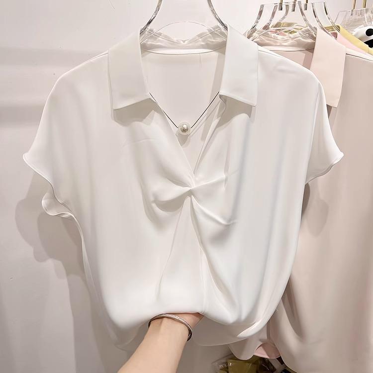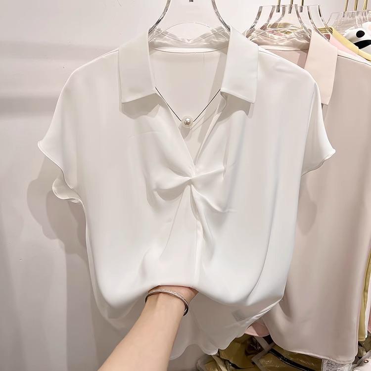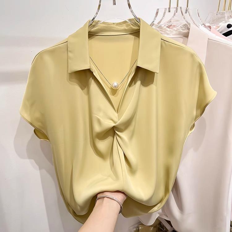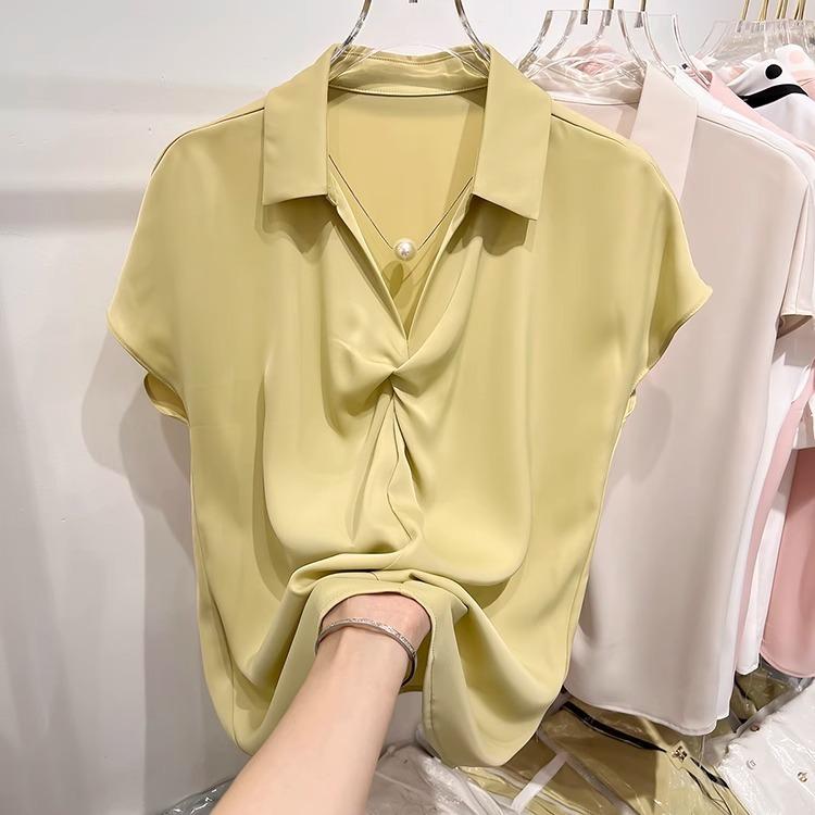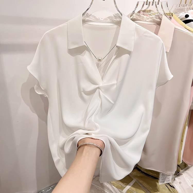 Camisa de gasa para mujer, verano 2023, nueva camisa europea, elegante, ajustada, cuello polo, plisada, color sólido, manga corta.