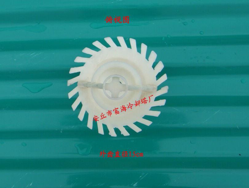 El dispositivo de salpicadura para torre de enfriamiento es una boquilla de triple salpicadura. Tiene un tipo de enchufe (con diámetros interiores de 43, 48, 60), un tipo roscado (con DN26, DN32, DN40, DN46, DN58) conectado a la tubería de distribución de agua, una interfaz en forma de botella y una boquilla cónica. Una placa de salpicadura grande, una placa de salpicadura pequeña y un cabezal de desviación de agua cónico con diámetros exteriores que disminuyen en secuencia están dispuestos coaxialmente a intervalos en la parte inferior de la boquilla cónica; y al menos dos varillas de conexión dispuestas verticalmente en una disposición circunferencial están fijadas en la interfaz en forma de botella tipo enchufe. Un orificio de fuga grande y un orificio de fuga pequeño están dispuestos respectivamente en la placa de salpicadura grande y la placa de salpicadura pequeña, que son coaxiales con la boquilla cónica y tienen diámetros interiores que disminuyen en secuencia en comparación con el diámetro interior de la abertura inferior de la boquilla cónica. La placa de salpicadura grande y la placa de salpicadura pequeña son hemisféricas con la superficie arqueada hacia arriba, y el cabezal de desviación de agua cónico es un cono con el ángulo del cono hacia arriba.