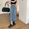 Falda azul vintage otoño 2024 nueva moda de cintura alta de mezclilla dividida en forma de A falda de longitud media para mujer de moda