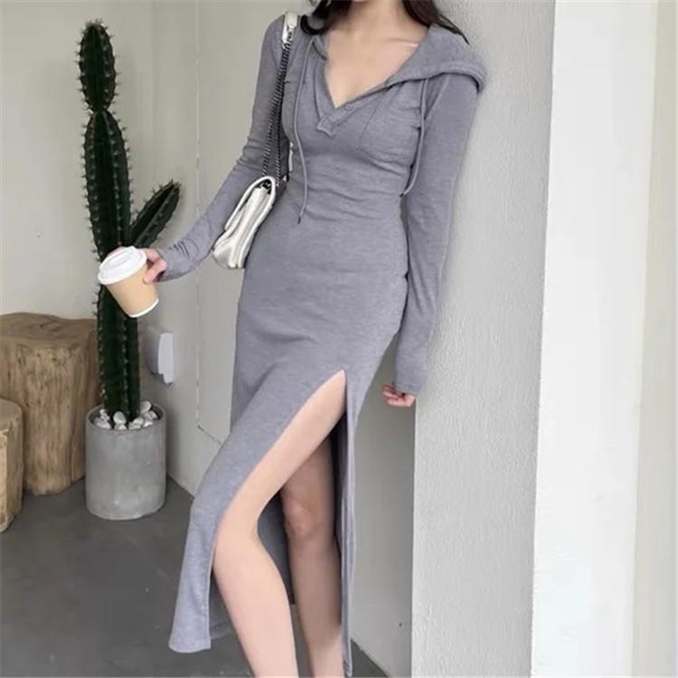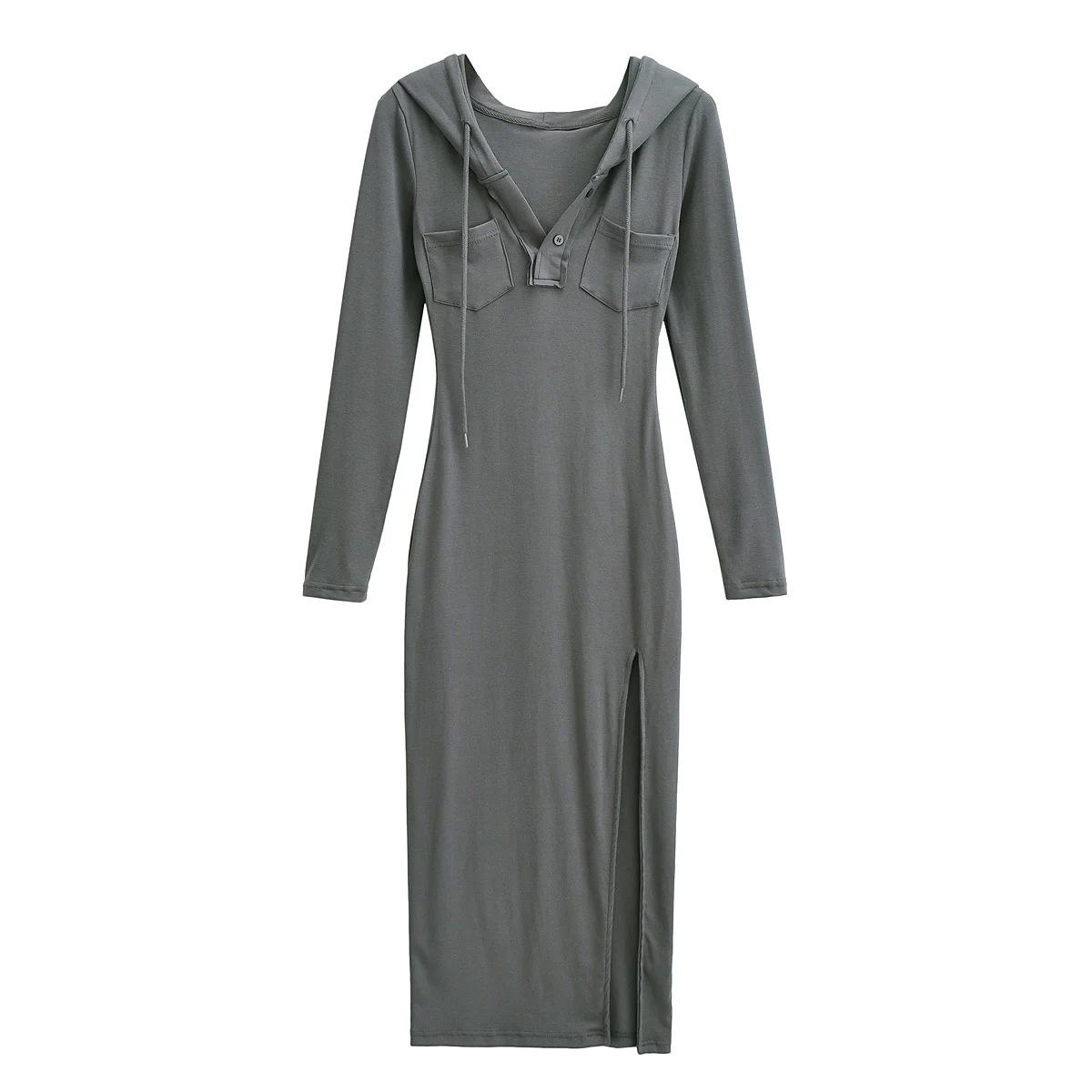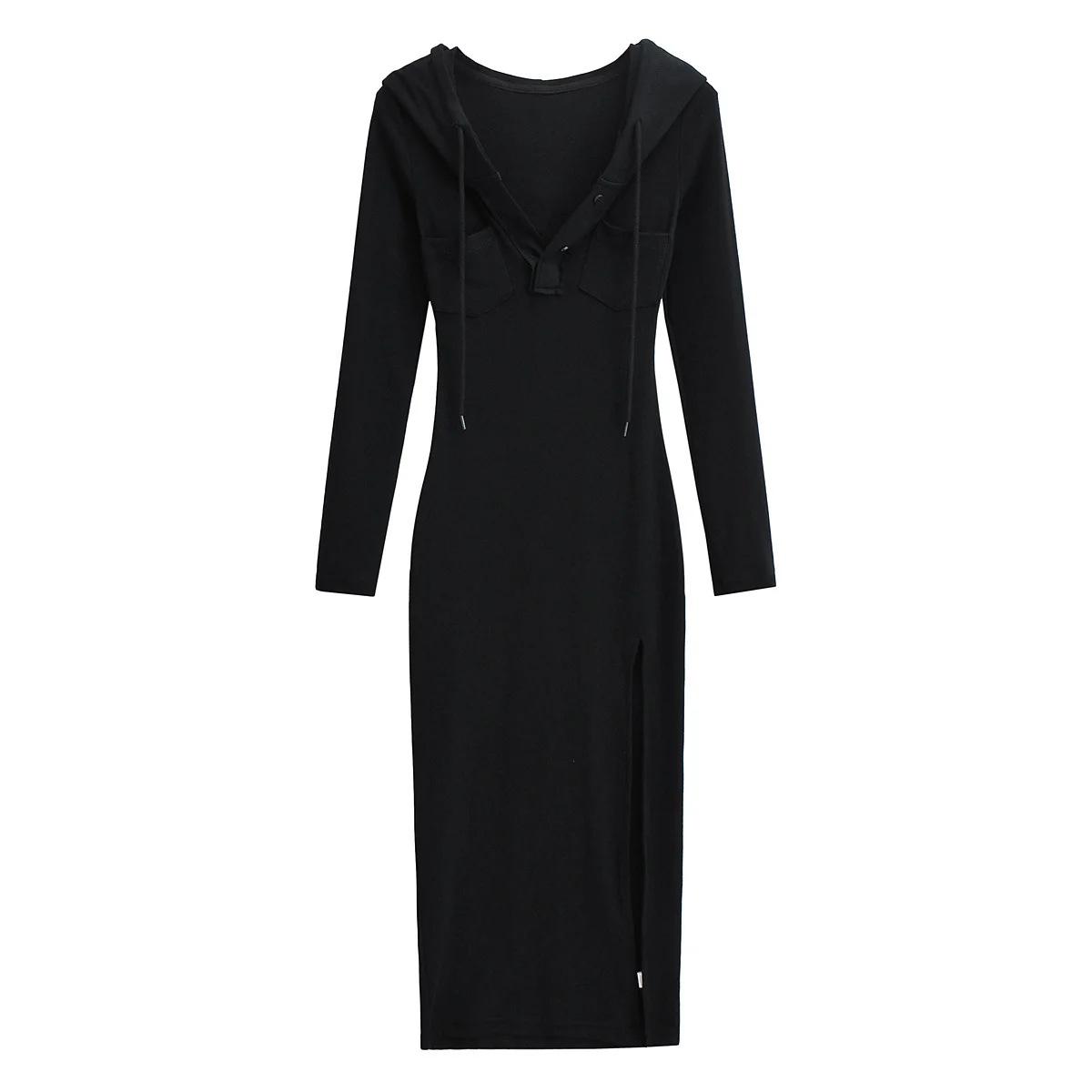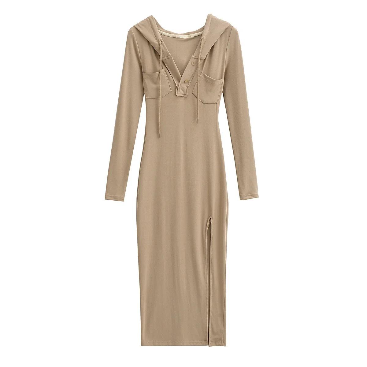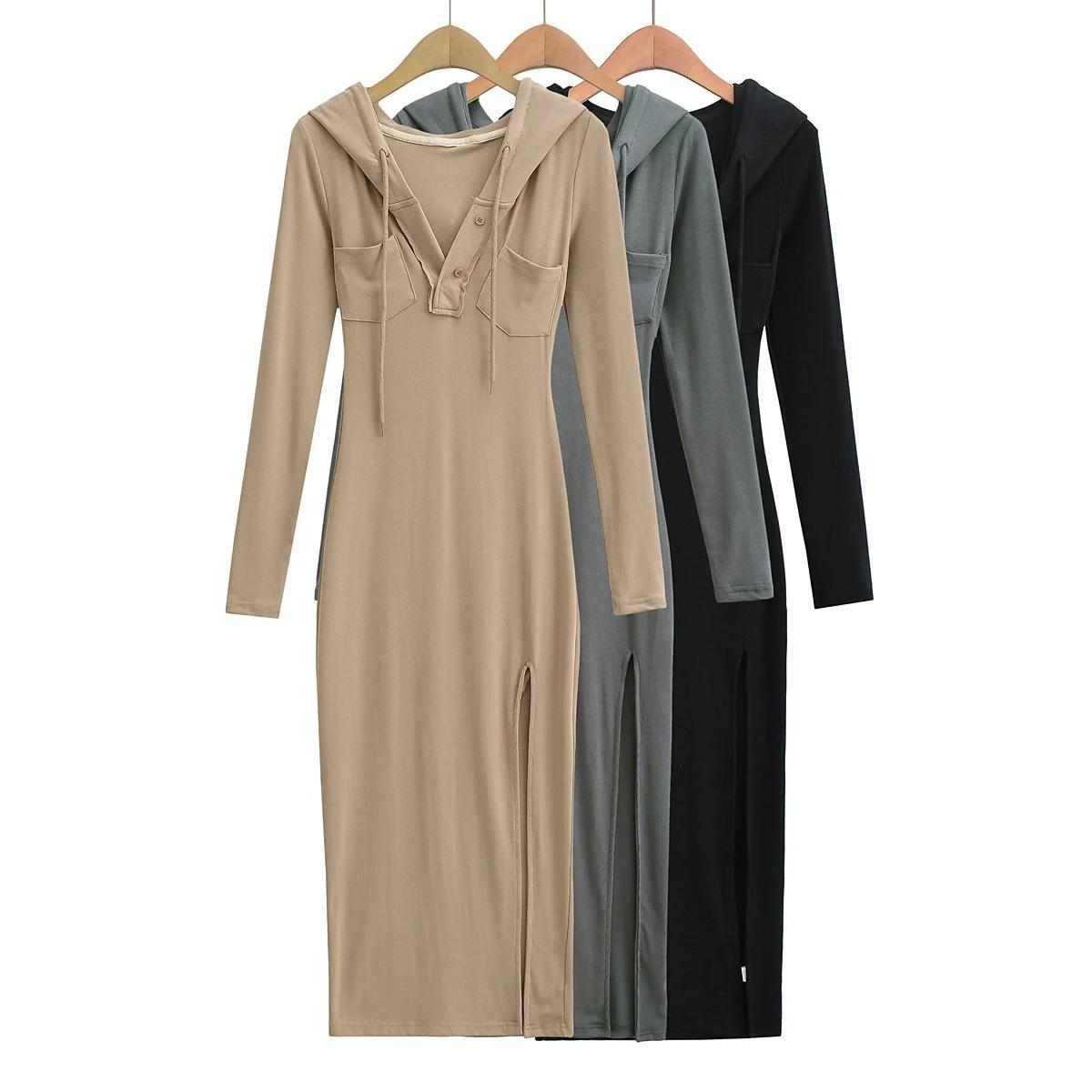 Vestido tubo de cintura alta con capucha, escote en V, dos botones y pierna larga, sexy, para mujer, con abertura lateral