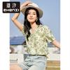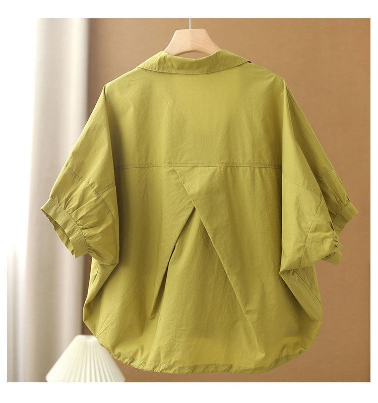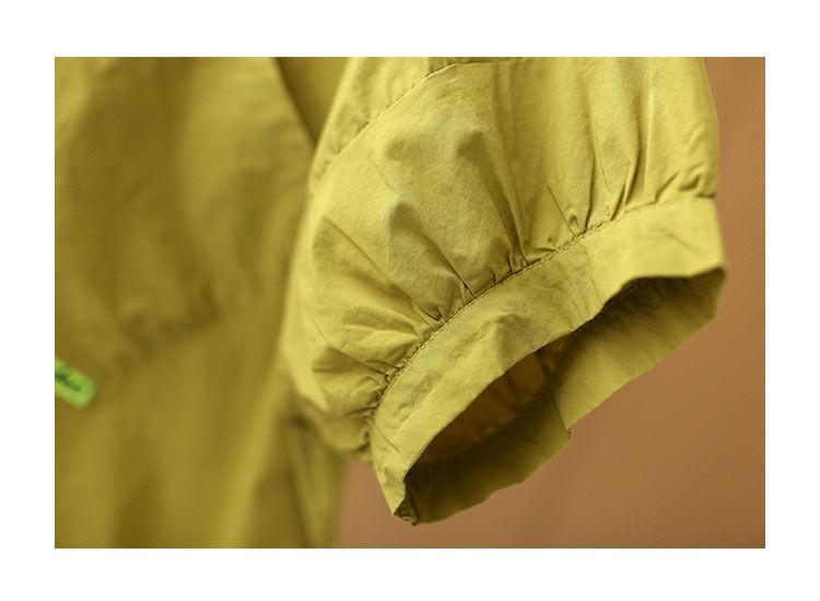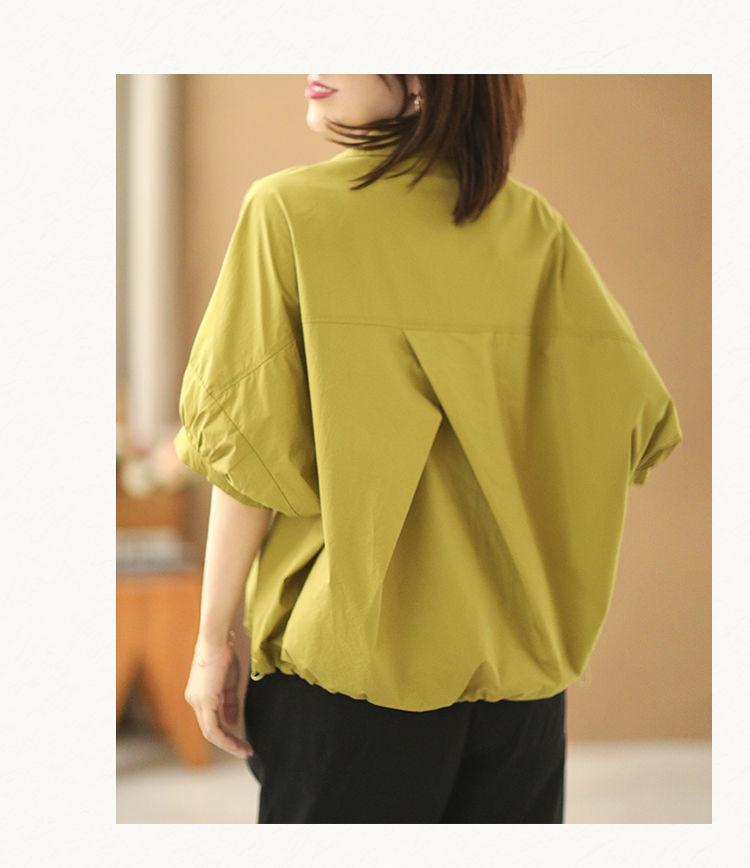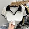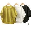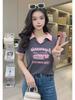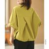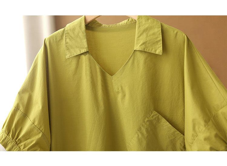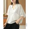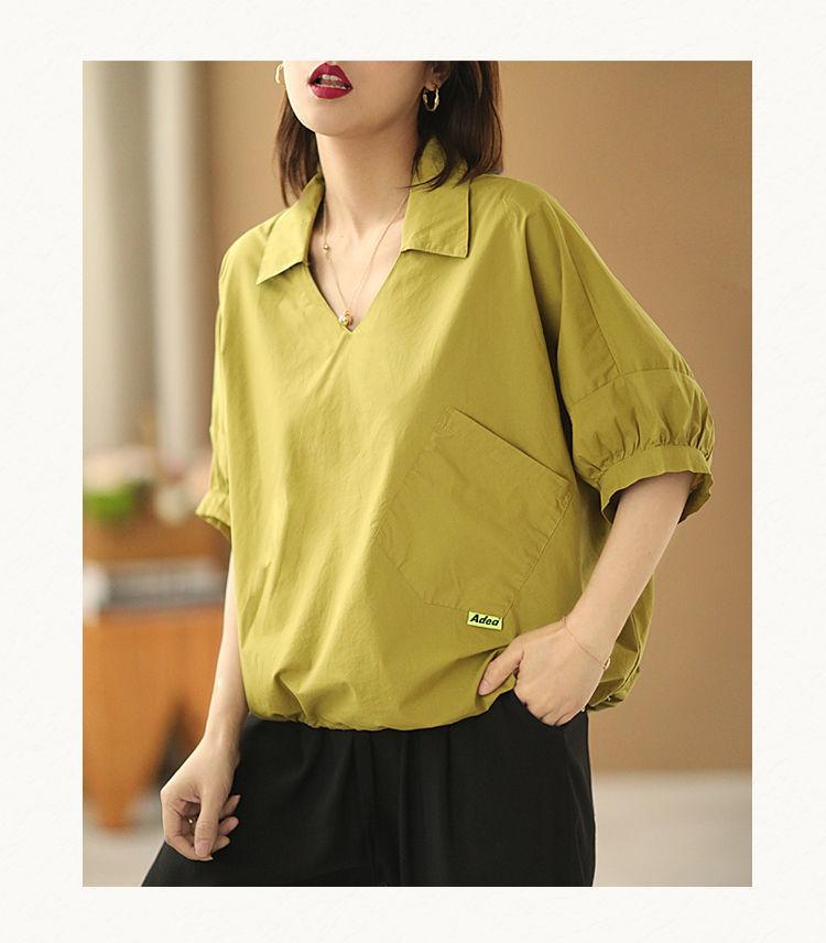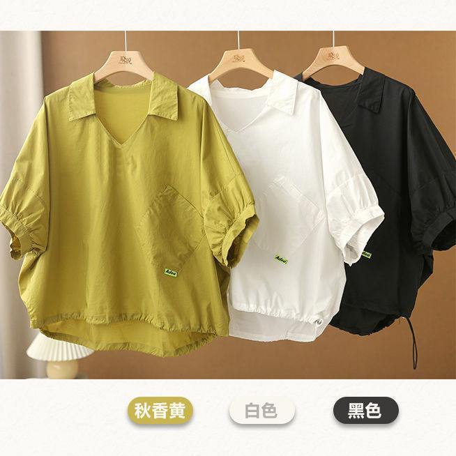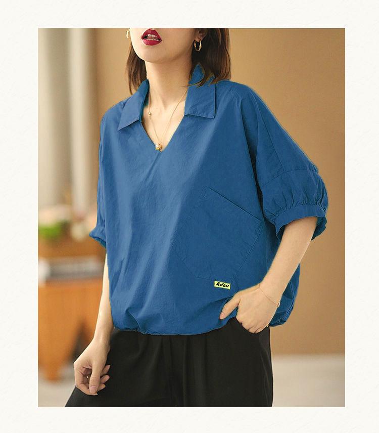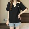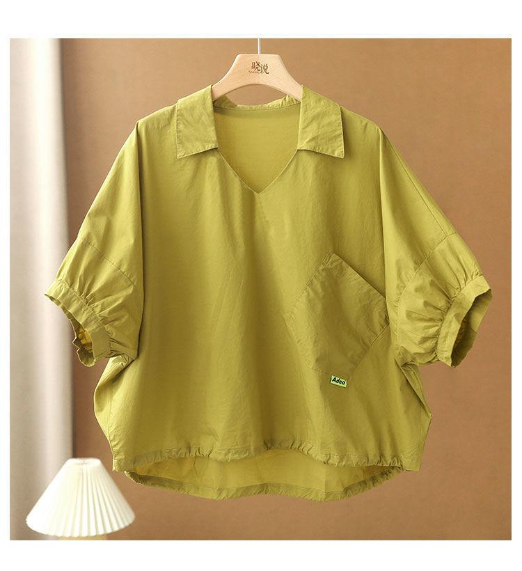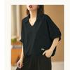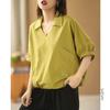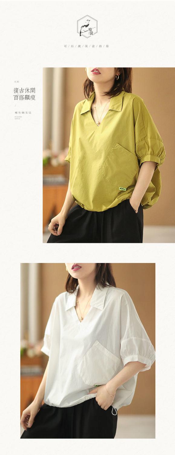 Camisa estilo jersey holgada de manga corta con cuello en V, estilo retro, informal, estilo estación europea, para mujer, con un diseño único y moderno.