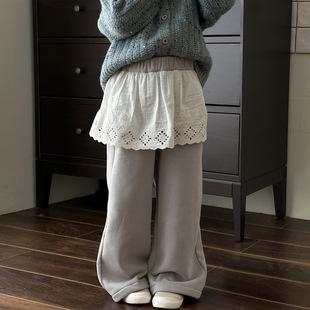 Pantalones deportivos rectos para niñas, falda de capas de encaje bordado de dos piezas, pantalones para niñas de talla mediana y grande, pantalones casuales de polar de una pieza que combinan con todo. |
