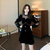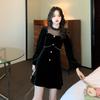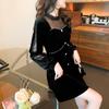 Vestido negro reductor de edad con cuello redondo, costuras de malla, lazo de perla y terciopelo dorado.