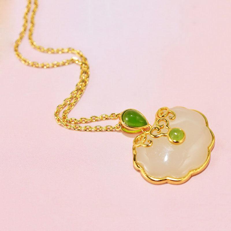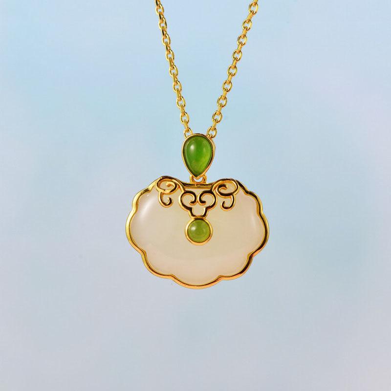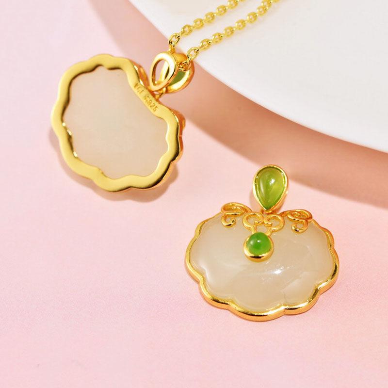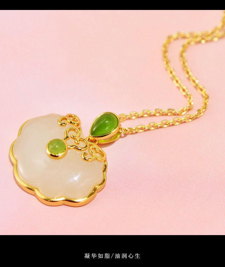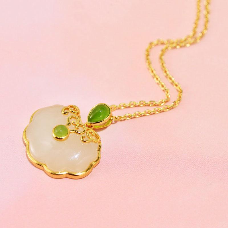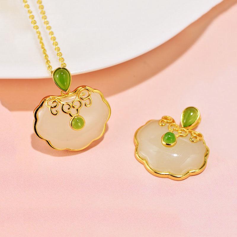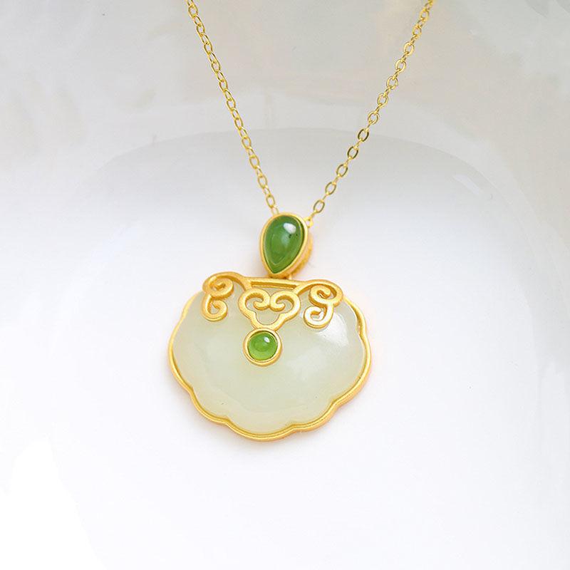 Colgante de cadena de clavícula con jade hetiano de plata S925, colgante de estilo antiguo, elegante colgante de cerradura de longevidad, joyería para mujer