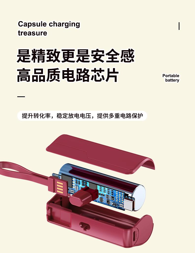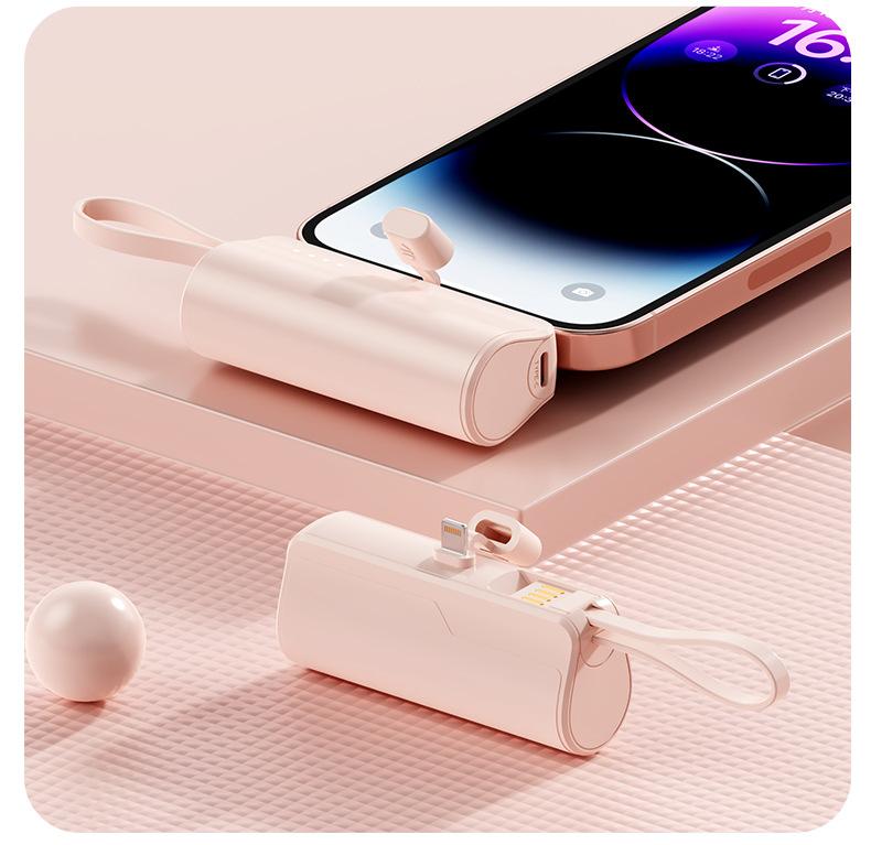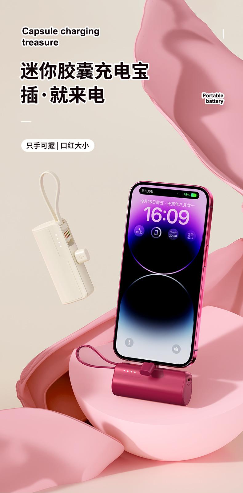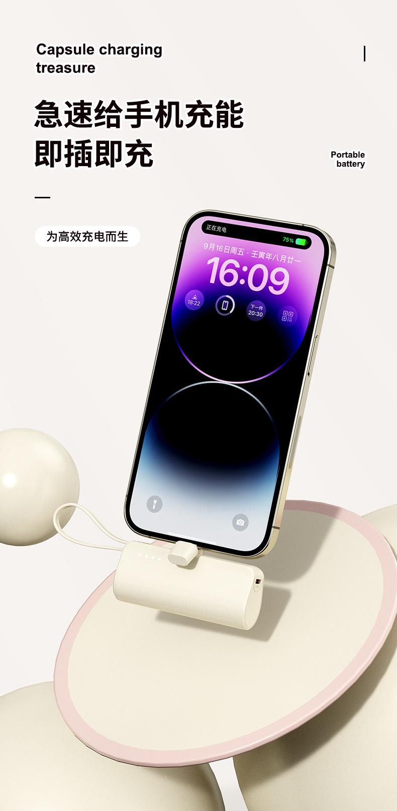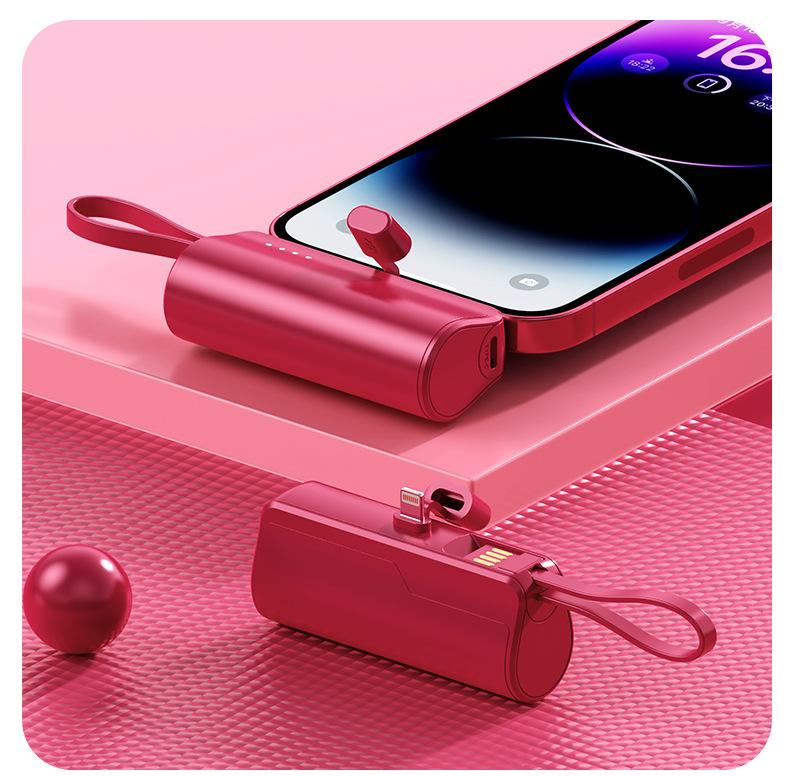 Mini Batería Externa Portátil de Bolsillo de 5000 mAh con Cable Integrado, Fuente de Alimentación Móvil Compacta con Forma de Cápsula con Impresión de Logotipo y Carga Rápida