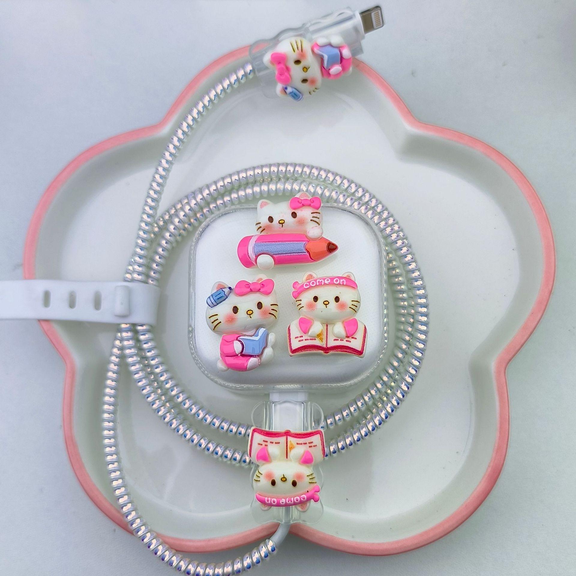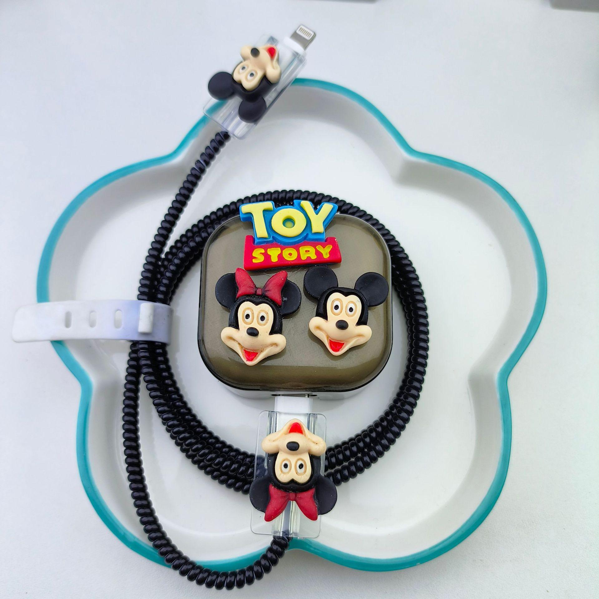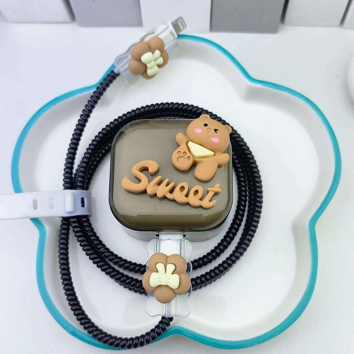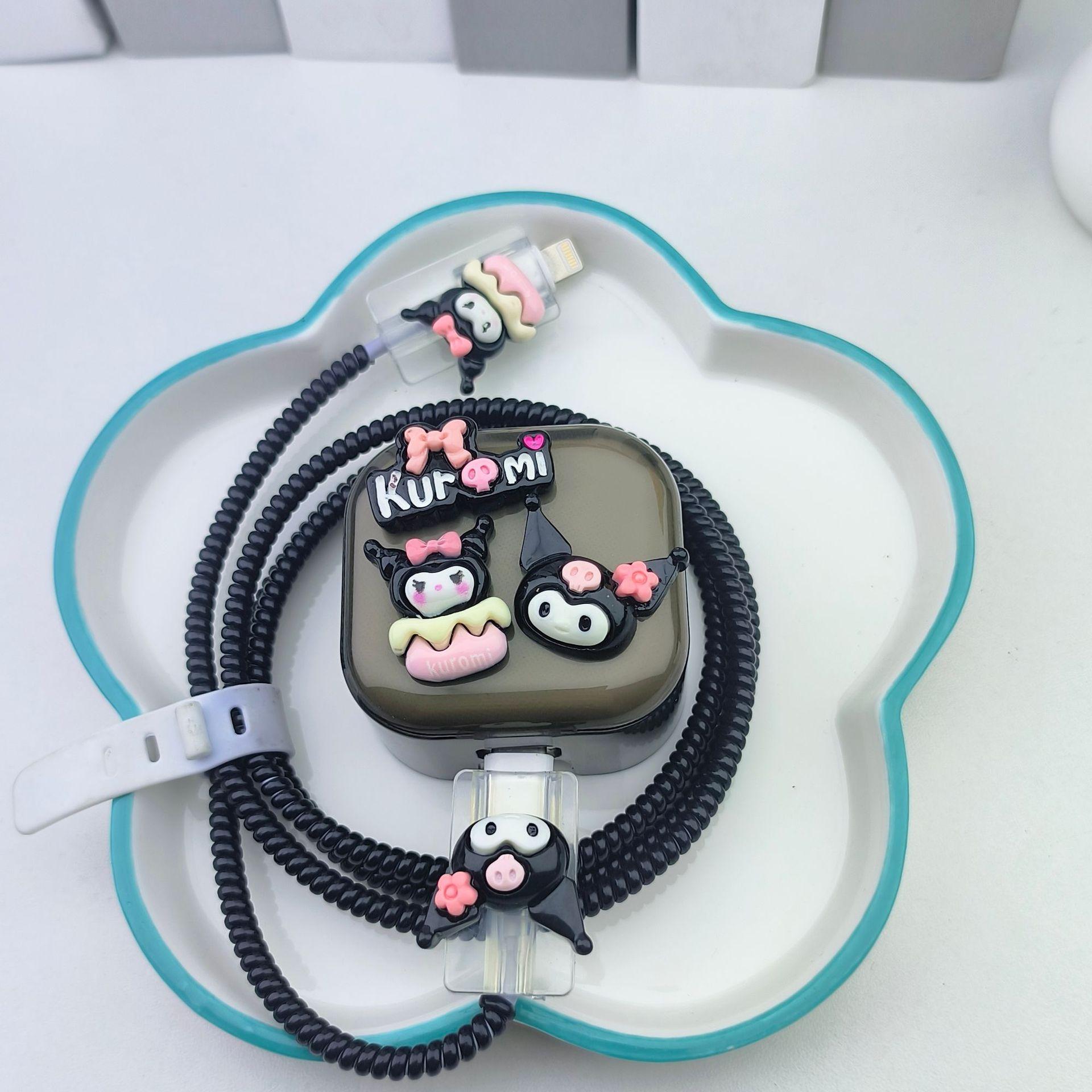Funda protectora para cargador británico Apple de 20 W con cara de gato negra para iPhone 15, cable de datos, cable enrollable, cable mordedor.