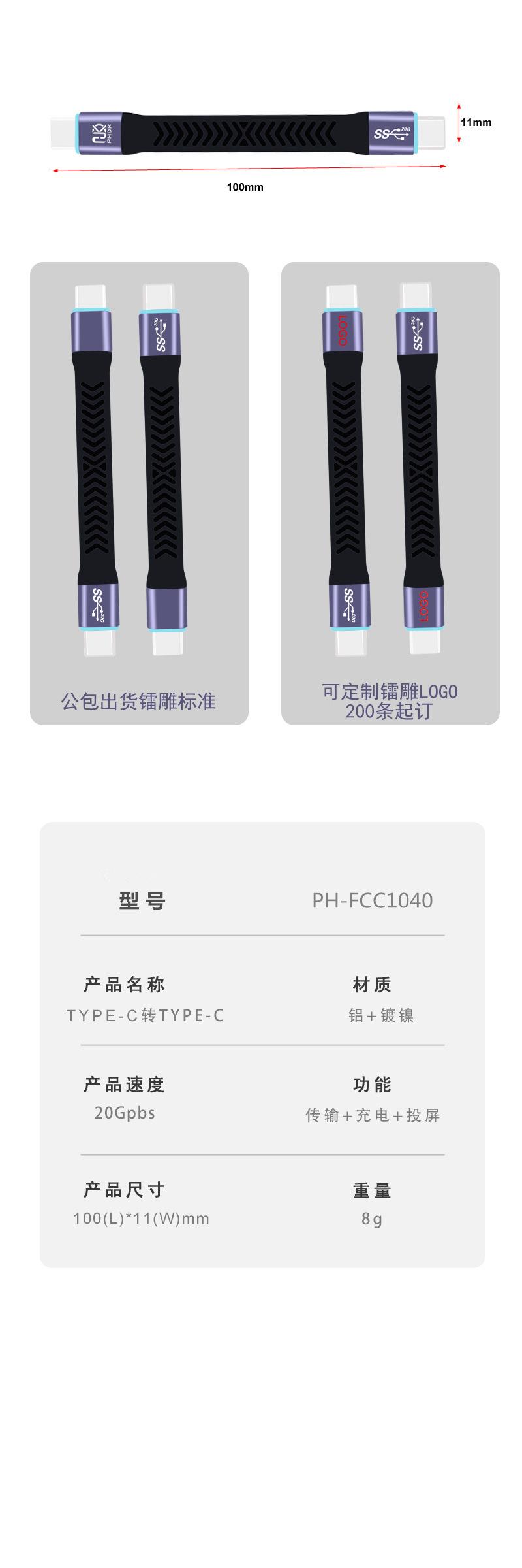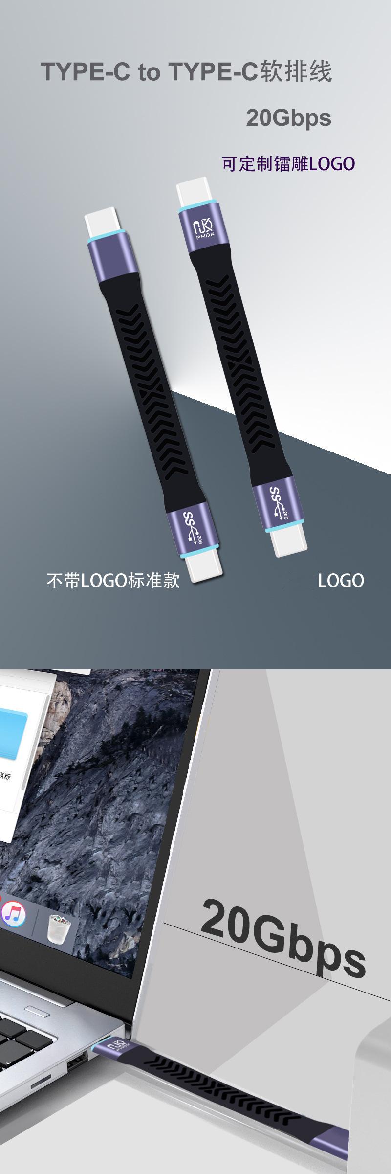 Cable de datos tipo C USB 3.2 Gen2 macho a macho, cable de placa corta, suave y plano, cable suave de carga rápida de alta velocidad de 20 G.