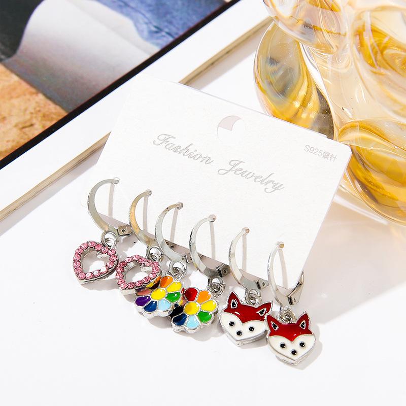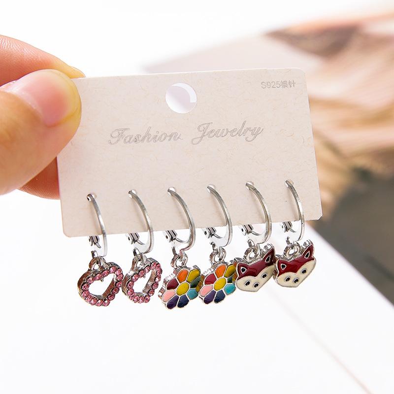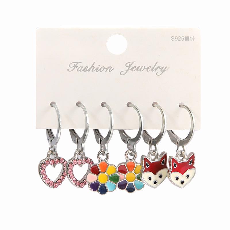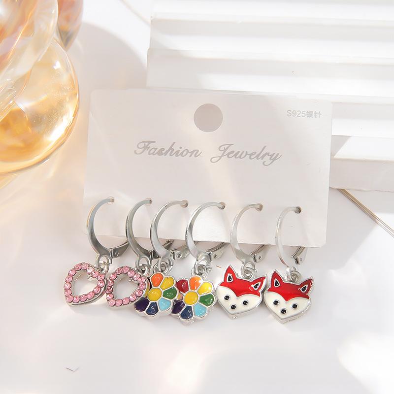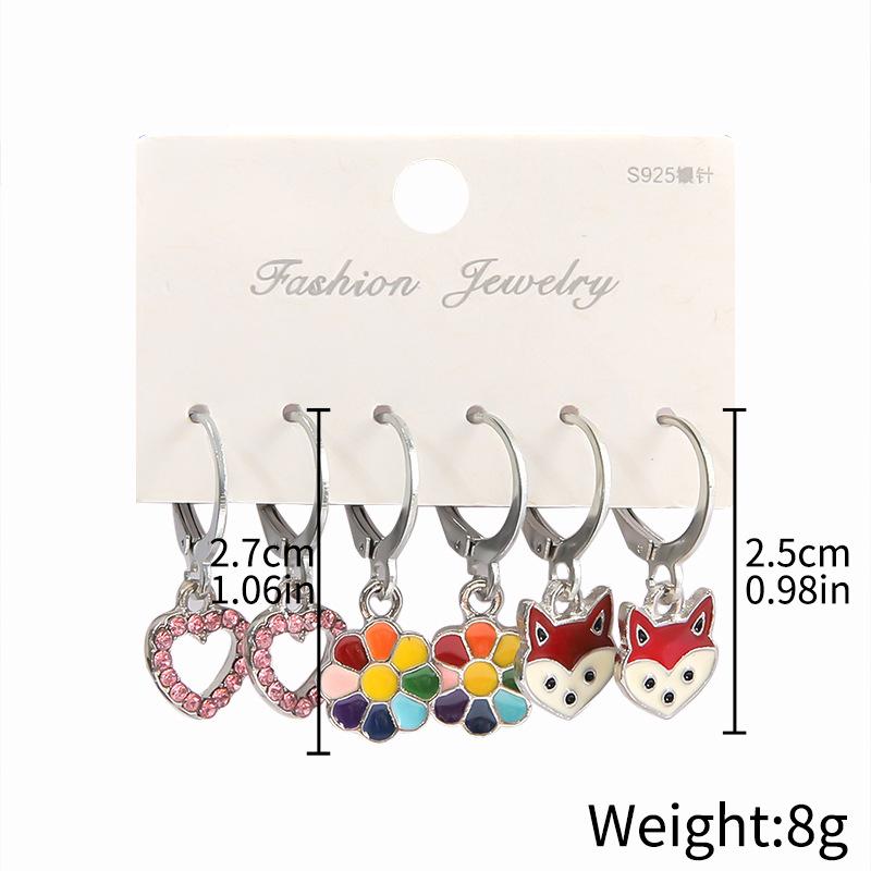 Conjunto de 3 pendientes de aleación con diseño de flor de animal y hebilla de oreja de viento, estilo europeo y americano, pequeños y frescos, que gotean aceite, se adaptan al suministro transfronterizo.