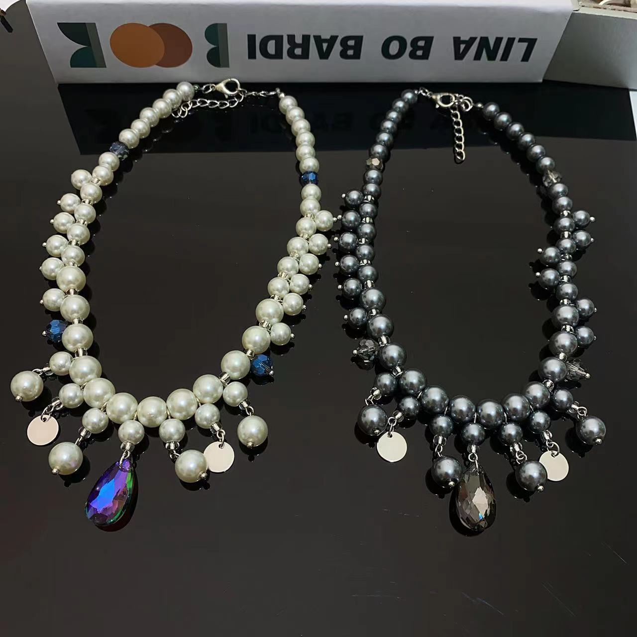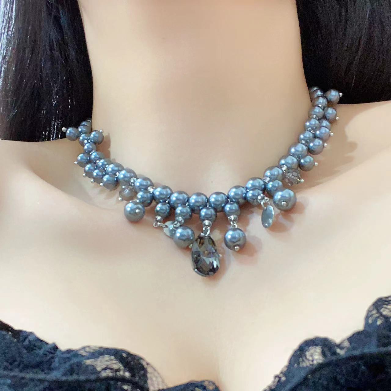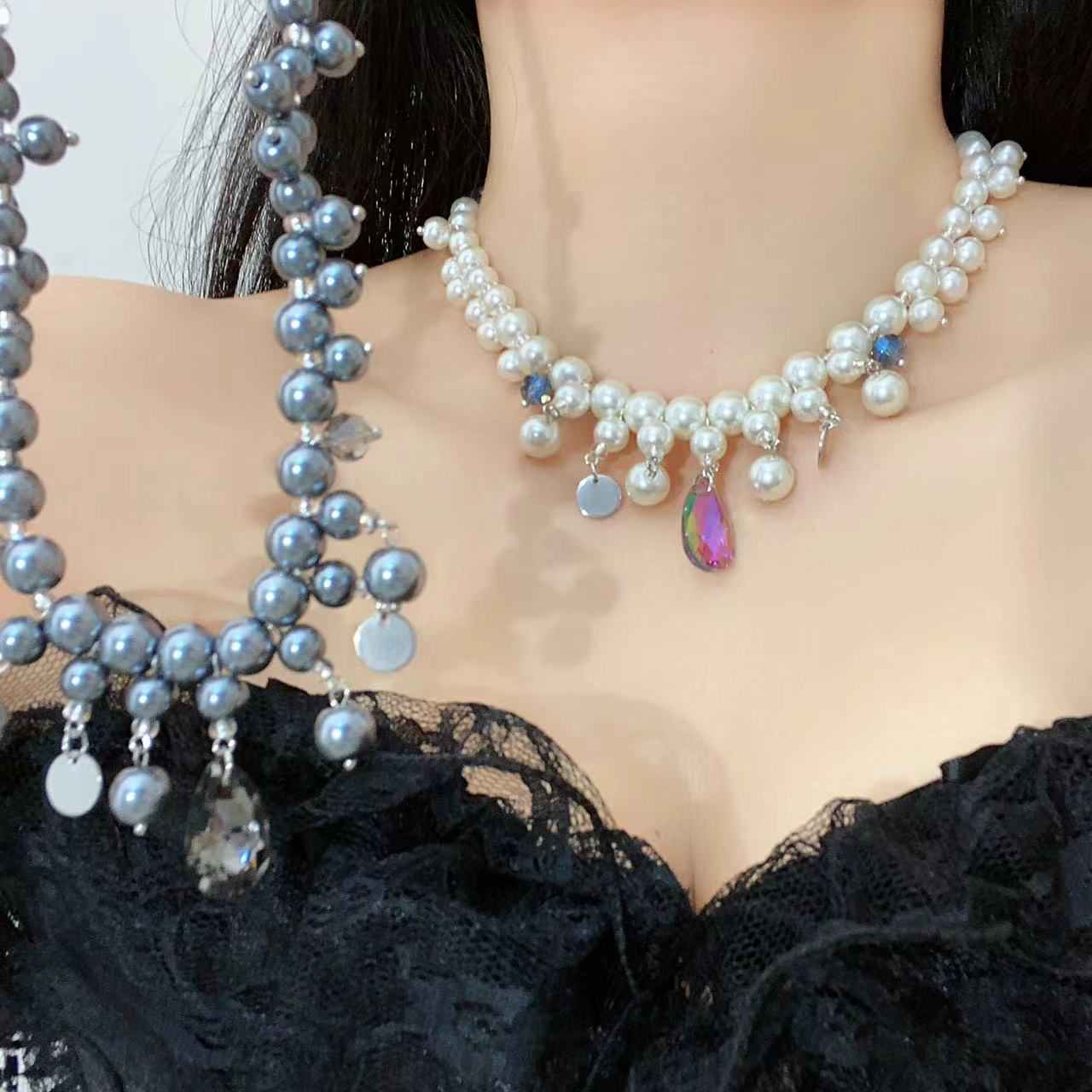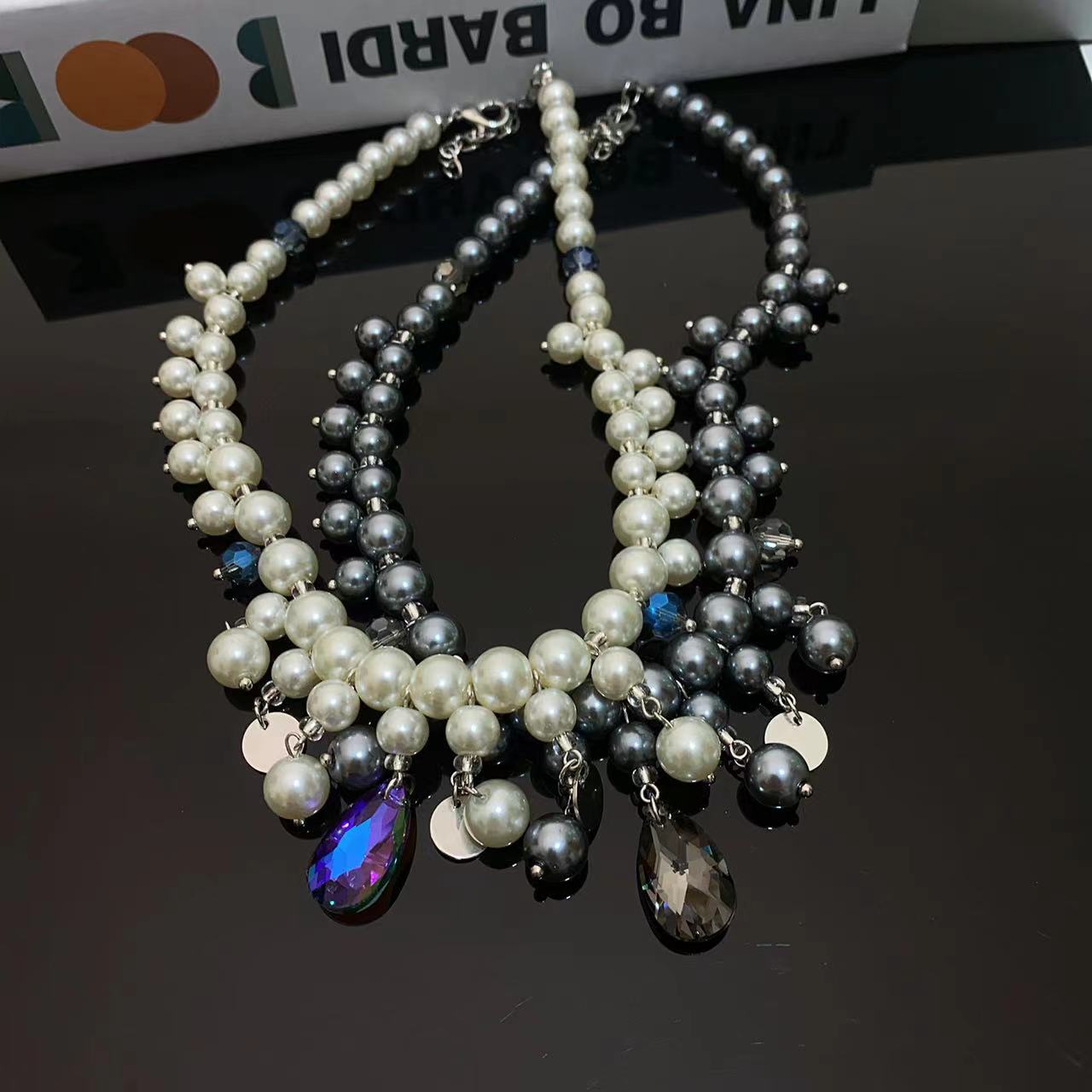 Collar con borlas de perlas y circonitas azules con incrustaciones de diamantes para mujer, cadena de clavícula con forma de gota de agua, cadena de suéter de lujo de estilo palacio vintage de alta calidad