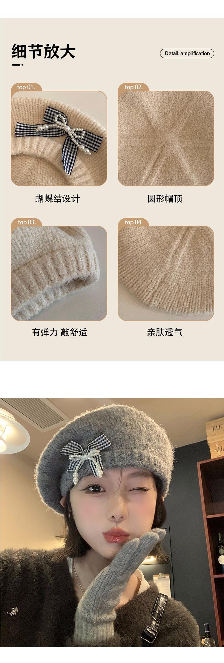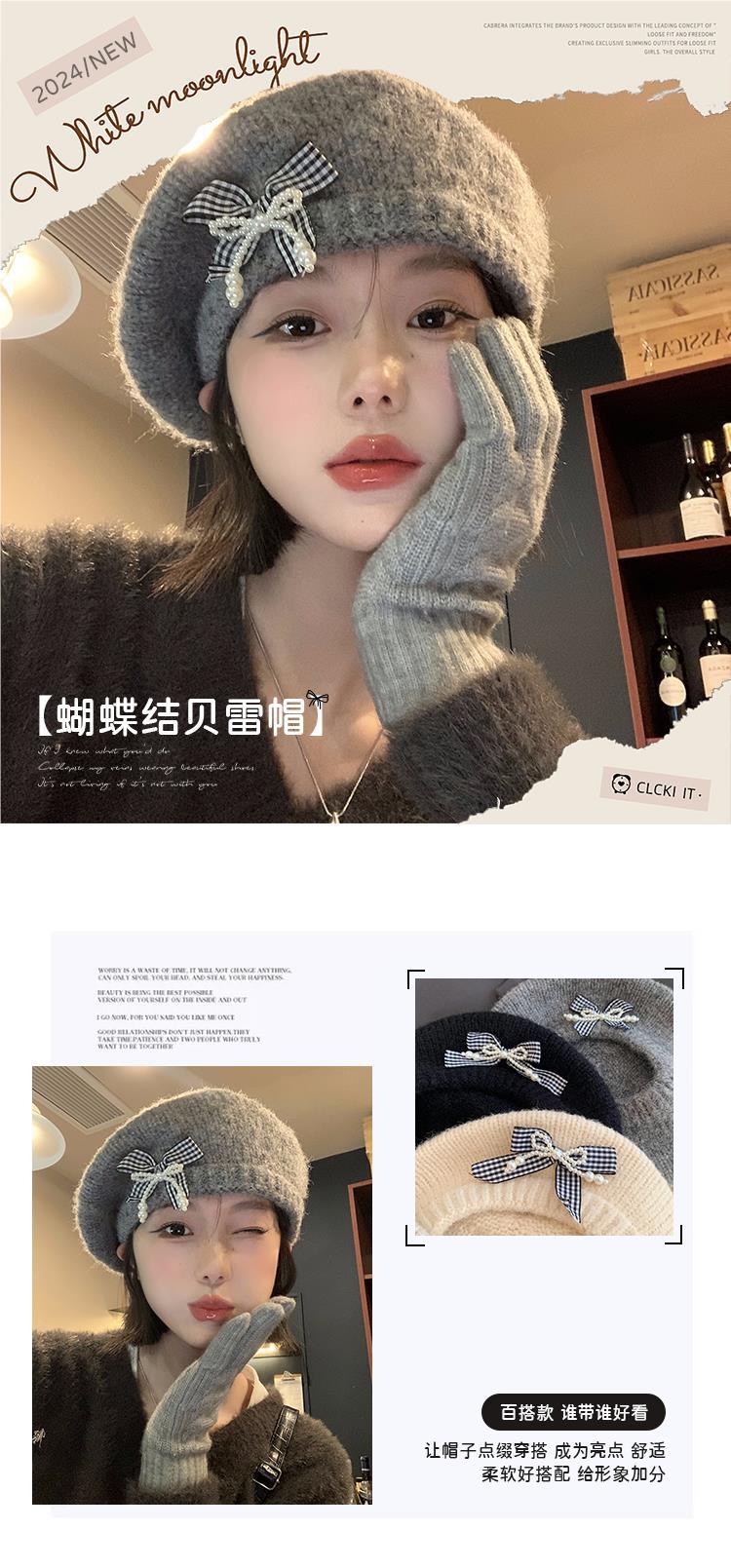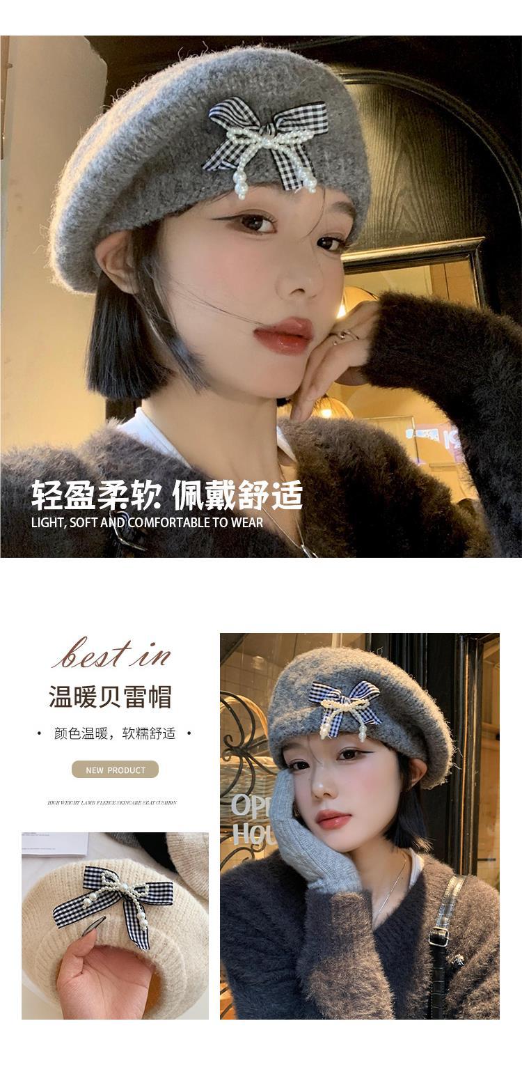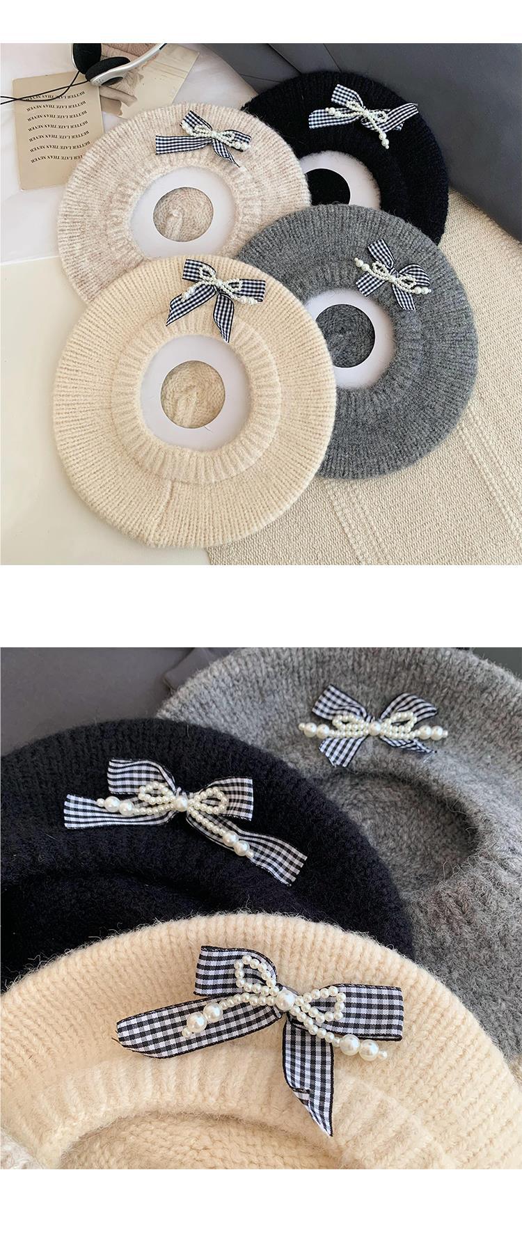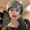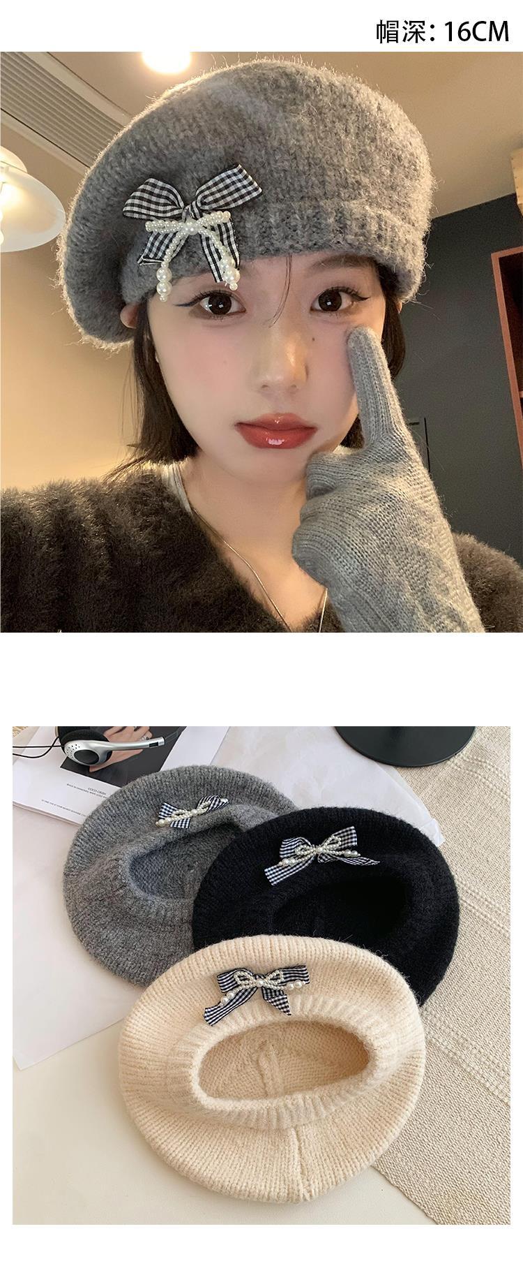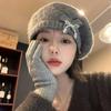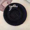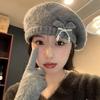 Boina de pintor con lazo gris para mujer, cálida, de punto y felpa, para otoño e invierno, con gran circunferencia de cabeza y versátil.
