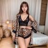Pijama sexy para mujer, primavera y otoño, bata de manga larga, tirantes de seda helada, pantalones cortos de encaje, conjunto de tres piezas, ropa fina para el hogar, traje